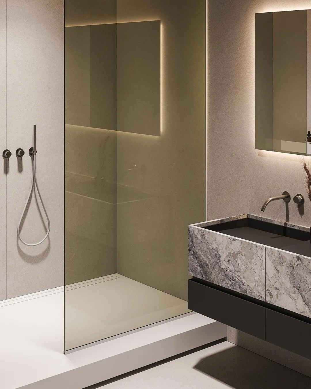卫浴空间的设计同样精致实用。淋浴间加入一抹绿色与全屋风格形成呼应,石材打造的洗手台简约大气;线条灯的运用不仅满足了空间照明需求,更通过光影效果衬托出空间的轻奢质感,让日常洗漱场景也尽显精致,为居家生活增添仪式感。
