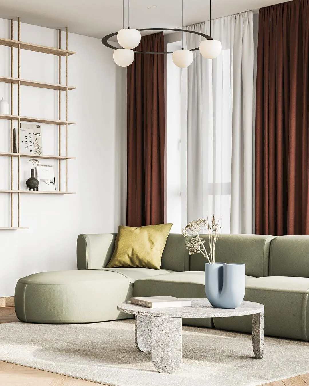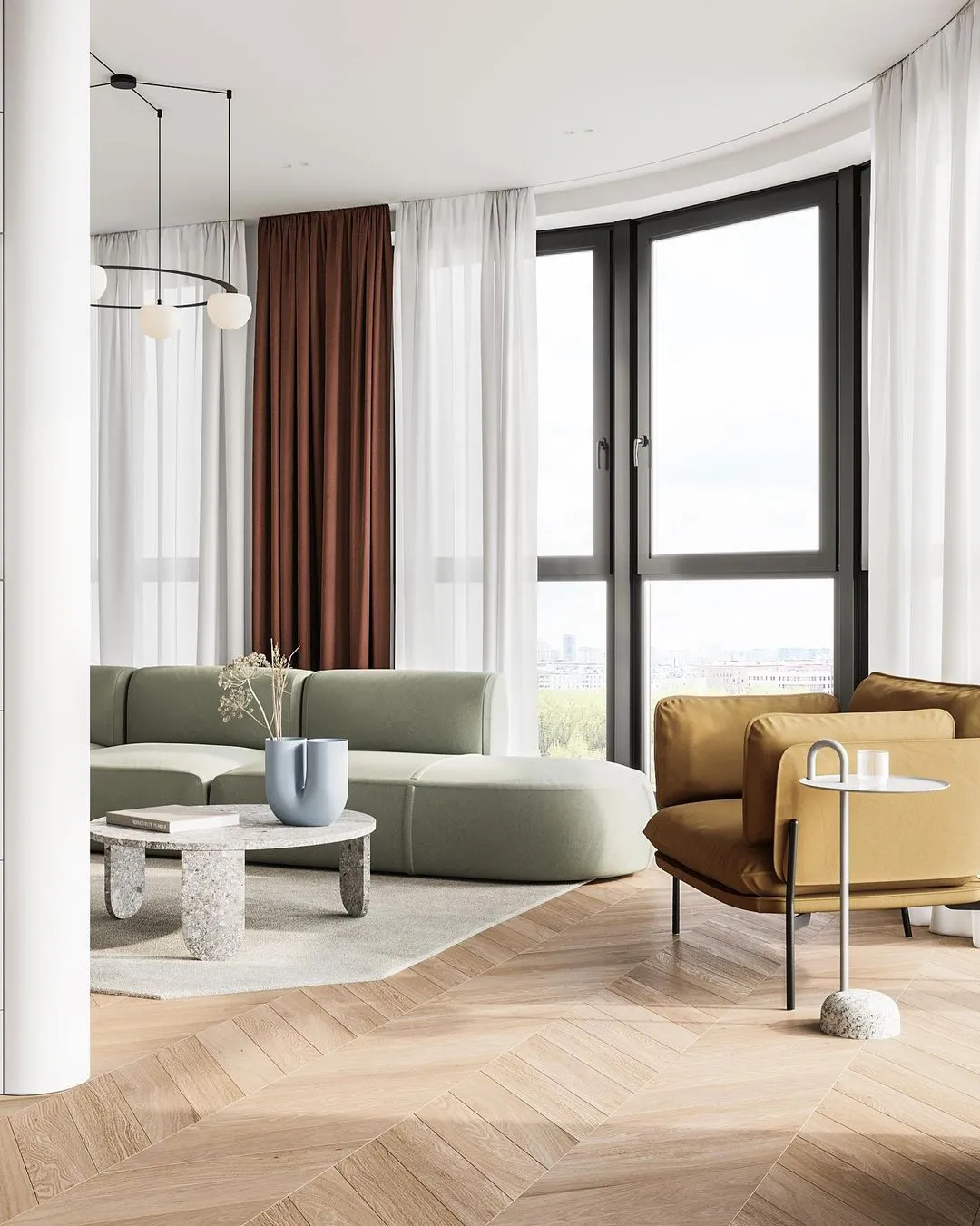 客厅作为家庭核心活动区,以浅色调为基底,搭配浅绿色沙发,营造出清爽协调的视觉感受。大面积落地窗引入充足自然采光,白色纱帘轻柔过滤光线,让空间更显柔和通透。设计团队巧妙融入土黄、棕红等点缀色调,虽元素种类简洁,却让色彩层次愈发丰富,完美诠释了“简约而不简单”的设计内涵,为家人的日常互动与休闲时光奠定舒适基调。