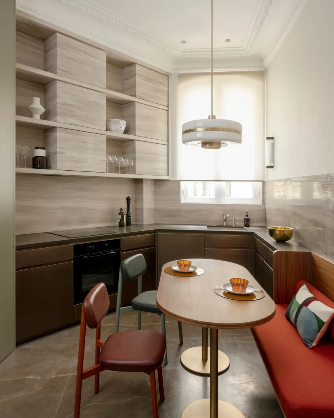 厨房区域采用极具视觉张力的艳丽色彩,点缀古董元素勾勒出70年代的复古家具氛围。设计师以独特视角重新诠释“复古”,将现代时尚内核注入经典框架,让厨房在怀旧质感中焕发鲜活活力。