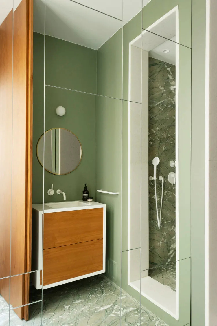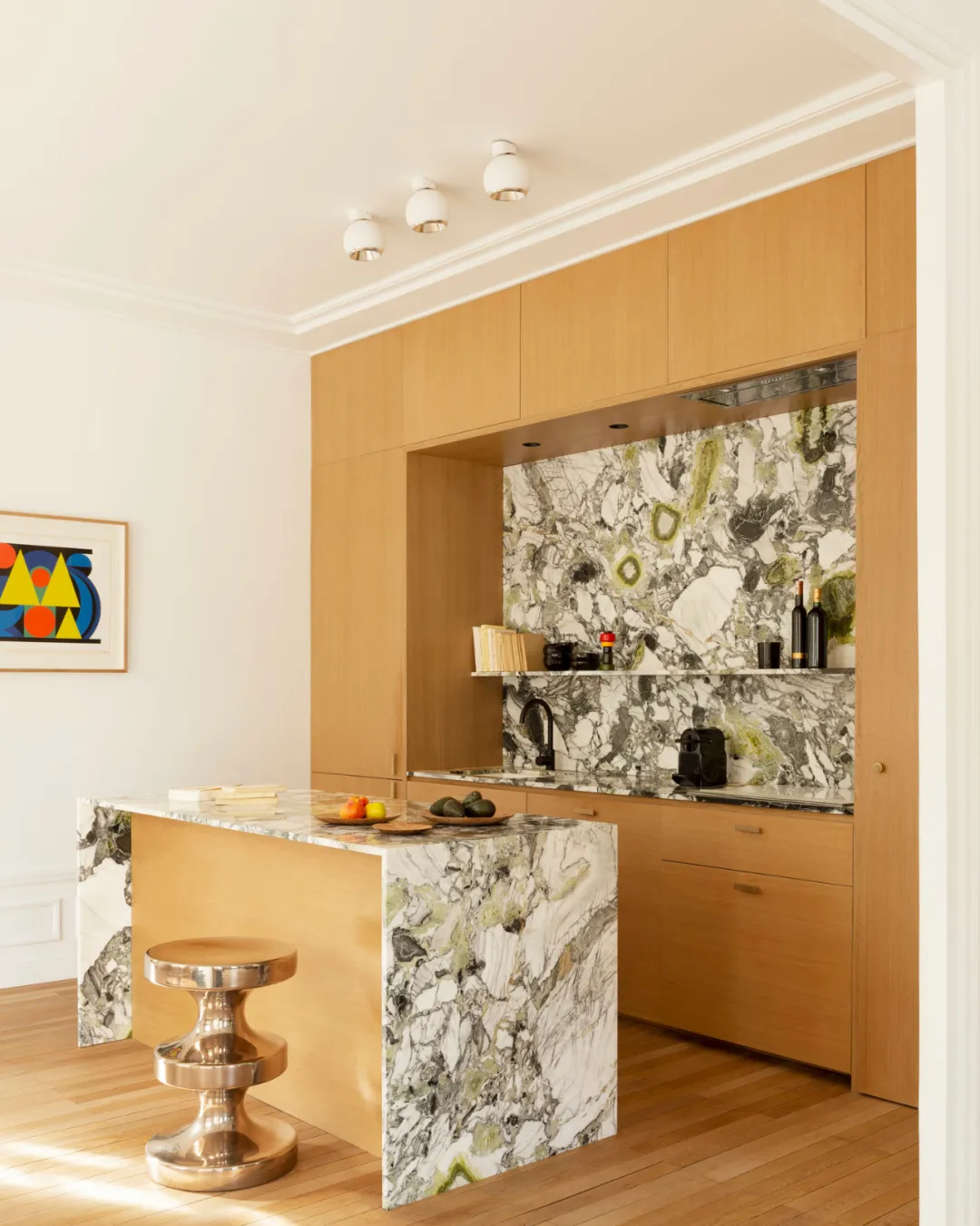 为打破经典风格的刻板印象,设计师特意选用带有鲜明色彩与纹理的大理石材质,通过灵动有趣的图案,为空间赋予多样化的时尚面貌。在空间的各个维度,五彩斑斓的色彩被巧妙运用,重塑传统样式,彻底告别乏味,让每一处都独具个性。