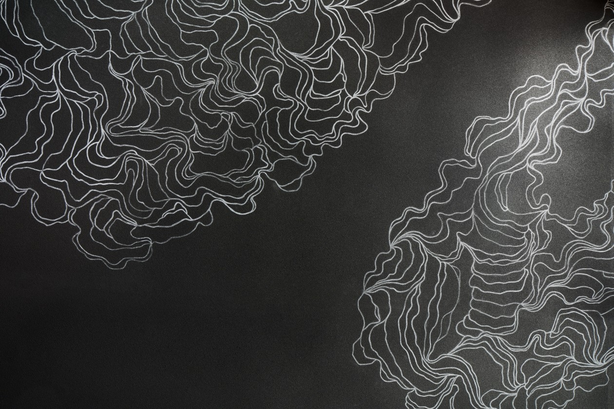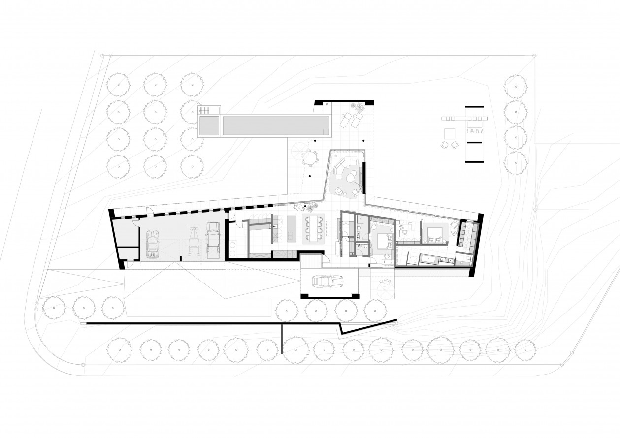 突出的休息区设计延伸至景观深处,模糊了室内外的界限;统一的材料语言与带有精美图形网络的黑色天花板,进一步整合空间。大幅面平面设计从休息室贯穿至带顶棚泳池区与室外火坑(与主空间稍作分隔),生动灵动的线条与玻璃幕墙的严谨几何形态、泳池建筑的简洁感形成有意对比,丰富空间层次。