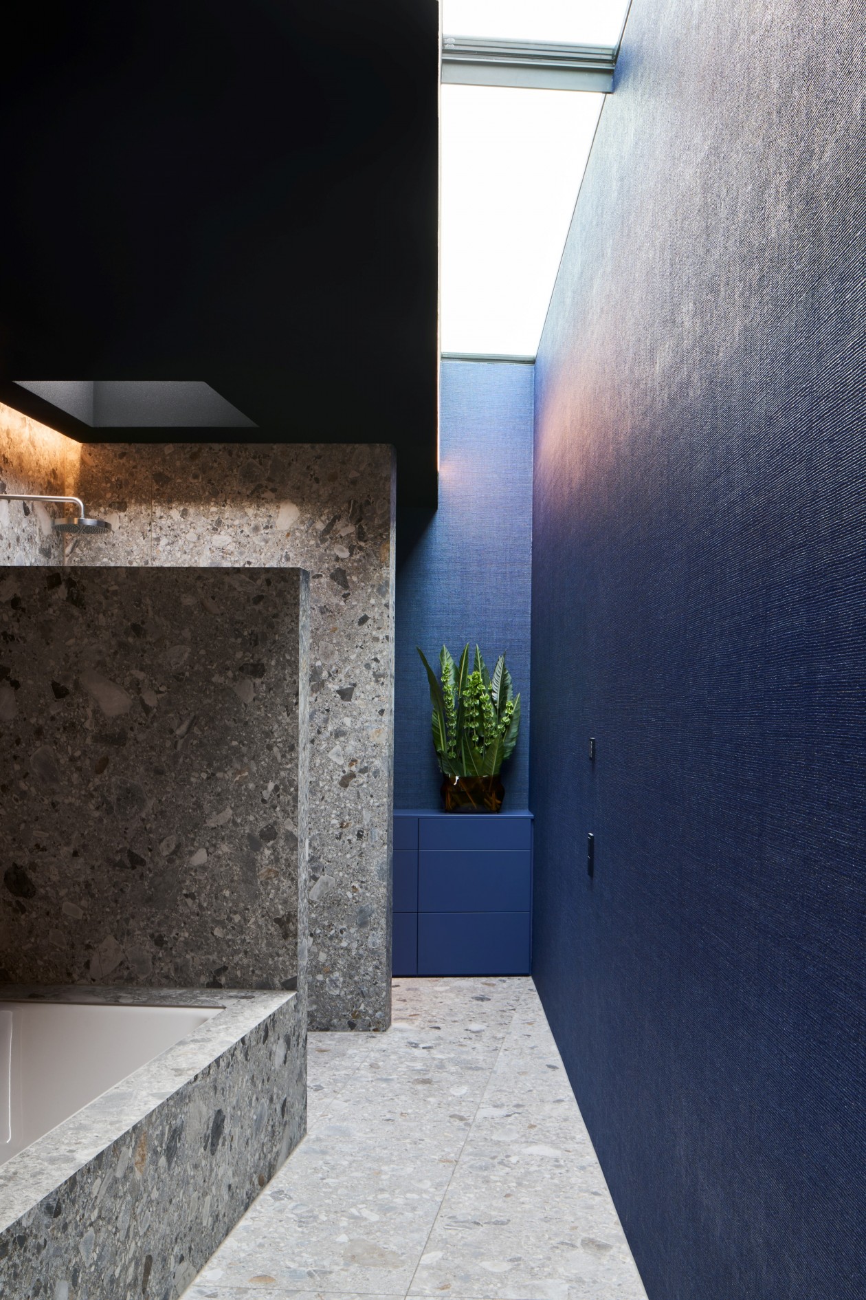 最终室内采用开放式布局,实现住宅各区域的统一,以及室内外空间的无缝衔接,黑色天花板奠定了大胆、对比鲜明的整体基调。雕塑物品凭借自身色彩、形态与材质,形成独特空间标识,同时与整体设计和谐呼应;不同纹理(光面、哑光、柔软吸水)的材料与日光、人造光相互作用,不断重塑空间感知,引导视觉焦点。