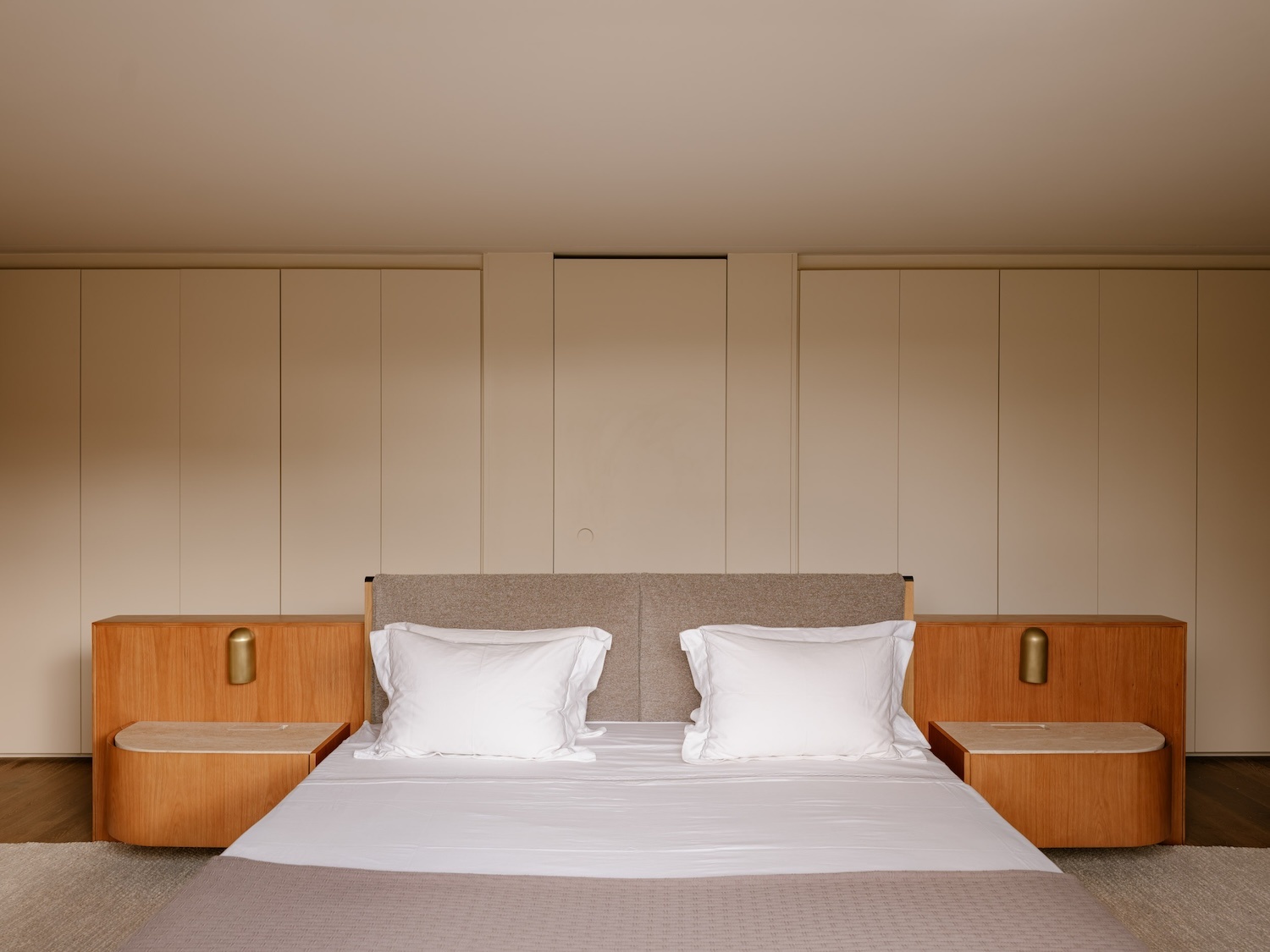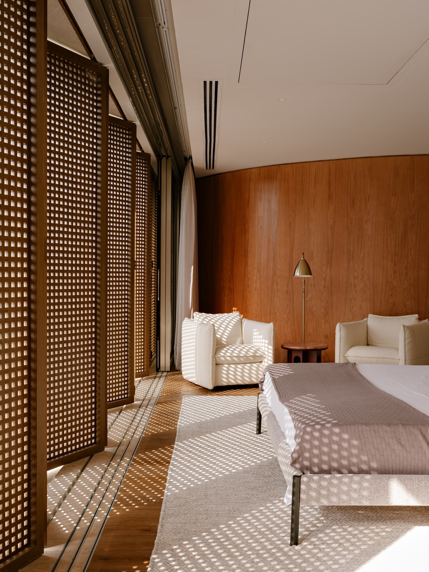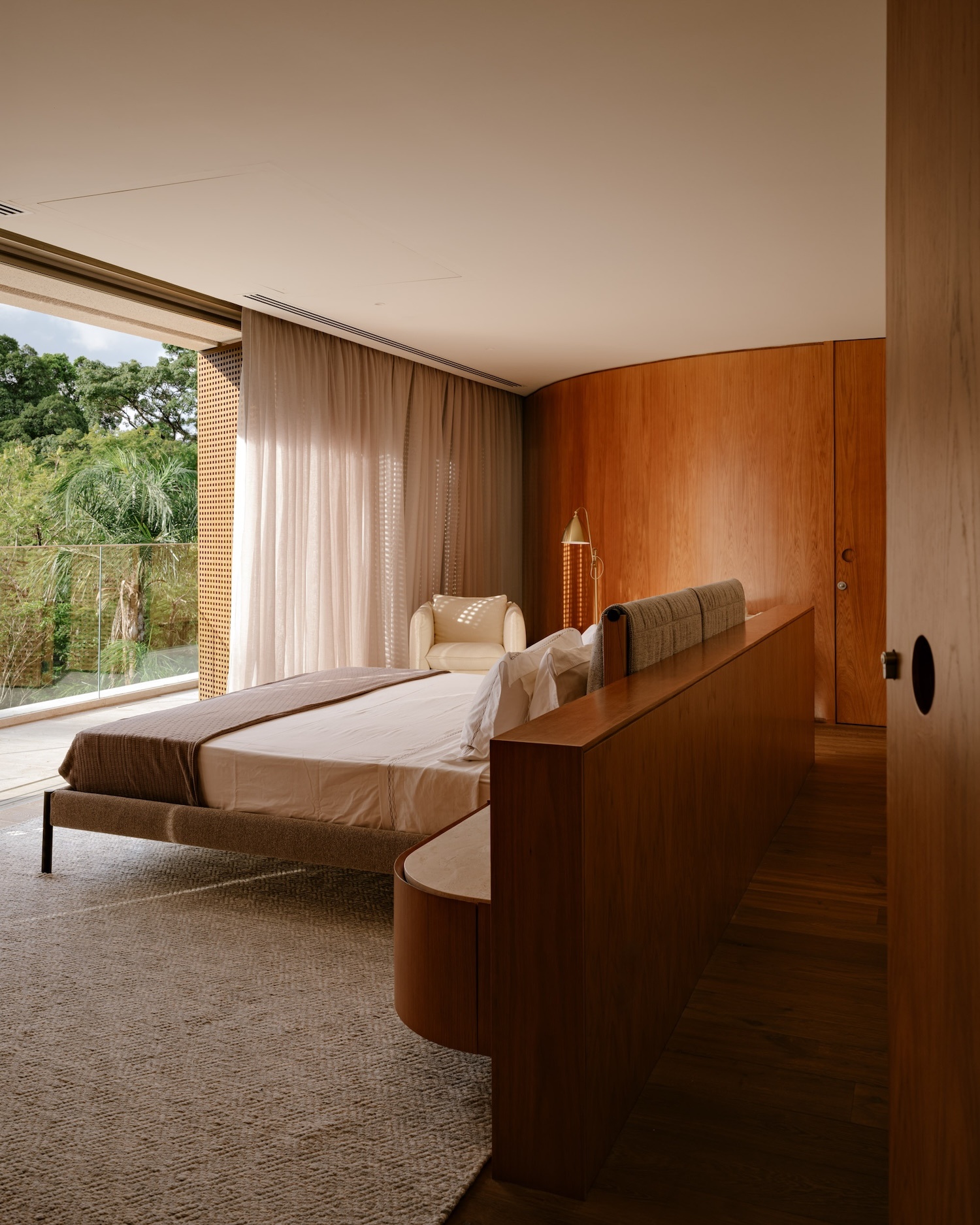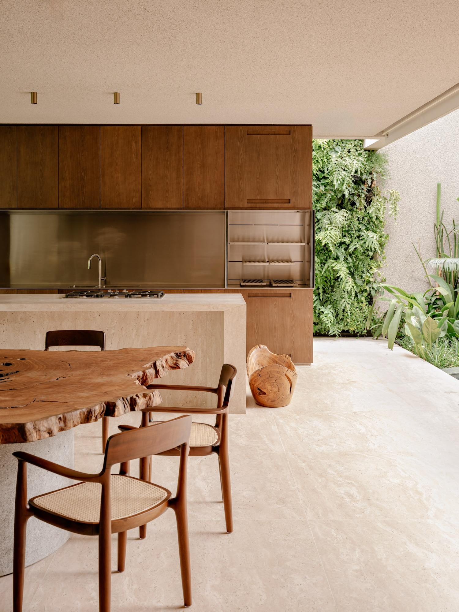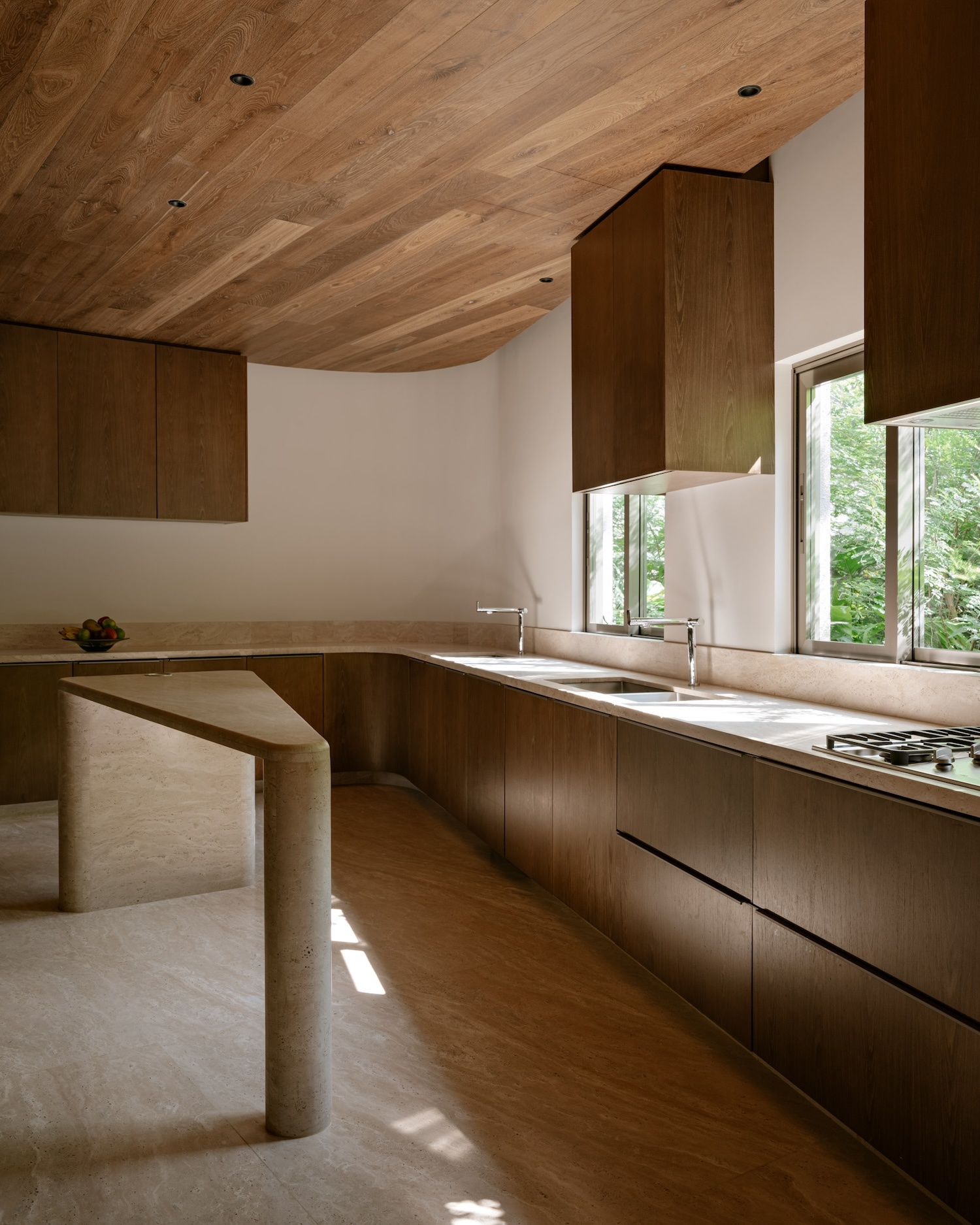 这种经过精准考量的分层阈值手法,在底层社交区域得到了延续与深化。起居、用餐、露台与厨房空间,通过大型玻璃滑动门与可调节木质屏风,与花园实现无缝衔接。这套屏风系统赋予了空间极强的灵活性——居民可根据需求完全打通室内与室外,让自然气息自由流淌;也可调节屏风角度,控制光线的进入量与空气的流通,在不同场景下获得舒适的居住体验。除此之外,连续延伸的石材地板从室内蔓延至室外,从材质上强化了空间的连续性,而室内的木质墙面覆盖,与玻璃外的自然草木色调相互呼应,进一步模糊了室内外的界限,让居住者在日常中便能随时触摸自然、感受自然。