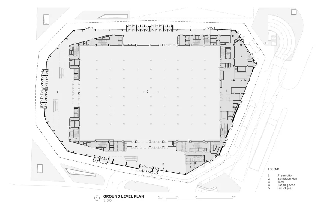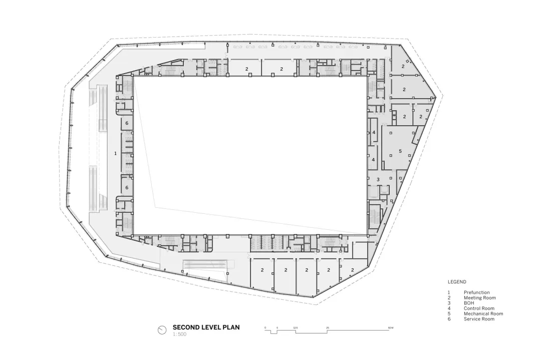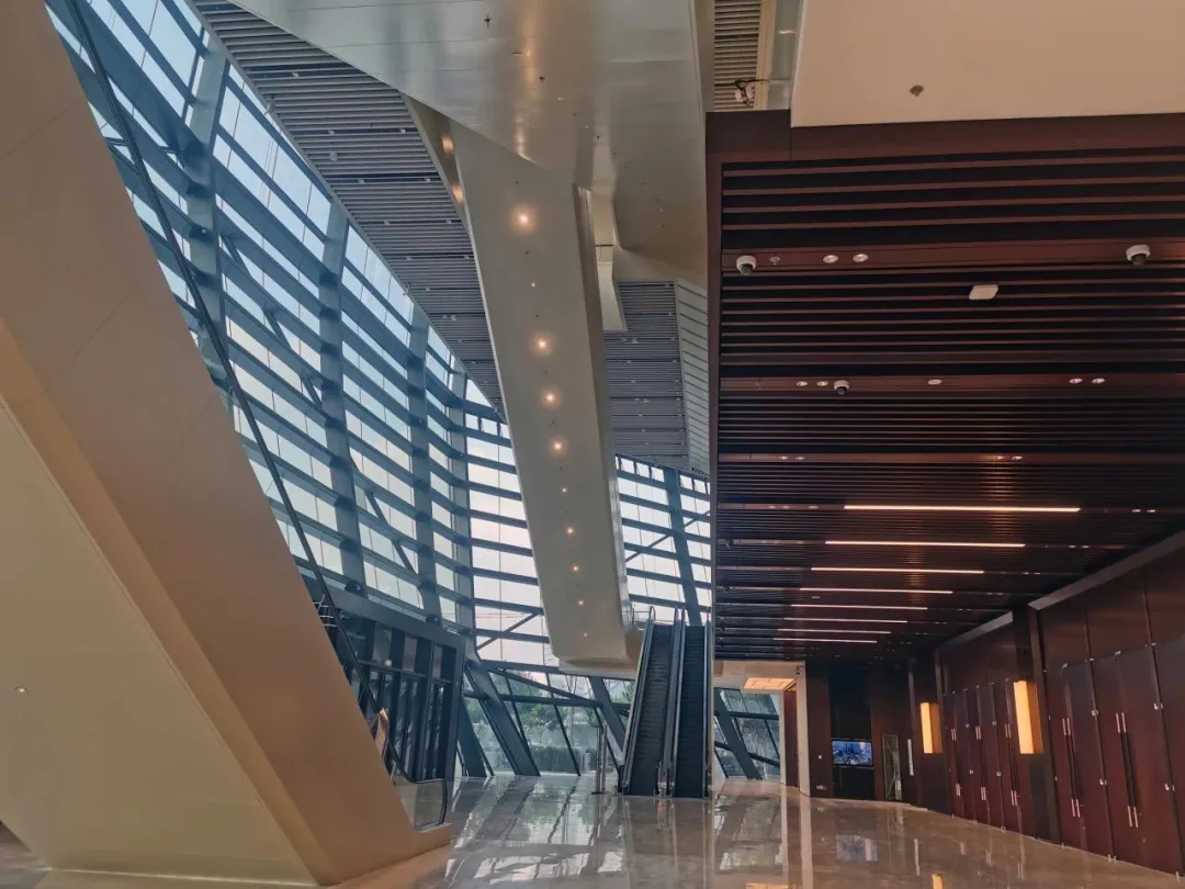 建筑内部以开阔中庭为核心,自动扶梯串联上下空间,展厅采用叠放布局,最大单体展厅面积达 6000 平方米,满足多元会展需求。环绕建筑的会议室与公共区域,以通透玻璃幕墙引入自然光与江景,多个 “户外房间” 景观露台则拓展了空间层次,实现室内外场景的自然衔接。