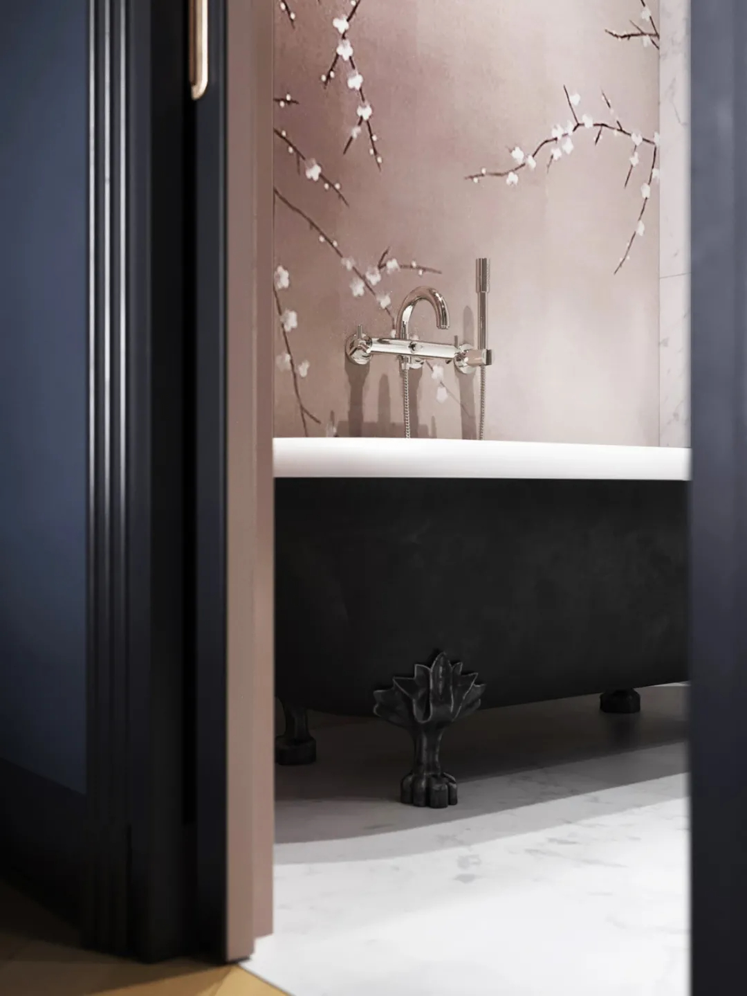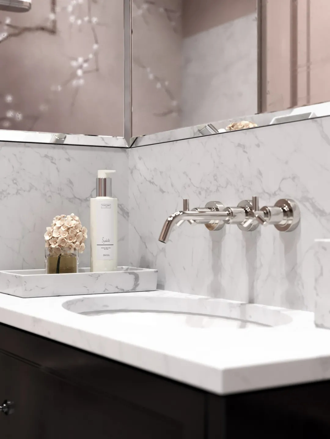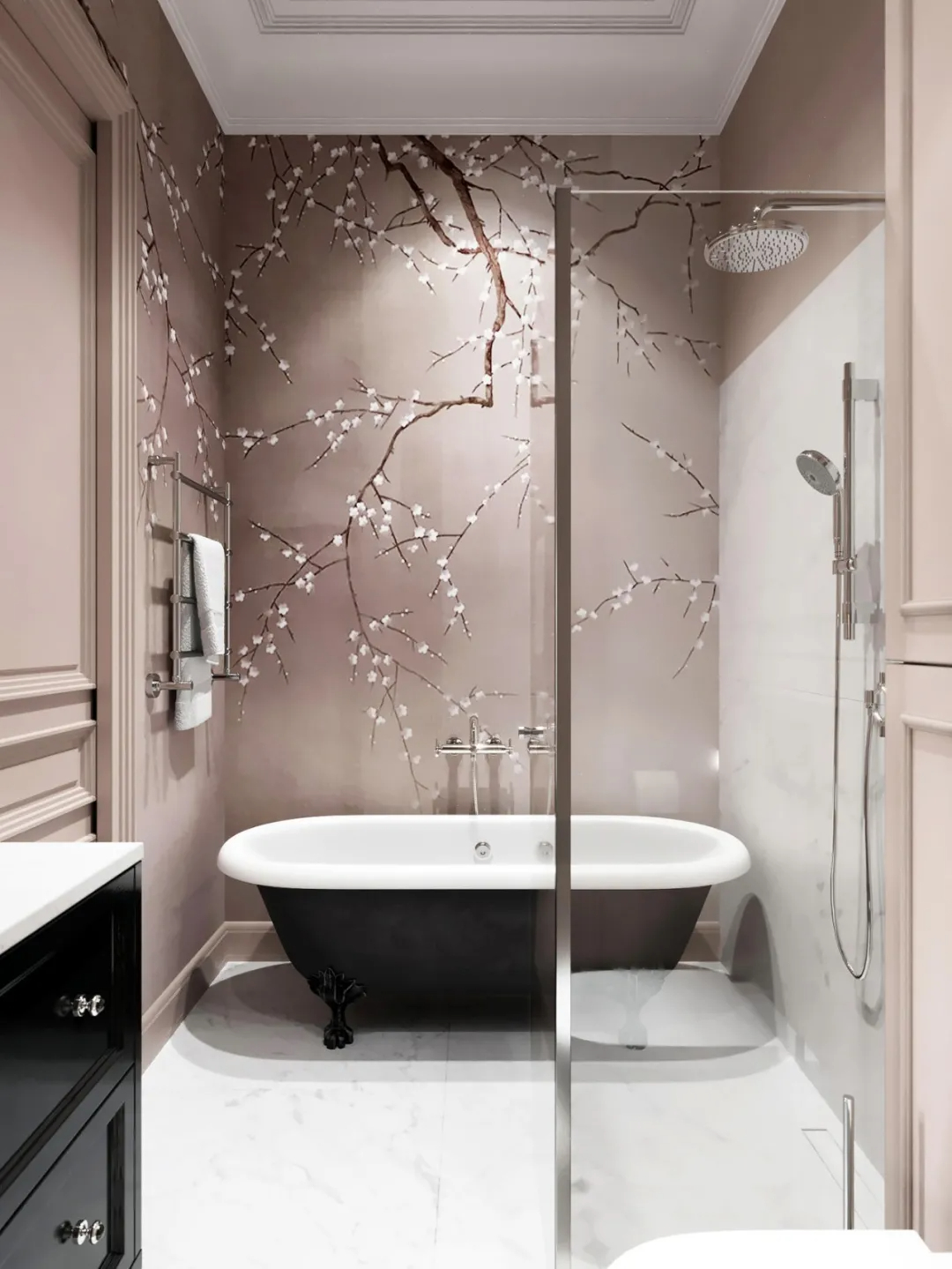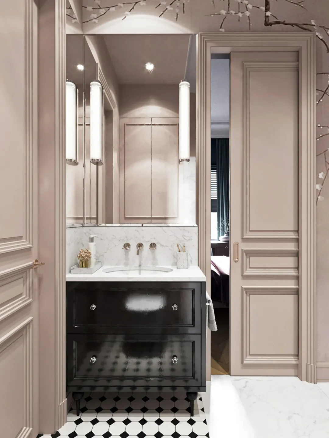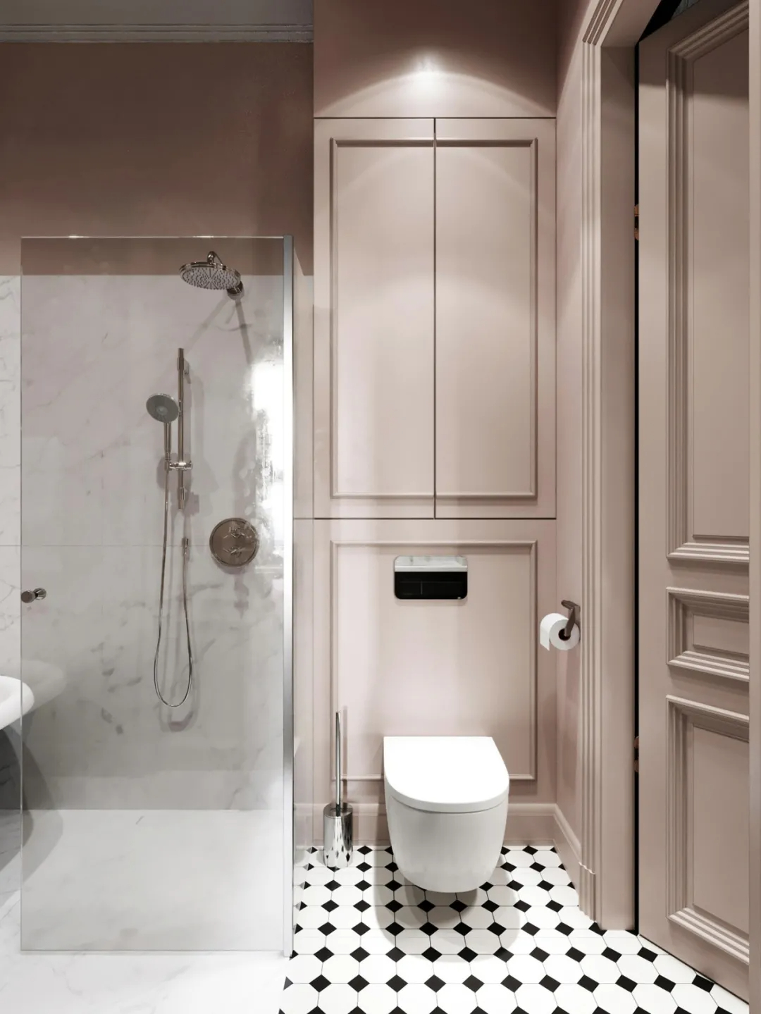 卫生间以粉色为主调,优雅灵动又充满活力。黑白花纹地砖搭配精致线条与梅花元素点缀,营造出轻松愉悦的氛围,在实用功能之外赋予空间强烈的情绪价值。