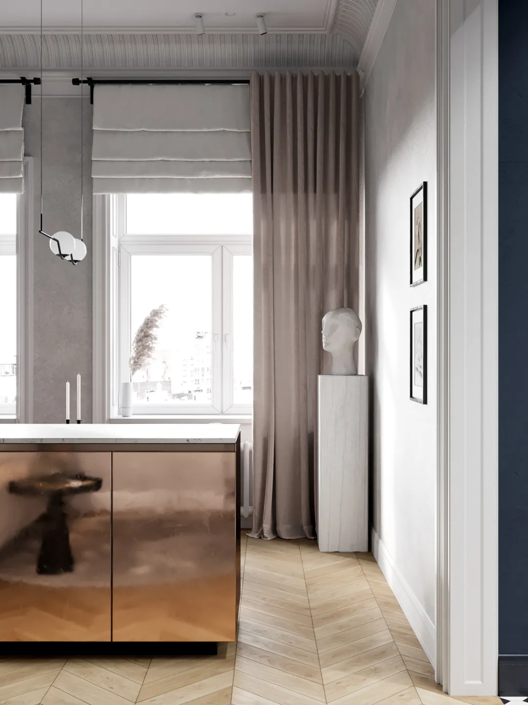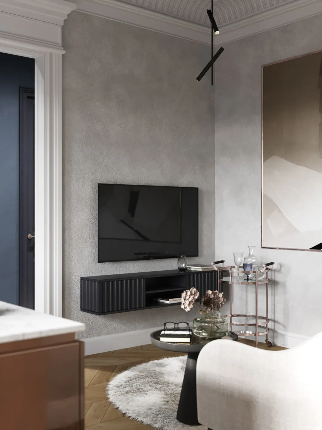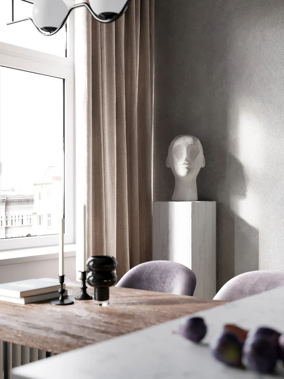 充足的自然光是这套公寓的重要亮点。一侧大窗将优质光线与视野引入室内,为紧凑空间带来明亮舒展的体验。设计师以黑白灰为基调,通过温和的色彩过渡平衡冷暖,让空间层次柔和而高级。家具与软装均选择极简款式,摒弃繁复造型,整体呈现干净、利落、克制的现代美感。