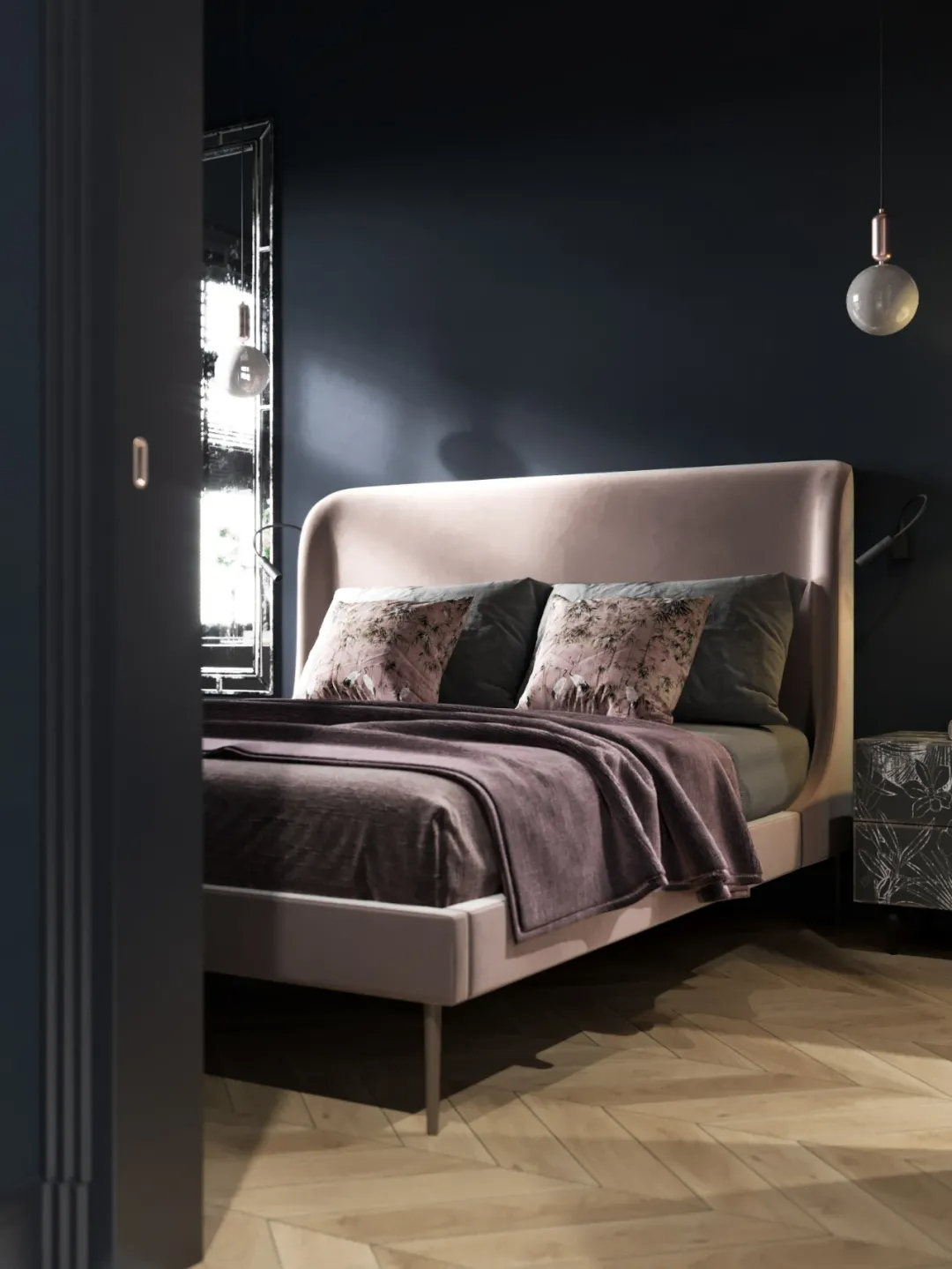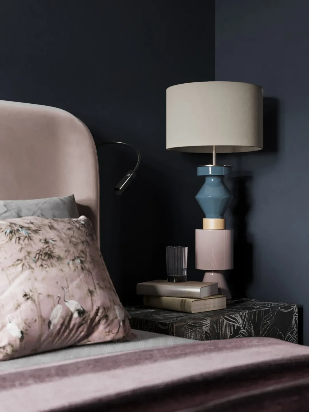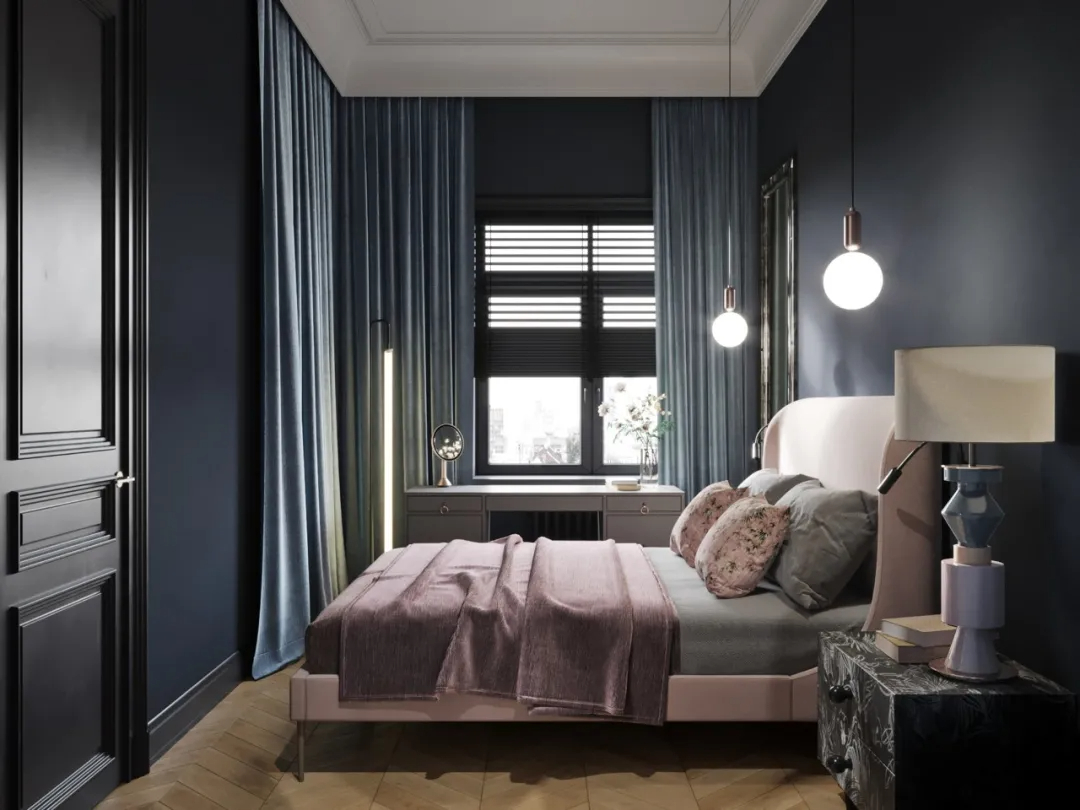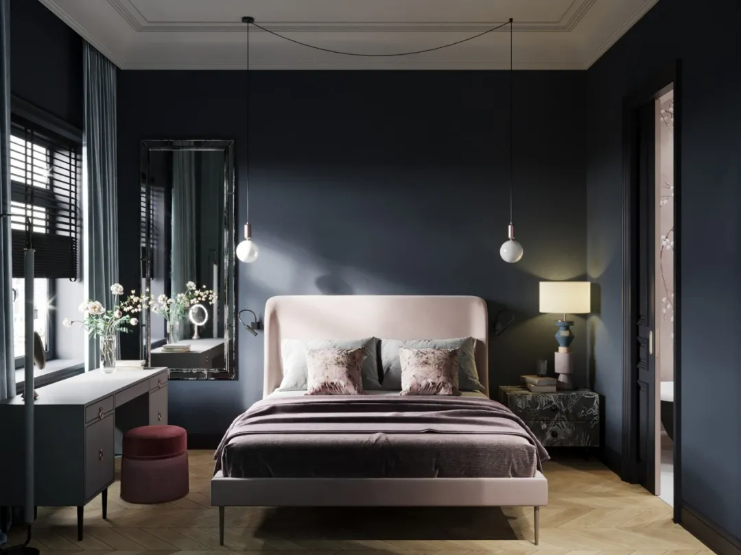 卧室以大胆的色彩碰撞塑造个性氛围。深蓝色墙面带来沉静如深海的基底,粉色床品则点亮空间,形成前卫又和谐的视觉对比。搭配造型独特的灯具与简约桌椅,整体氛围闲适、简约且富有现代时尚感,实现休憩与美学的平衡。