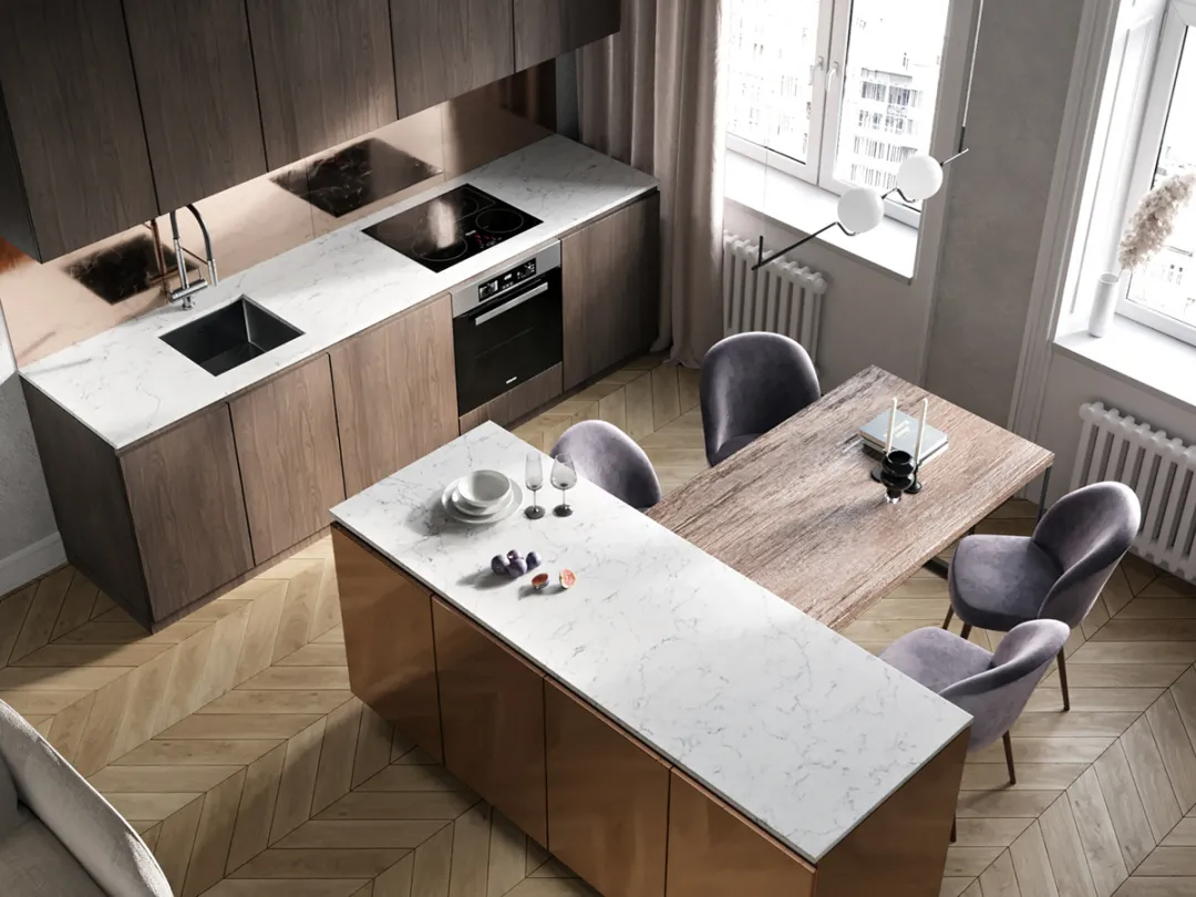 空间整体采用开放式布局,拆除多余隔断,将客厅、餐厅与餐厨区连通,最大化释放空间尺度。客厅靠窗布置,双人小沙发搭配柔软毛绒地毯,营造出北欧极简风格的松弛与温馨。开放式餐厨区仅保留必要的吧台与餐桌,线条利落,搭配造型别致的吊灯,在简约中提升空间质感,让小面积户型也显得通透大气。
