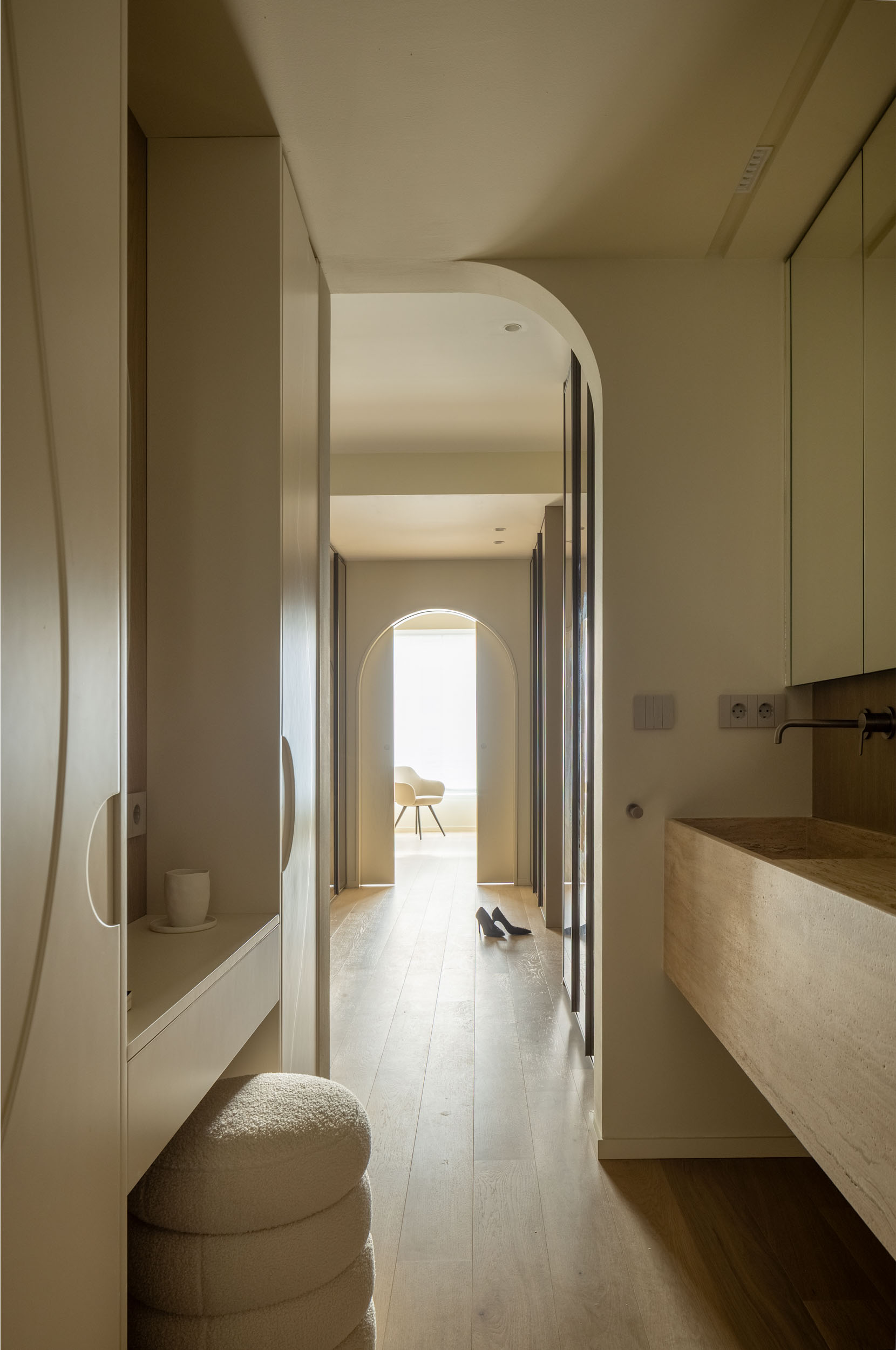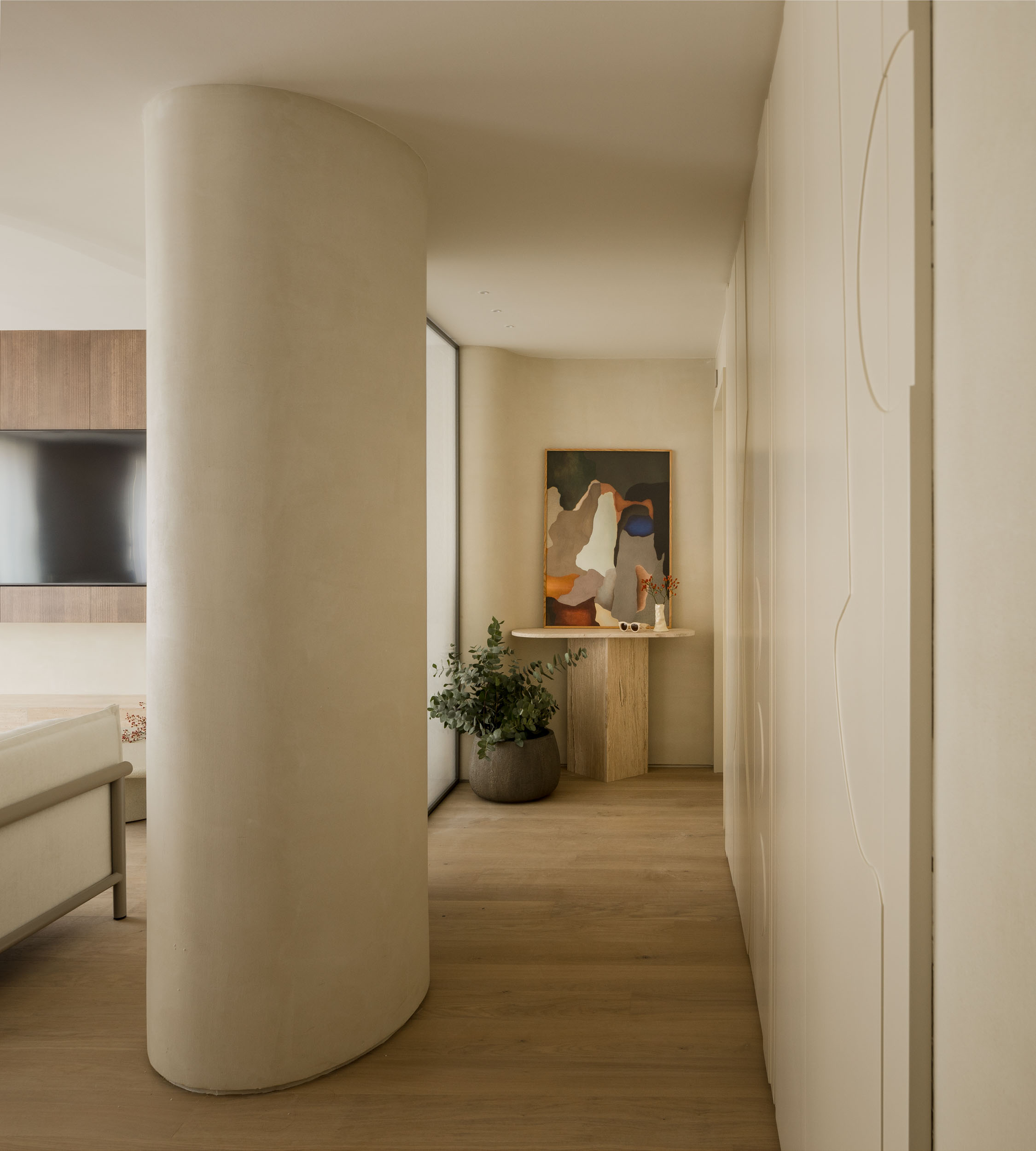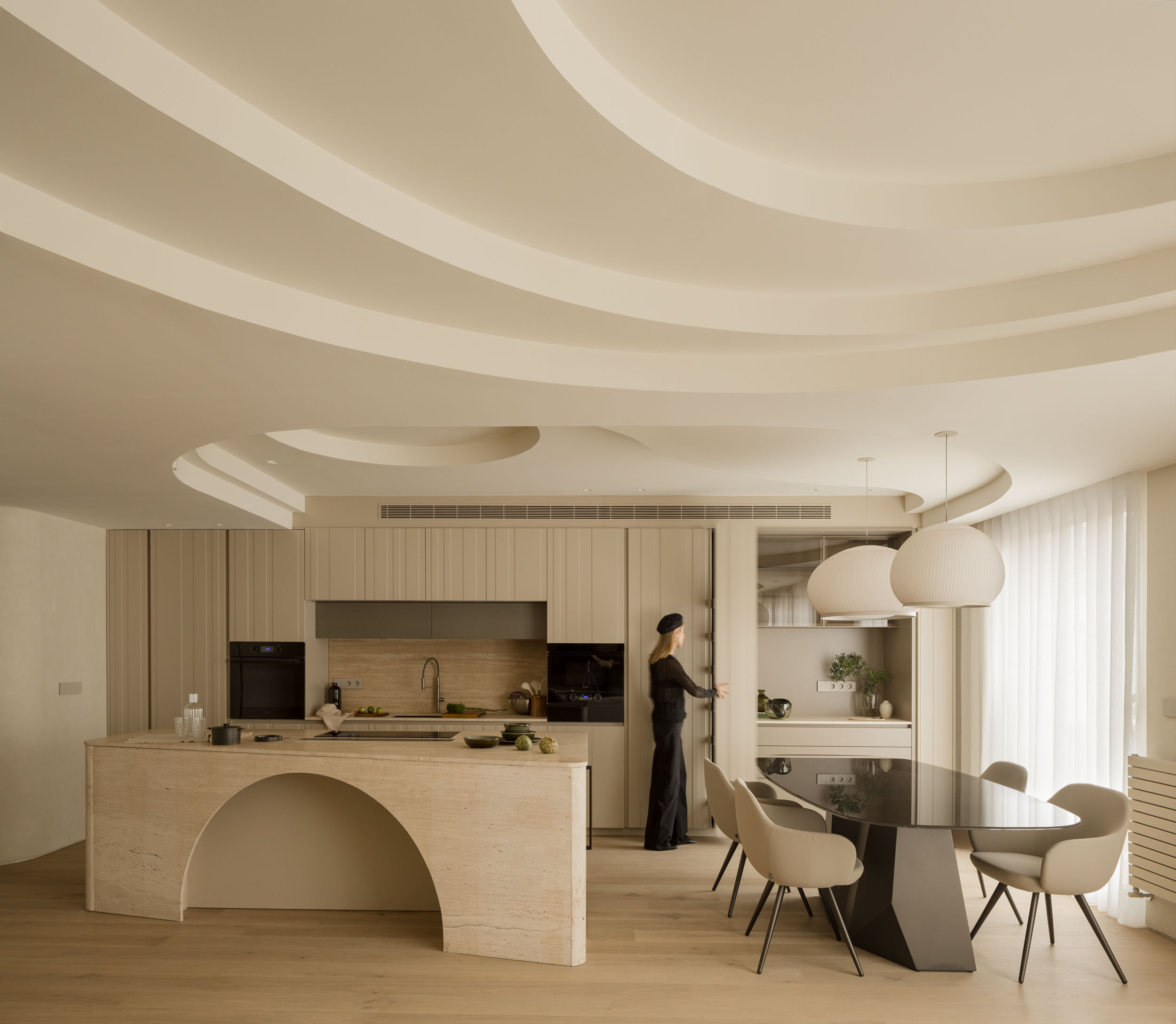空间以流畅动线为核心,大量运用弧形门框与圆角设计,弱化边界感,引导自然舒适的移动节奏,让家在秩序中拥有柔和与宁静。