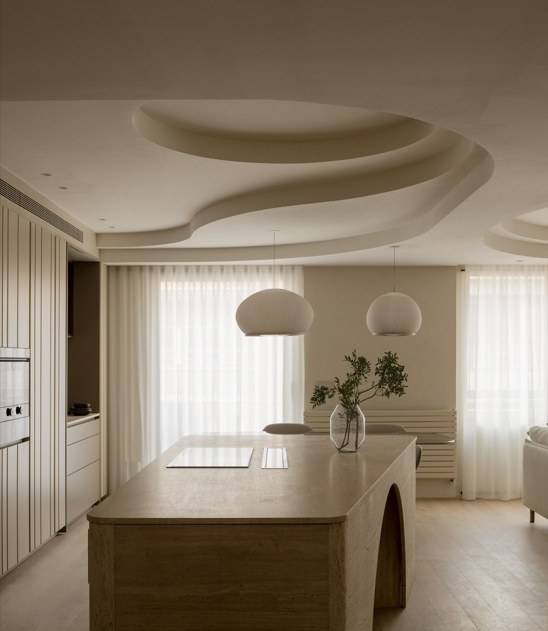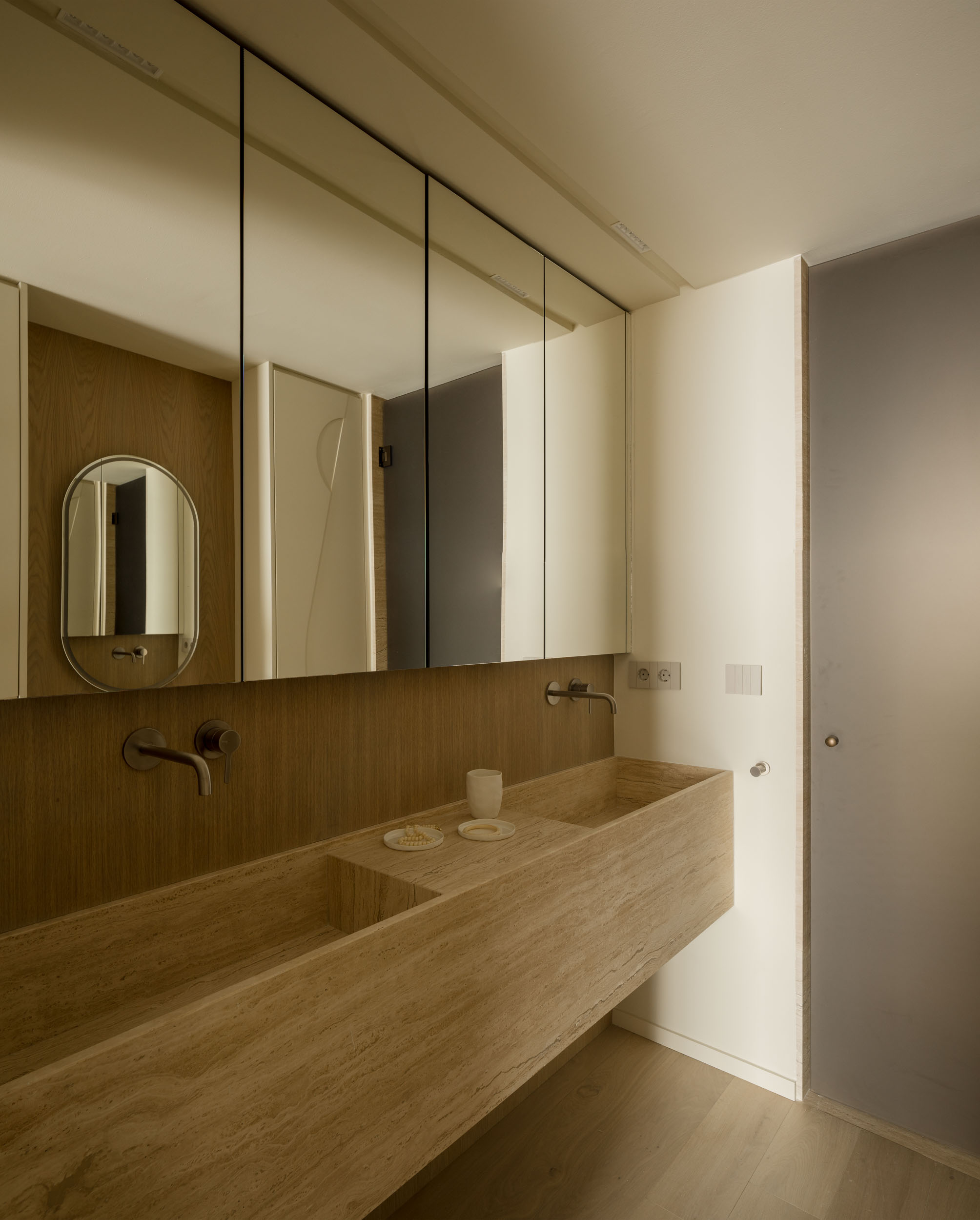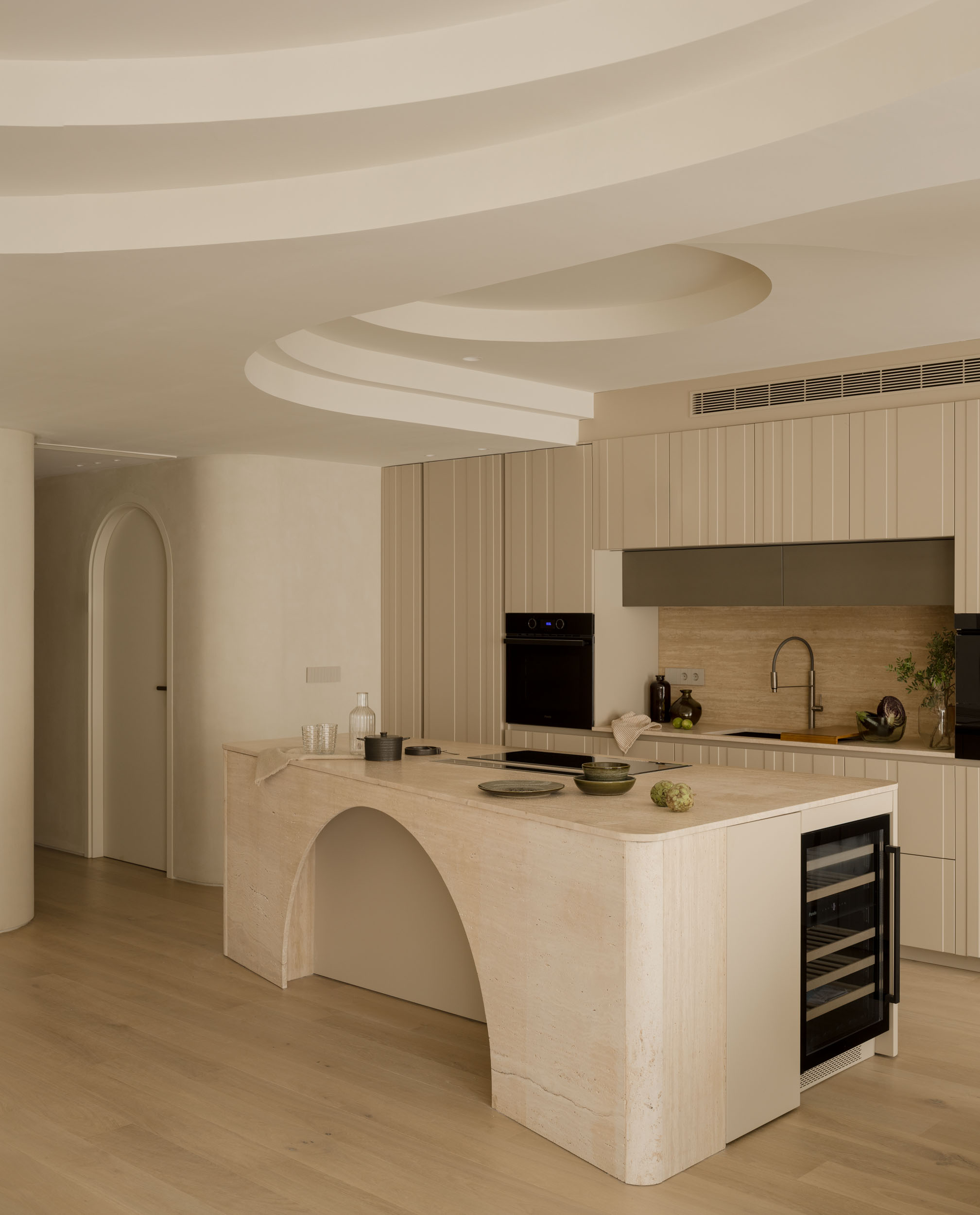 项目包含四间卧室、三间浴室、洗衣房、餐厨区及客厅,整体材质温暖而真实:土耳其石灰华、Campaspero 石灰石、橡木与 Biocal 水泥饰面(RAL 1013)共同勾勒出永恒的地中海美学。
