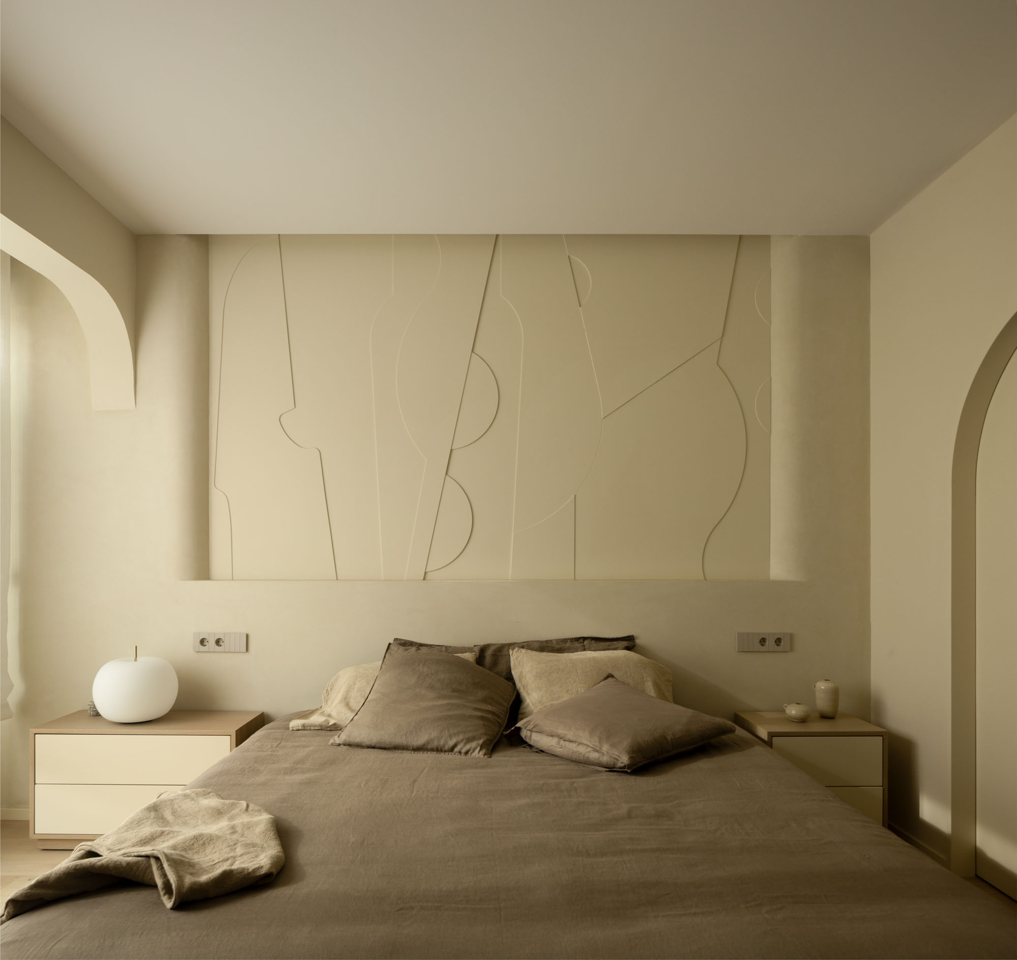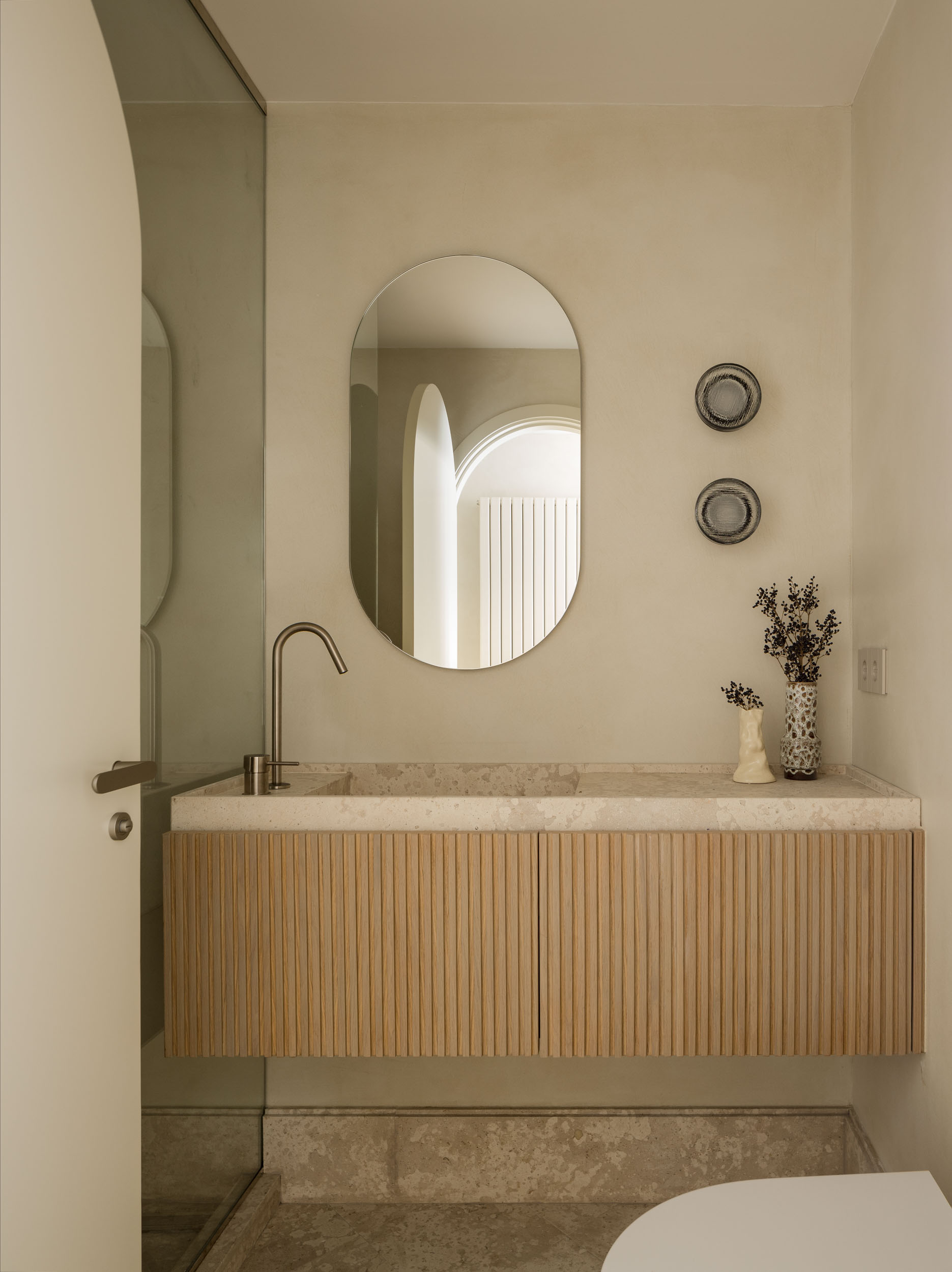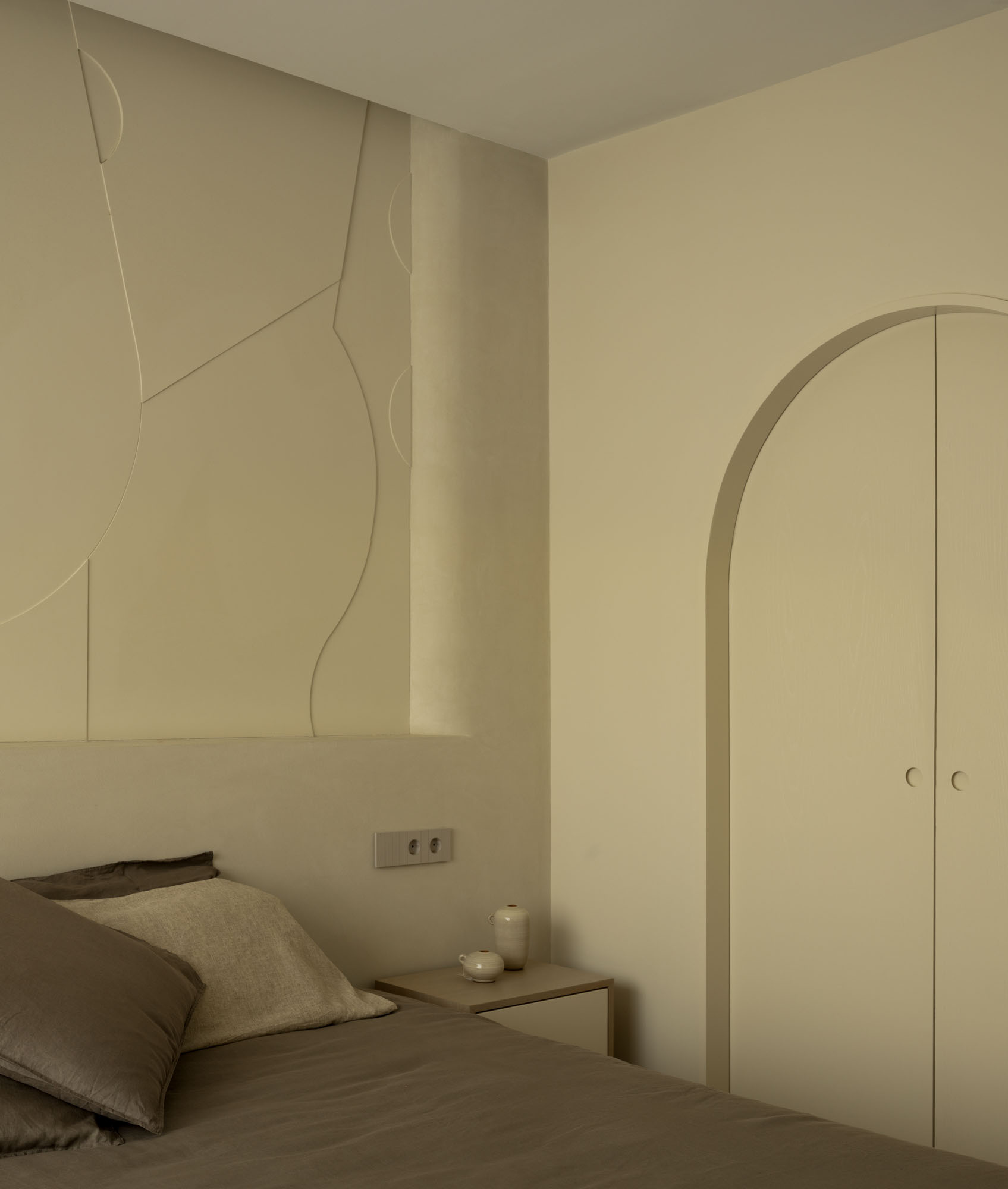 项目包含四间卧室、三间浴室、洗衣房、餐厨区及客厅,整体材质温暖而真实:土耳其石灰华、Campaspero 石灰石、橡木与 Biocal 水泥饰面(RAL 1013)共同勾勒出永恒的地中海美学。