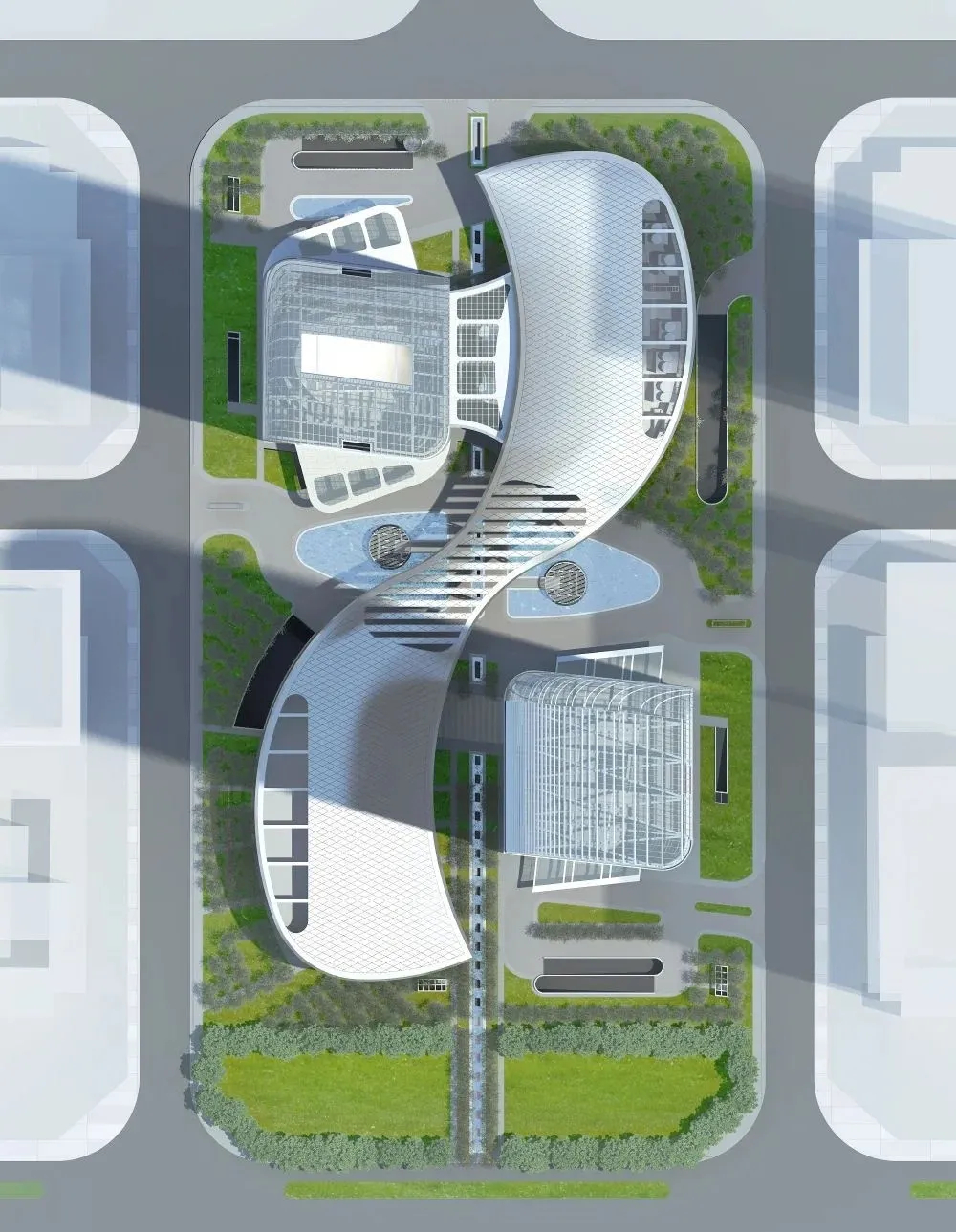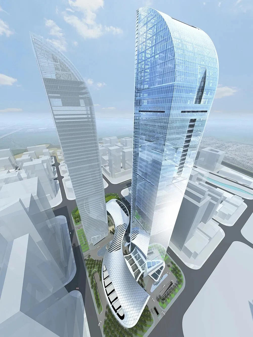 设计灵感源自银川本土底蕴,双塔形态如“银色河流”,轮廓微弧扭转,既呼应贺兰山岩画的苍劲质感,又暗喻黄河水脉的奔涌不息与城市腾飞的羽翼,灵动而有力量;裙楼顶部采用“花伞”造型穹顶,巧妙融入伊斯兰建筑中的拱券元素,让现代建筑线条与地域文化符号自然共生,形成兼具现代感与本土气息的美学语言,打破了国际设计与地域文化的壁垒。