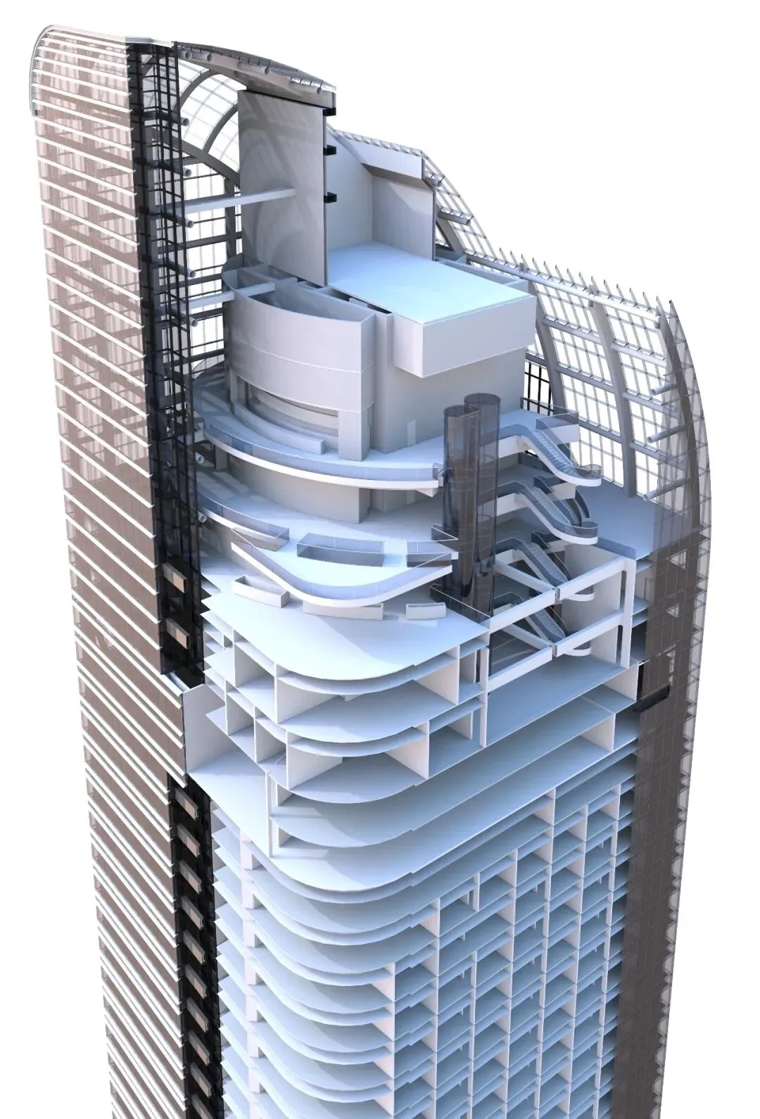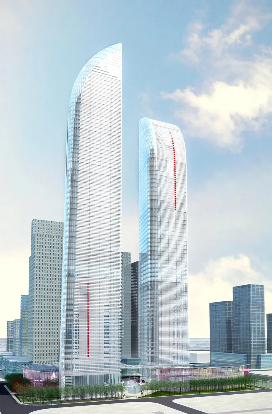 结构设计兼顾安全与舒适,双子塔采用“型钢混凝土外框架+核心筒”组合体系,抗震设防烈度达8度,可有效抵御强风强震风险,适配银川地域气候与地质条件;标准层面积超过2000平方米,配备26部高速电梯,人均等候时间不超过40秒,搭配18米挑高的恢弘大堂与4.5米的舒适层高,为未来入驻企业营造开阔、高效、便捷的办公环境,其中北塔顶部还规划有300米高空大堂及空中酒吧,可俯瞰城市全景,打造独特的商务与观光体验。