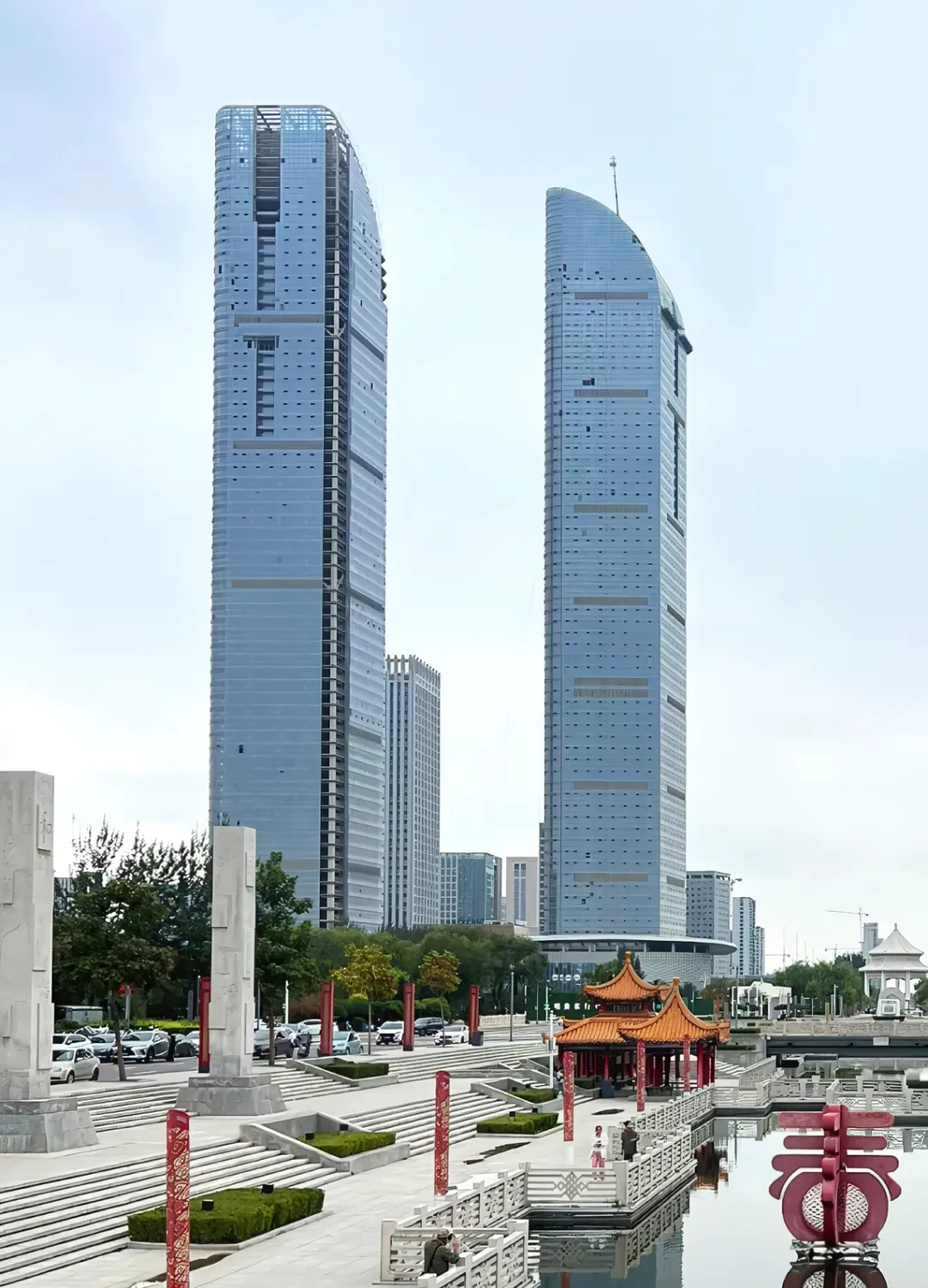 项目坐落于银川阅海湾中央商务区核心地段,总投资约100亿元,占地面积约11289平方米,总建筑面积近30万平方米,由南北两座均高301米、各66层的塔楼,搭配24米高的裙楼组成,不仅是宁夏第一高楼,更是西北地区首个突破300米高度的双子塔综合体,跻身全国双子塔前列,自立项以来便承载着城市发展的殷切期待。