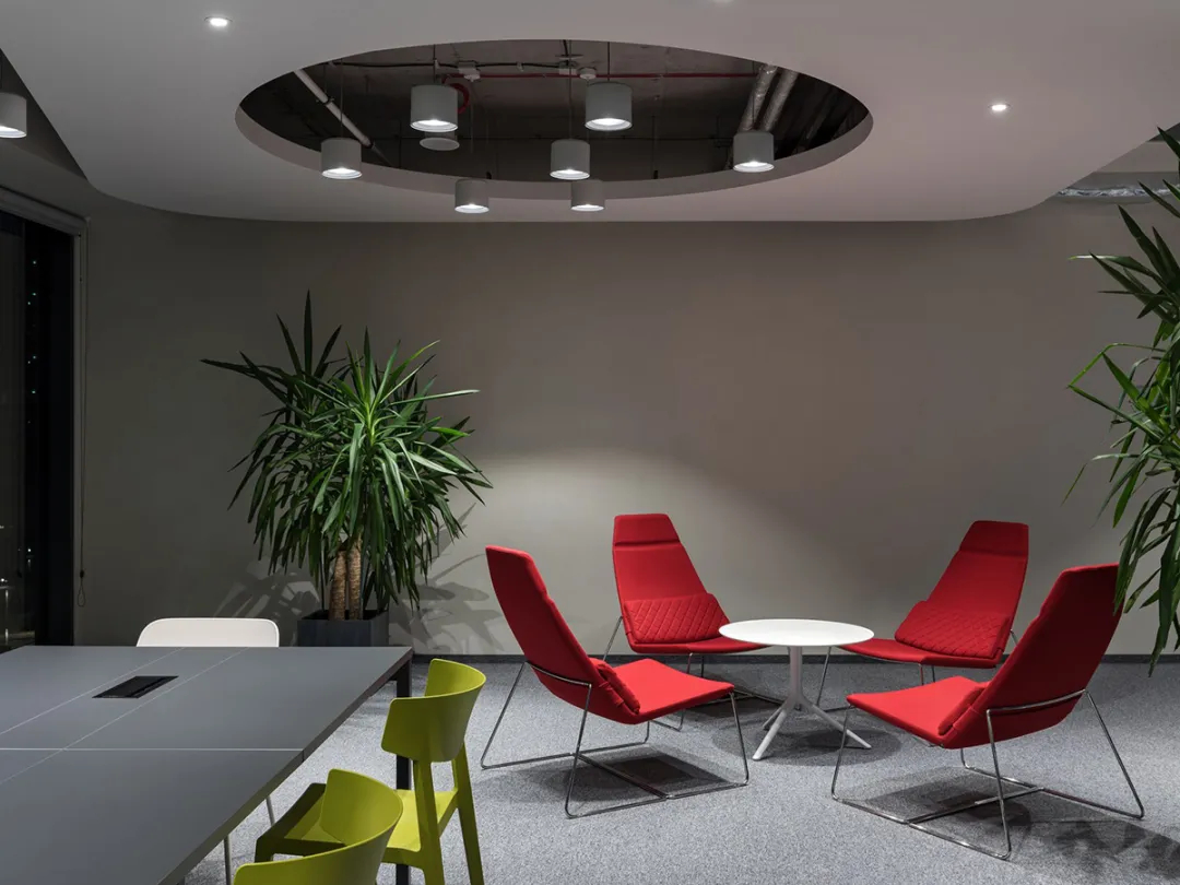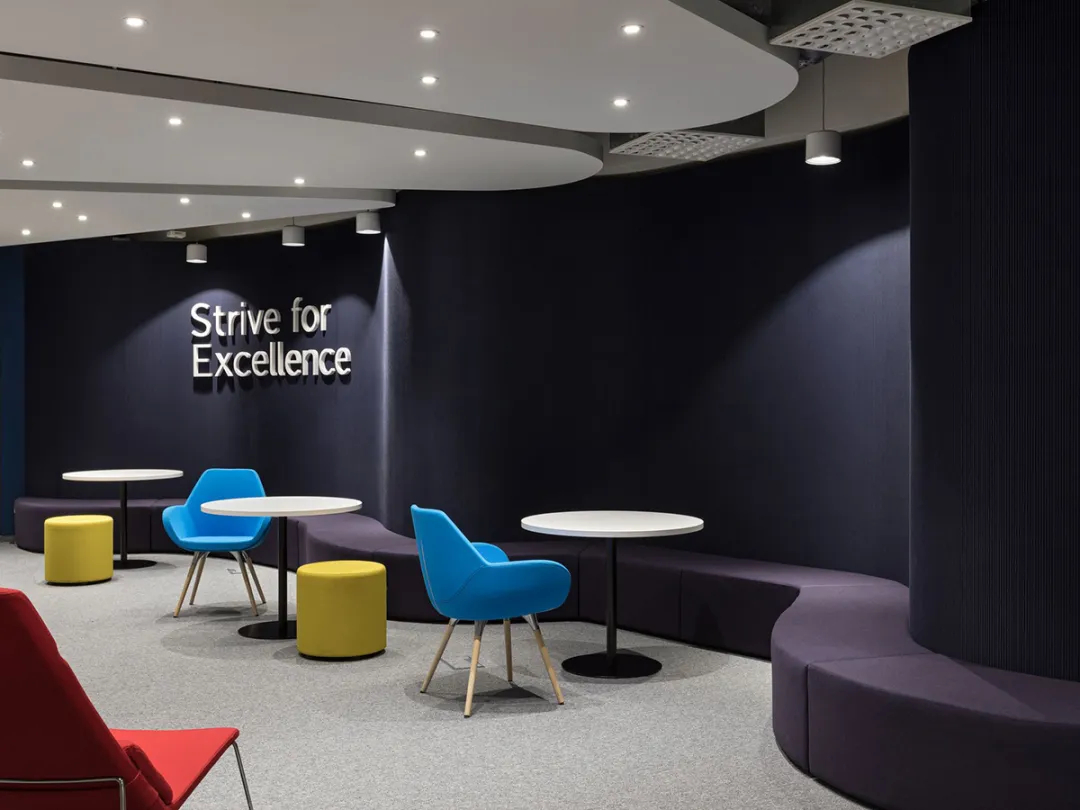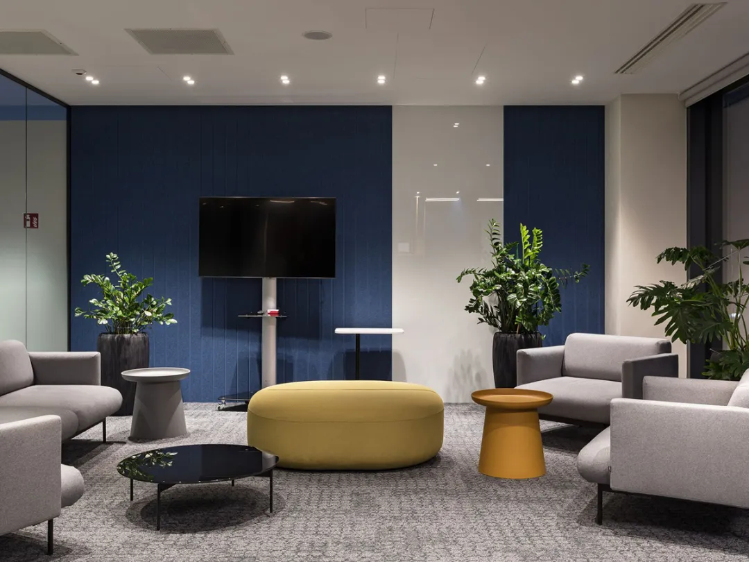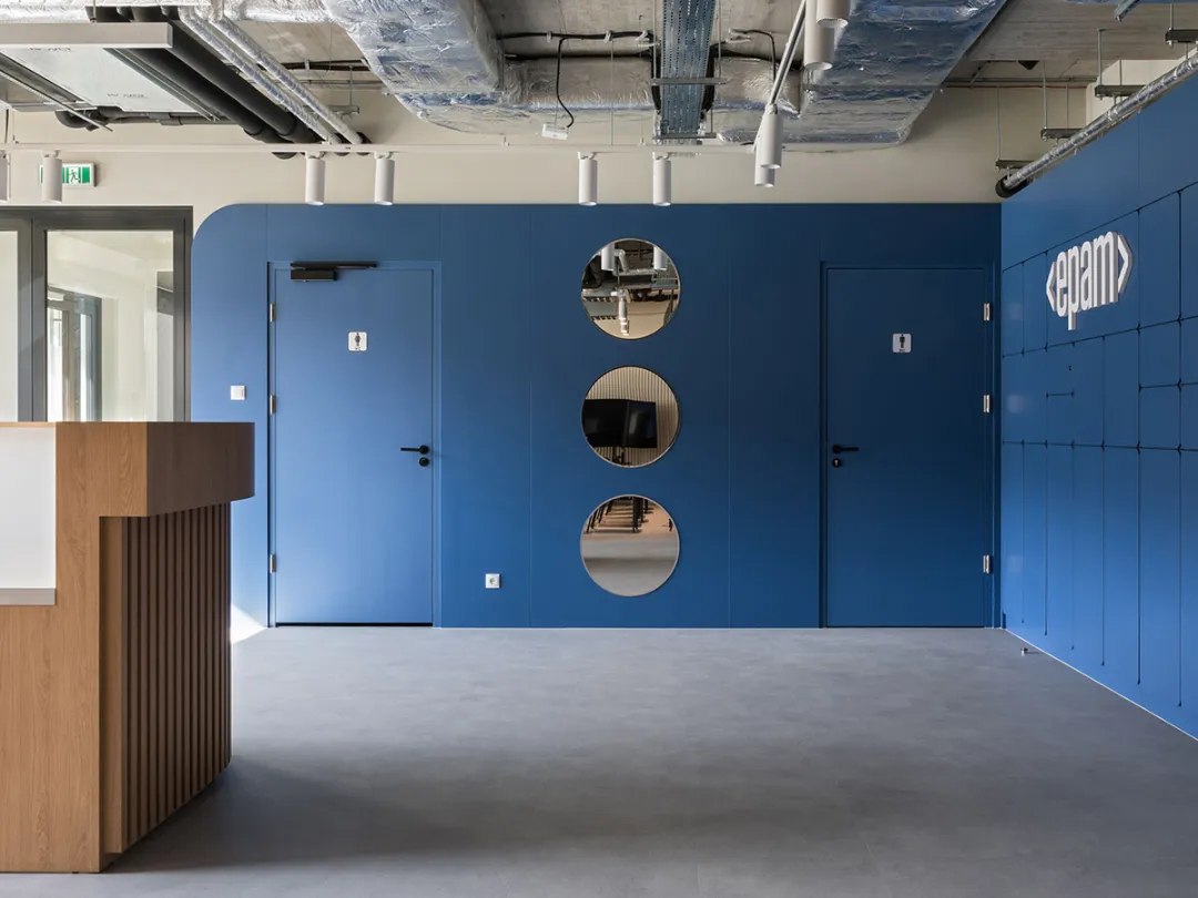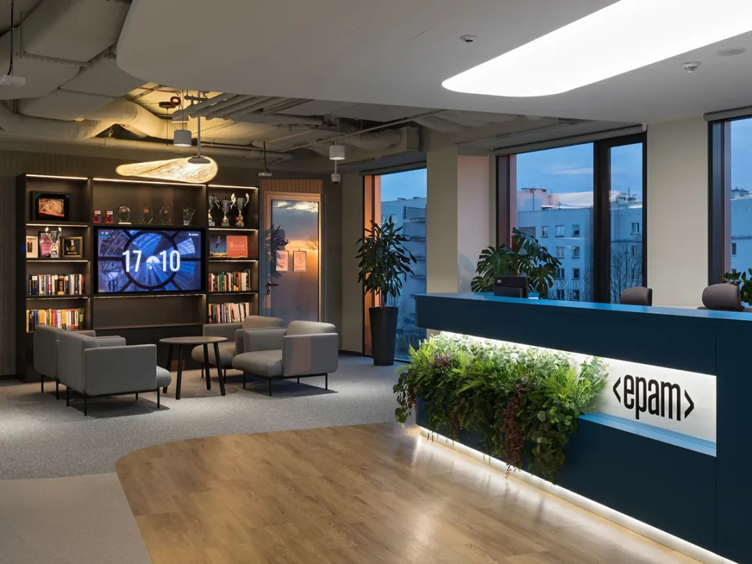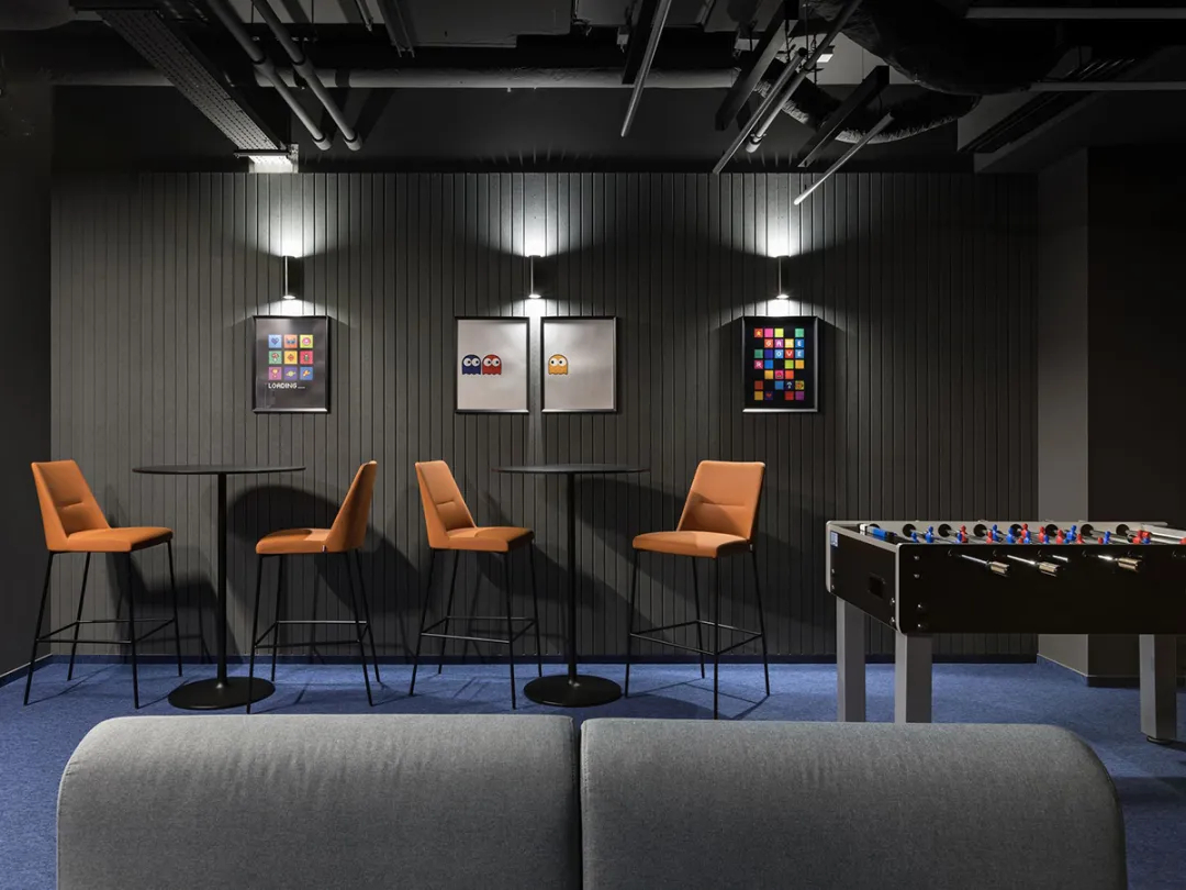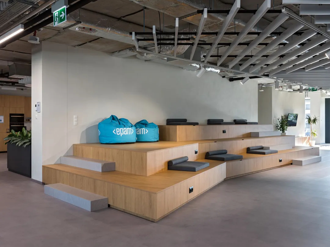 声学效果与耐久性是空间设计的重要考量,吸音面板有效阻隔噪音,耐磨地板与易维护表面材质,确保空间在高频使用下依旧保持良好状态;室内选用Profim、mdd、Narbutas及Bejot等品牌家具,将舒适感与经典设计融为一体。此外,EPAM的品牌标识通过色彩搭配与细节植入自然呈现,让空间既具备强大的功能性,又承载了鲜明的品牌特质,真正实现了“连接、共享、创造”的设计初心,为IT企业办公空间设计提供了优质范本。