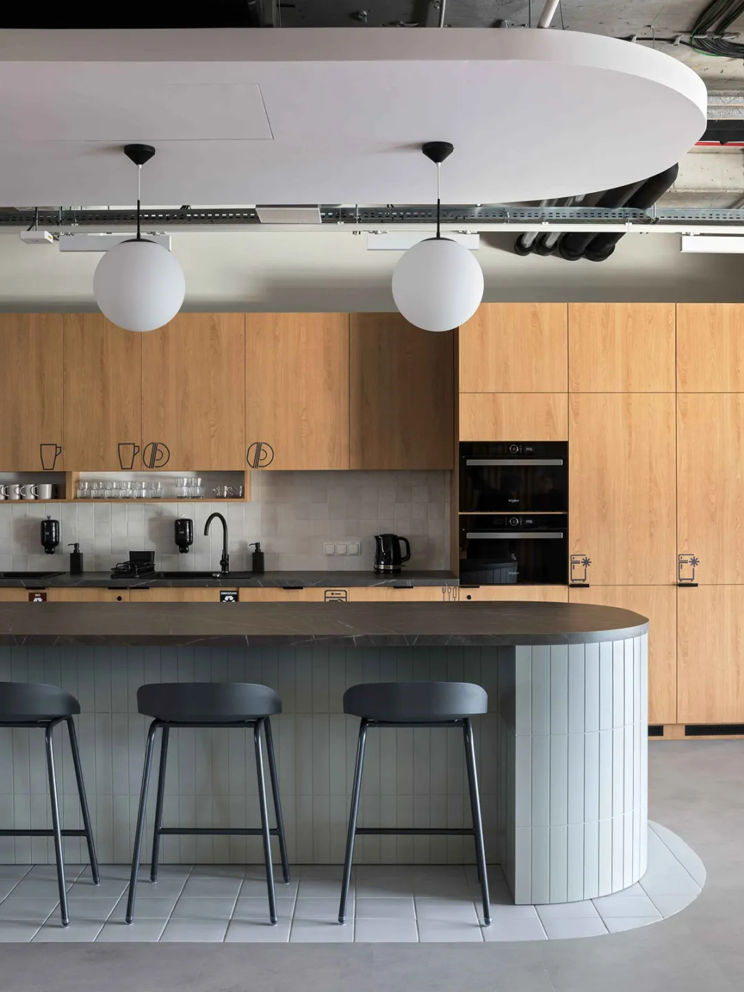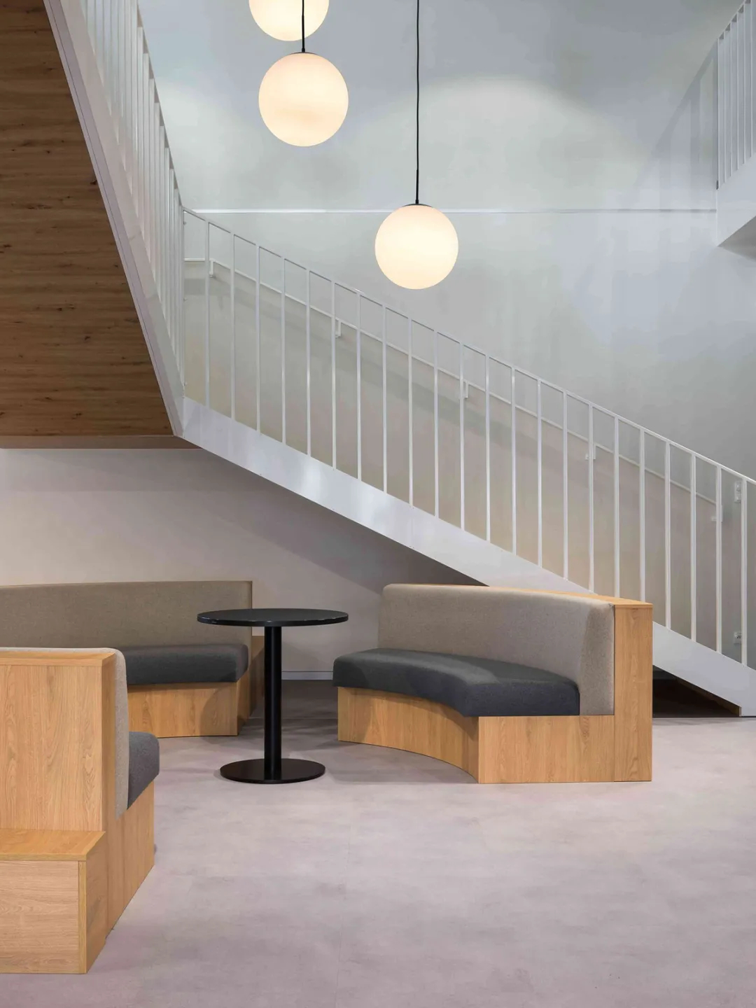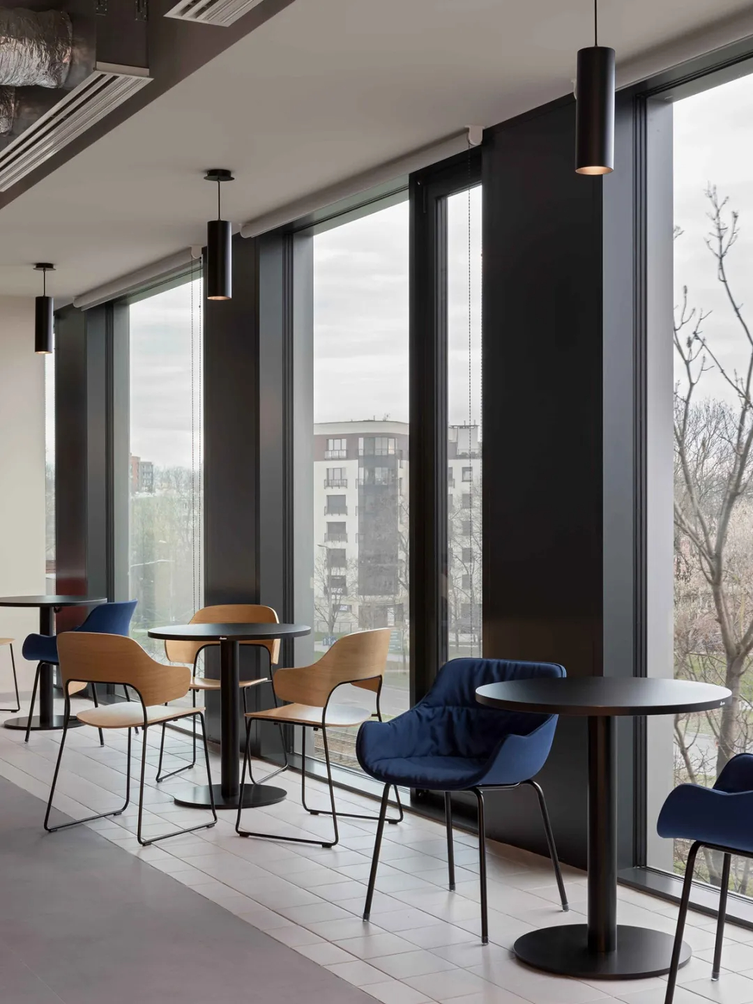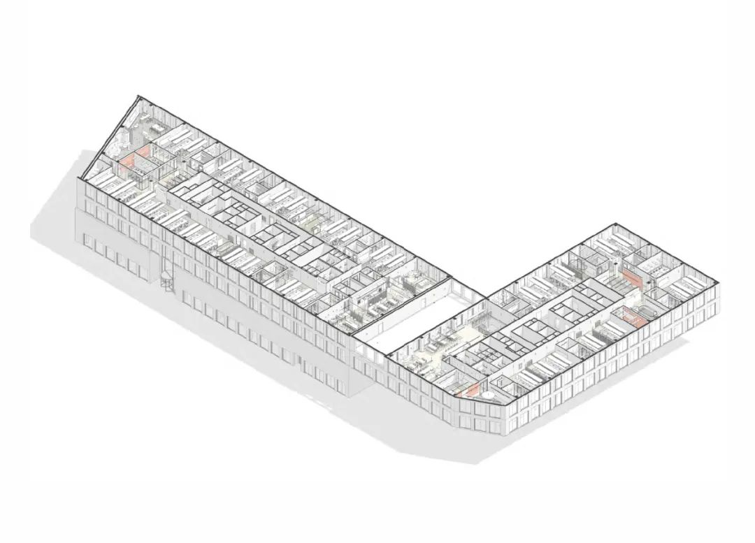 项目总面积近8500平方米,分布于两栋由共享露台连接的建筑内,地理位置得天独厚,毗邻办公集群,靠近克拉科夫老城区与新兴住宅区,便捷性与环境优势兼具。设计的重心始终聚焦于建筑内部,以空间为纽带,串联起各类功能场景:一层开阔的枢纽区是空间的核心,配备多样座席、站立空间及小型咖啡吧/厨房,成为员工举办各类活动、自由交流的活力聚集地。