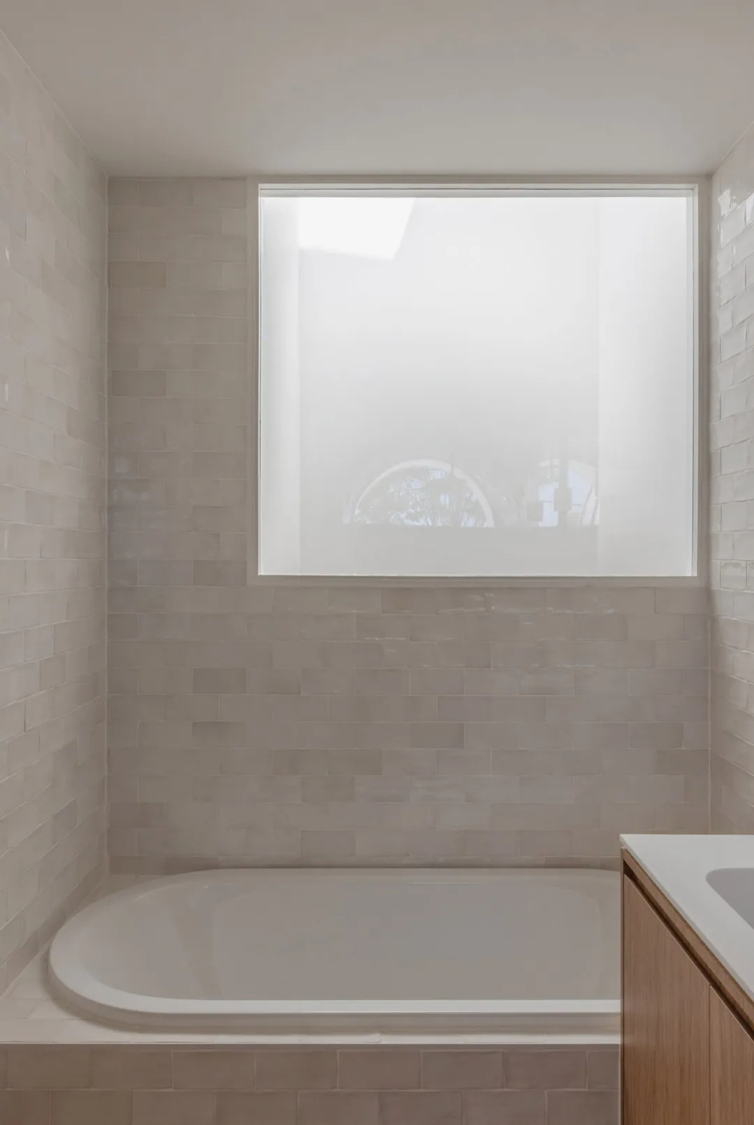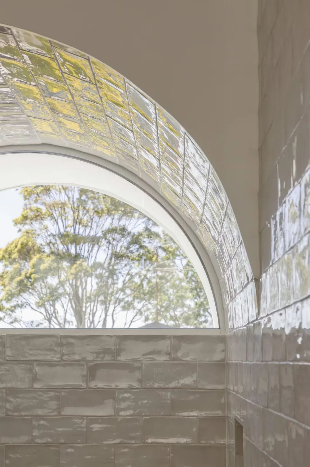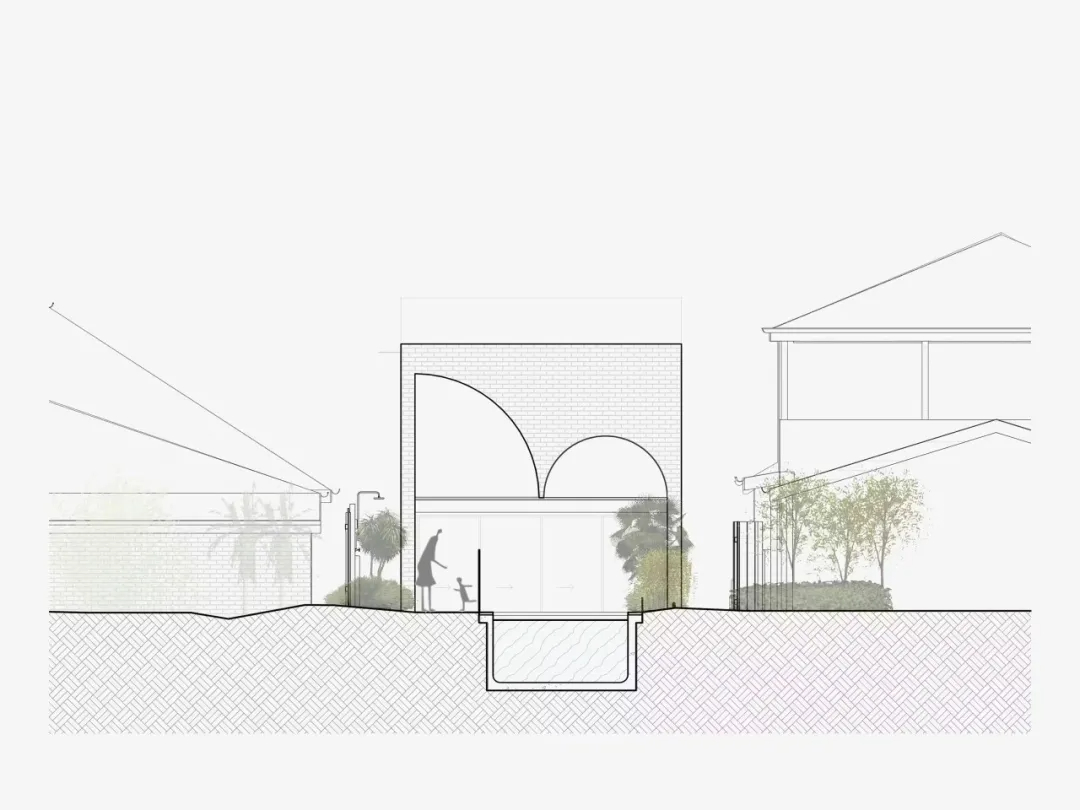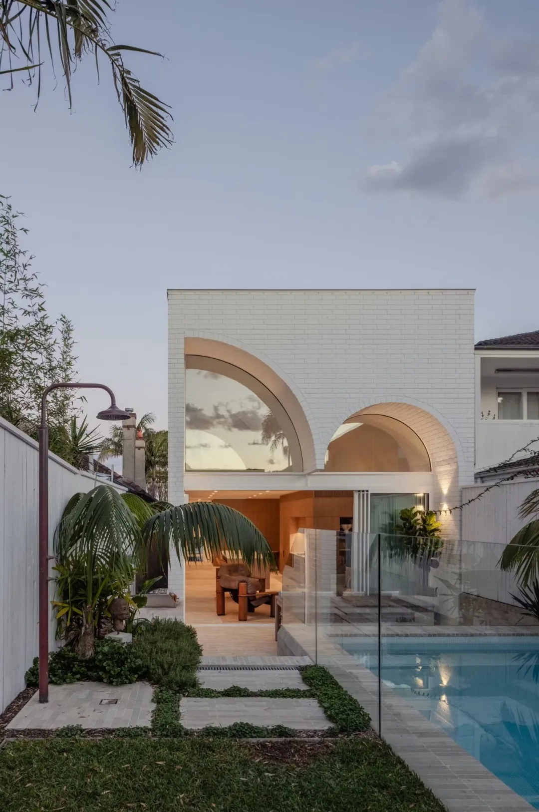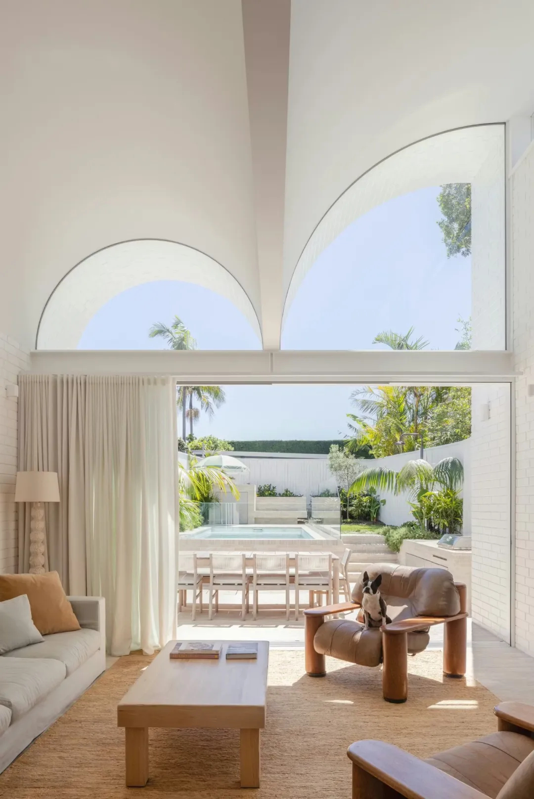 入口采用内敛的收放式设计,通过紧凑的过渡走廊形成空间缓冲,既保持与城市界面的联系,又保障了居家的私密性。步入室内,公共区域豁然开朗,开放式客厅、餐厅与厨房横向贯通,并以大面积拱窗与后院泳池、绿植庭院相连。筒拱状的曲面天花在客厅上方抬升,配合精准布置的天窗与高窗,让自然光在不同时段形成丰富的光影层次,海风也能顺着通道自然流入室内。