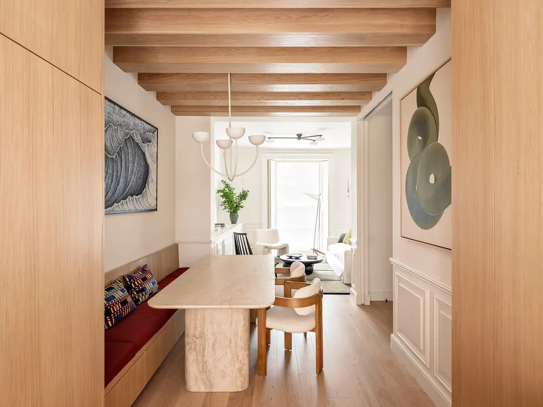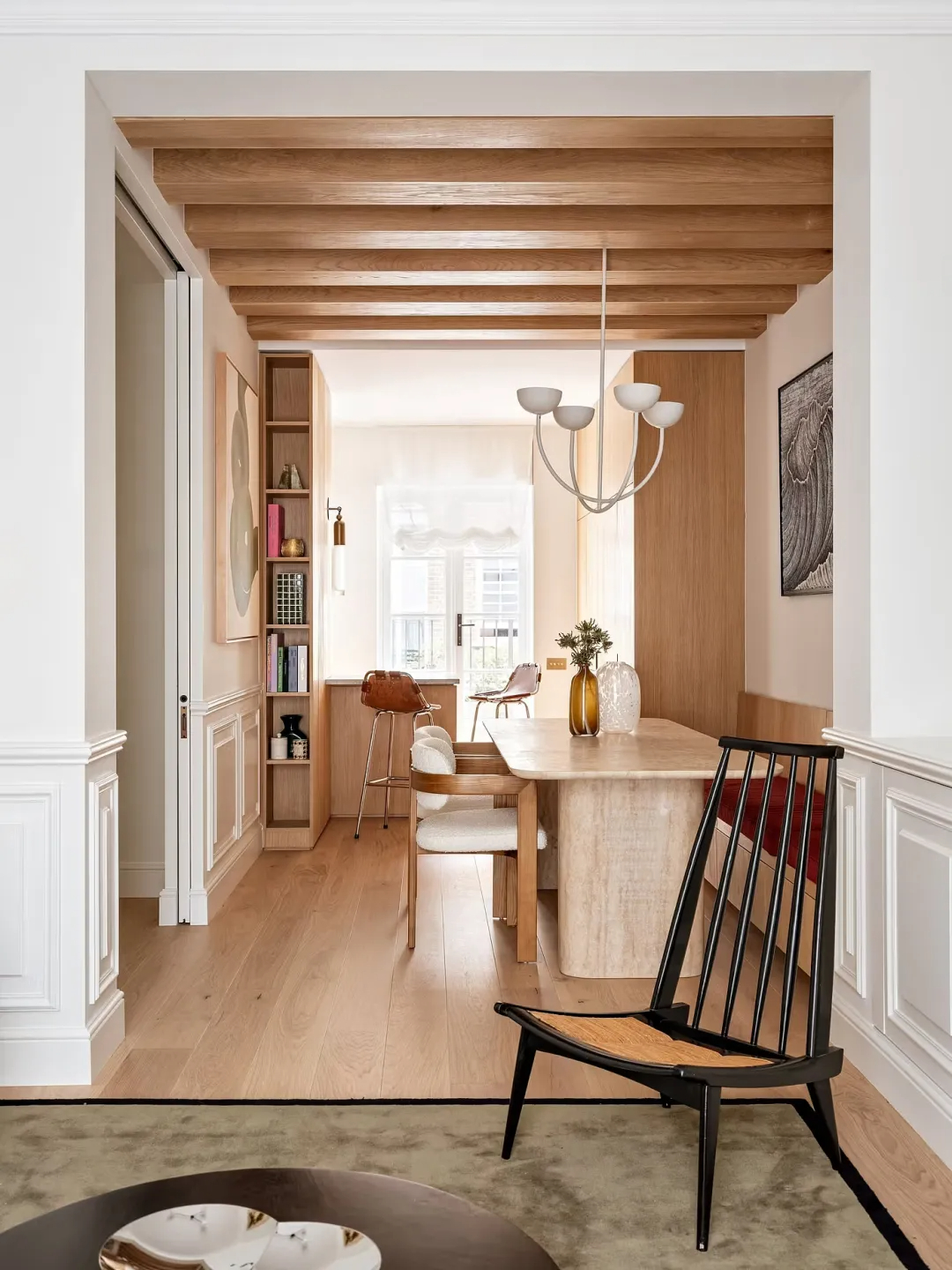 入户空间保留了建筑原有的古典特征,新设计以统一的色彩与材质自然过渡,让历史与现代柔和衔接。连续的硬木地板贯穿客厅、餐厅与厨房,与修复后的木梁相互呼应;白色护墙板温柔捕捉光影,并与整面墙的定制柜体融为一体,电视也被巧妙隐藏,让空间保持干净完整。