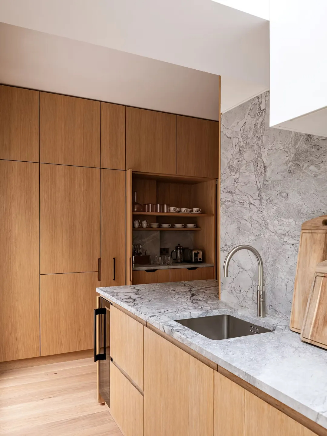 整体设计以木材、石材与定制收纳为核心,搭配低调克制的色调,在简约中营造出触感丰富、氛围宁静的生活质感,诠释出安静而内敛的奢华。