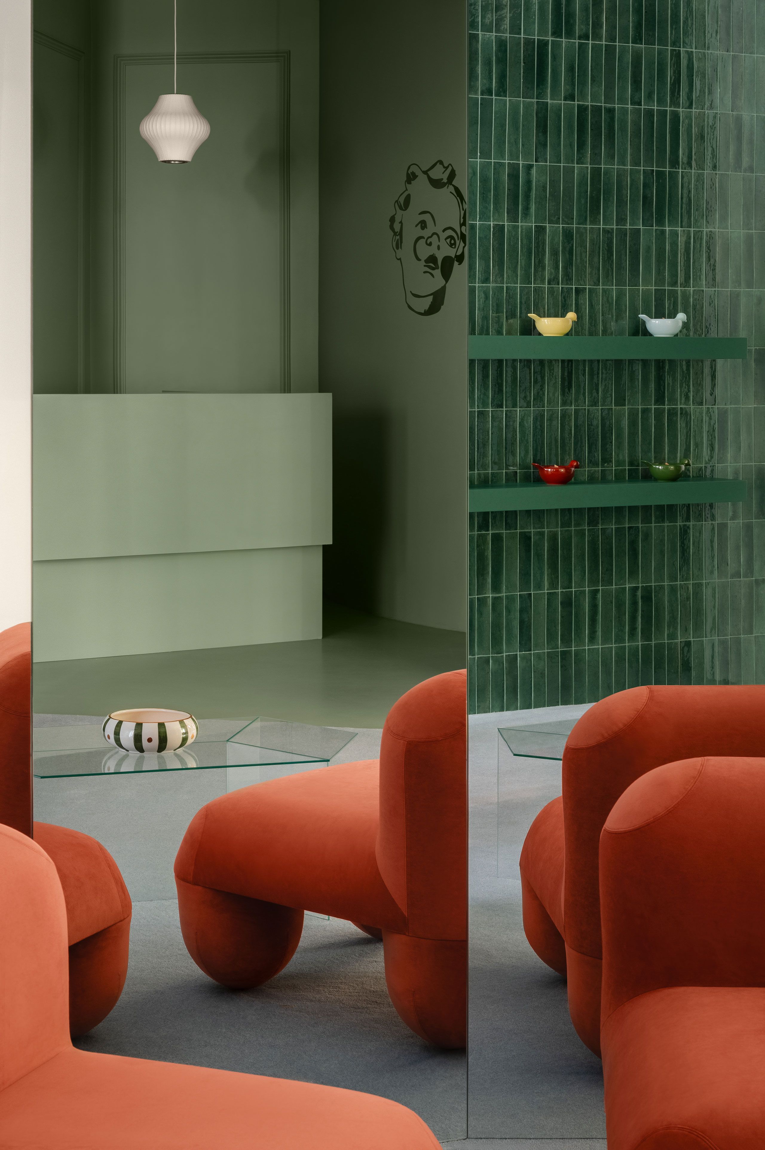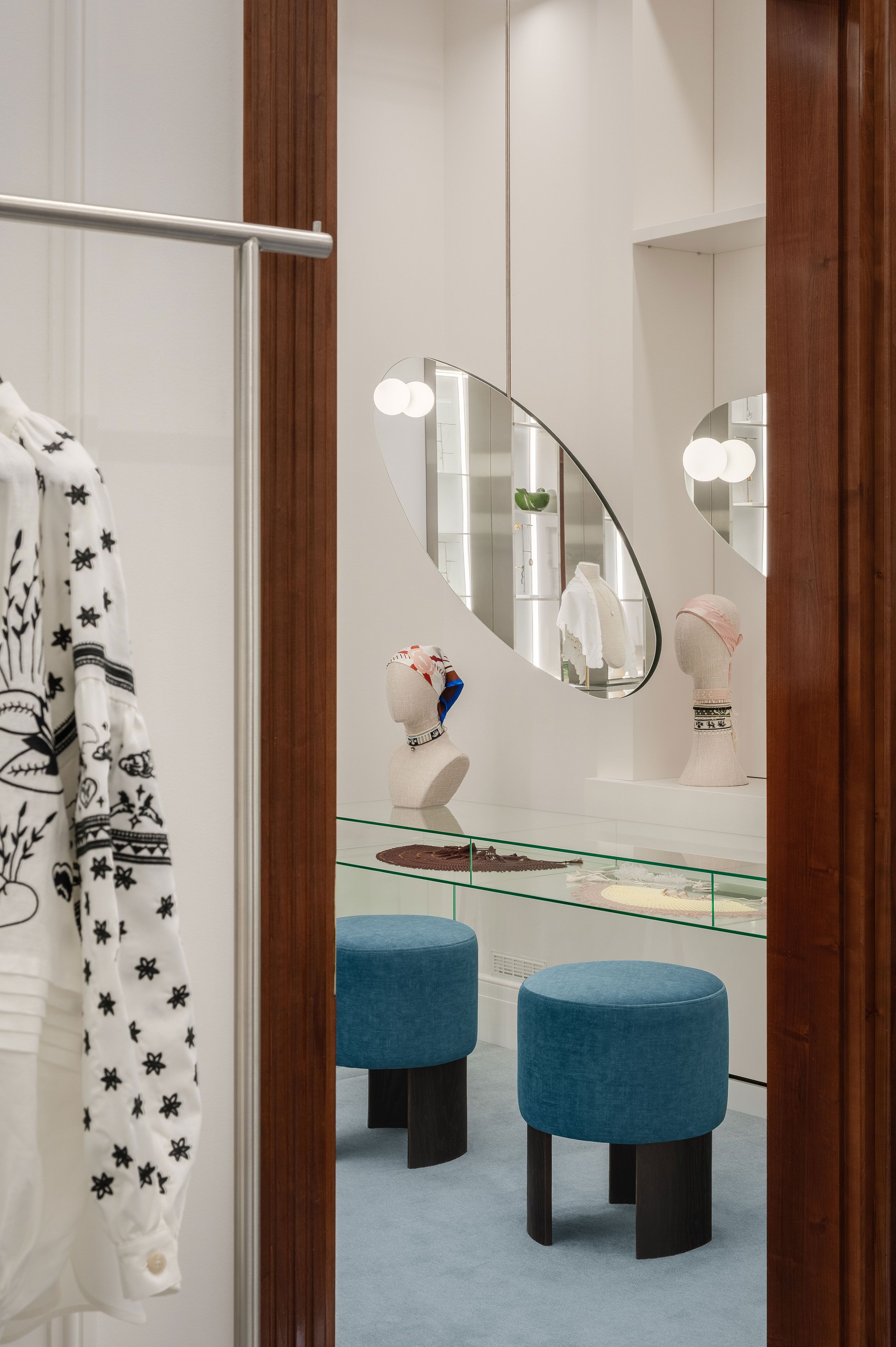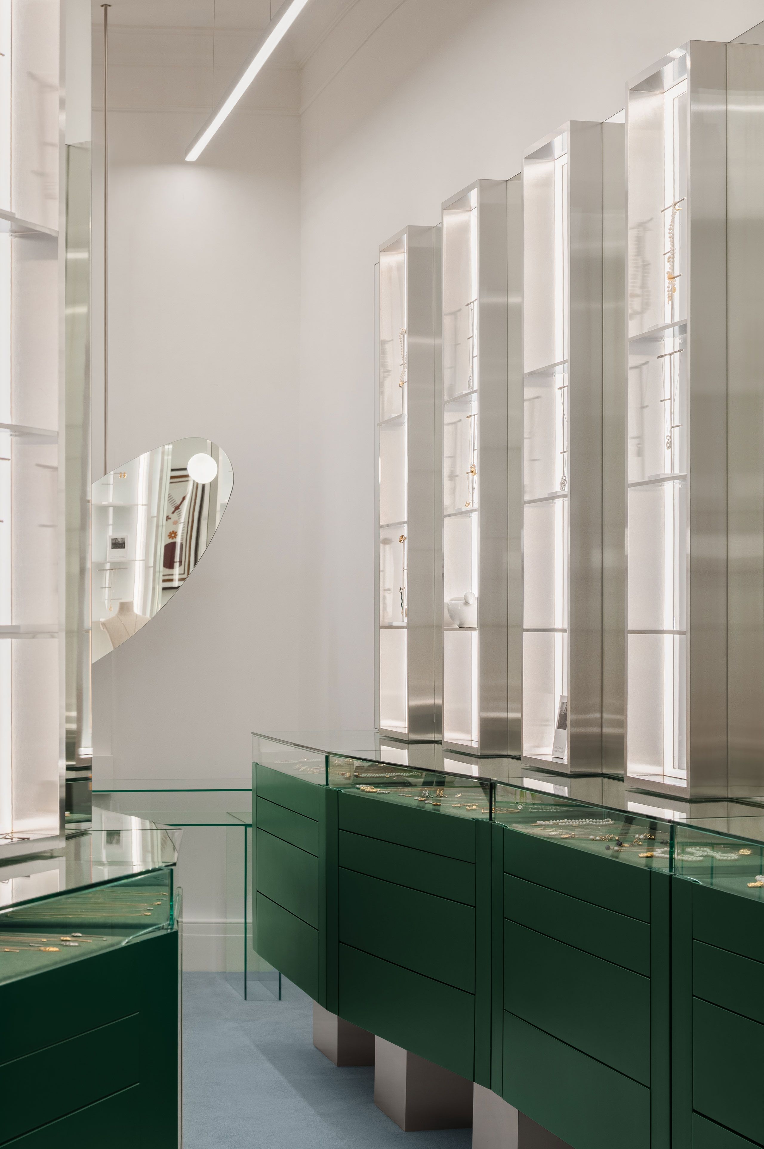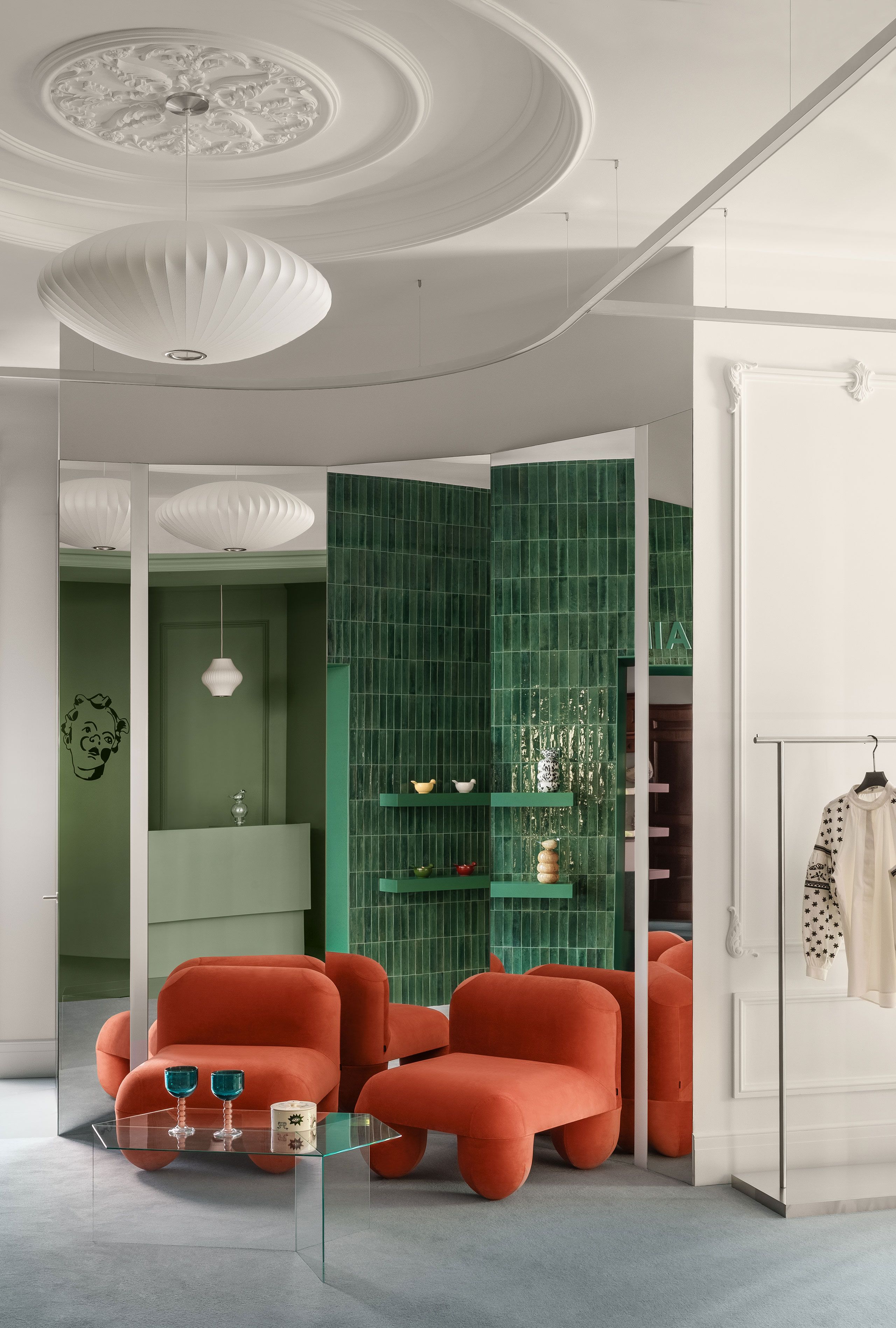 整体空间布局细腻流畅,以森林绿陶瓷墙为核心的休息区作为空间中心,陶瓷、珠宝、服饰三大展区环绕布局,各自氛围独特又靠统一材质串联一体。陶瓷厅设置沙发结合式展示基座,鼓励慢下来细细欣赏;服饰厅借助圆形地毯与定制陈设划分区域;原始橱柜后的暗门,隐秘通往私密试衣间,将保护性设计转化为空间小惊喜。