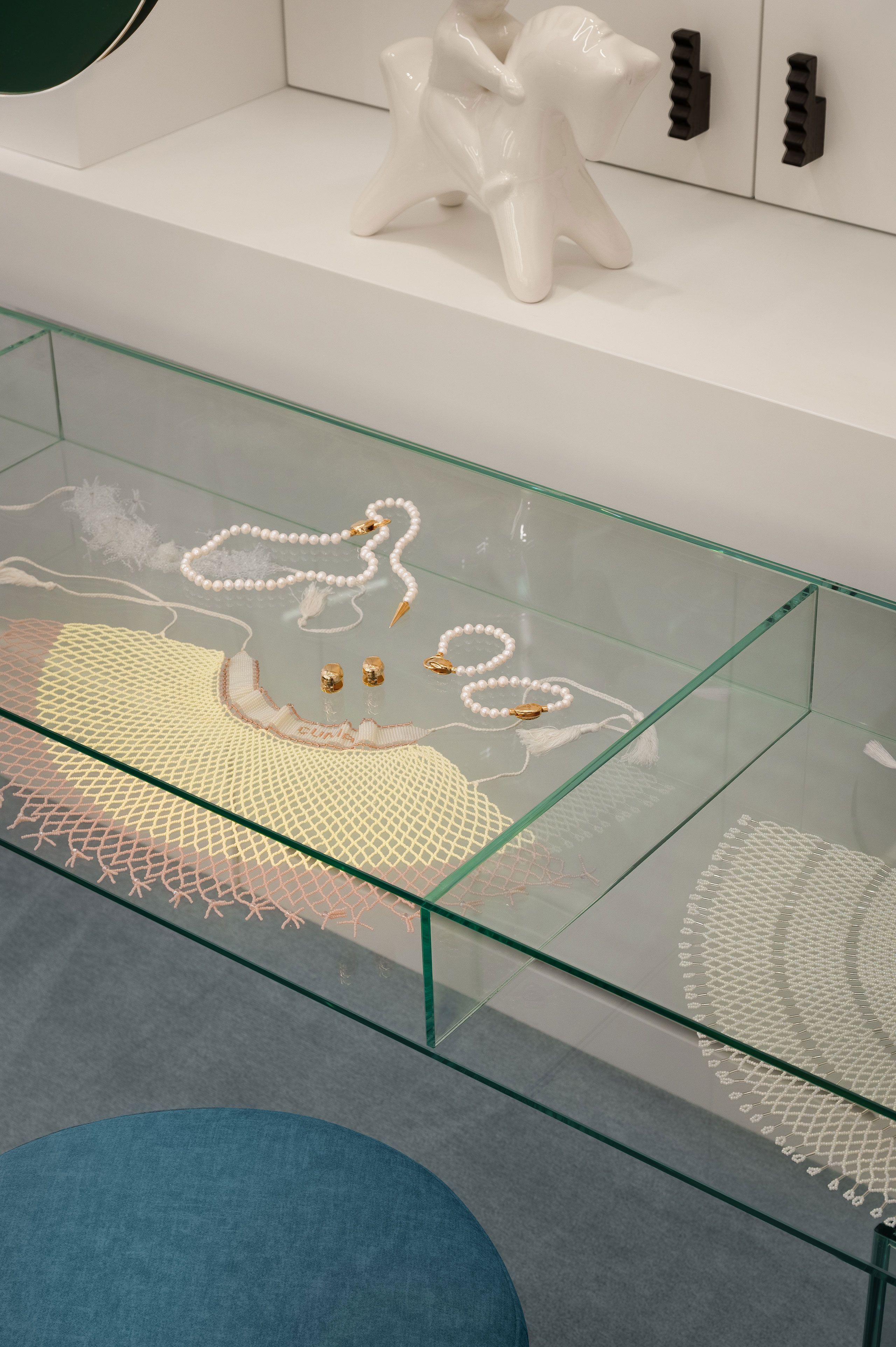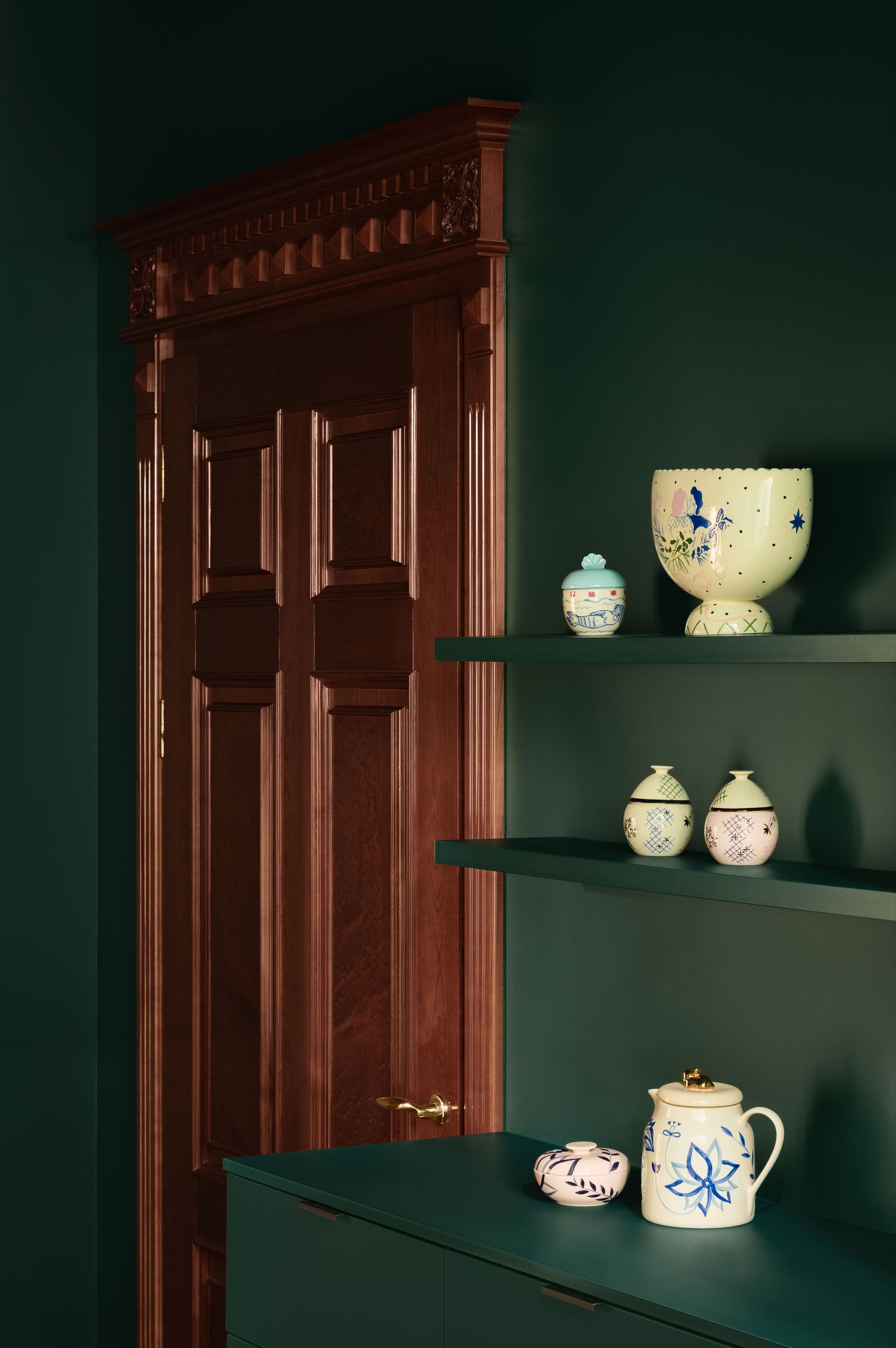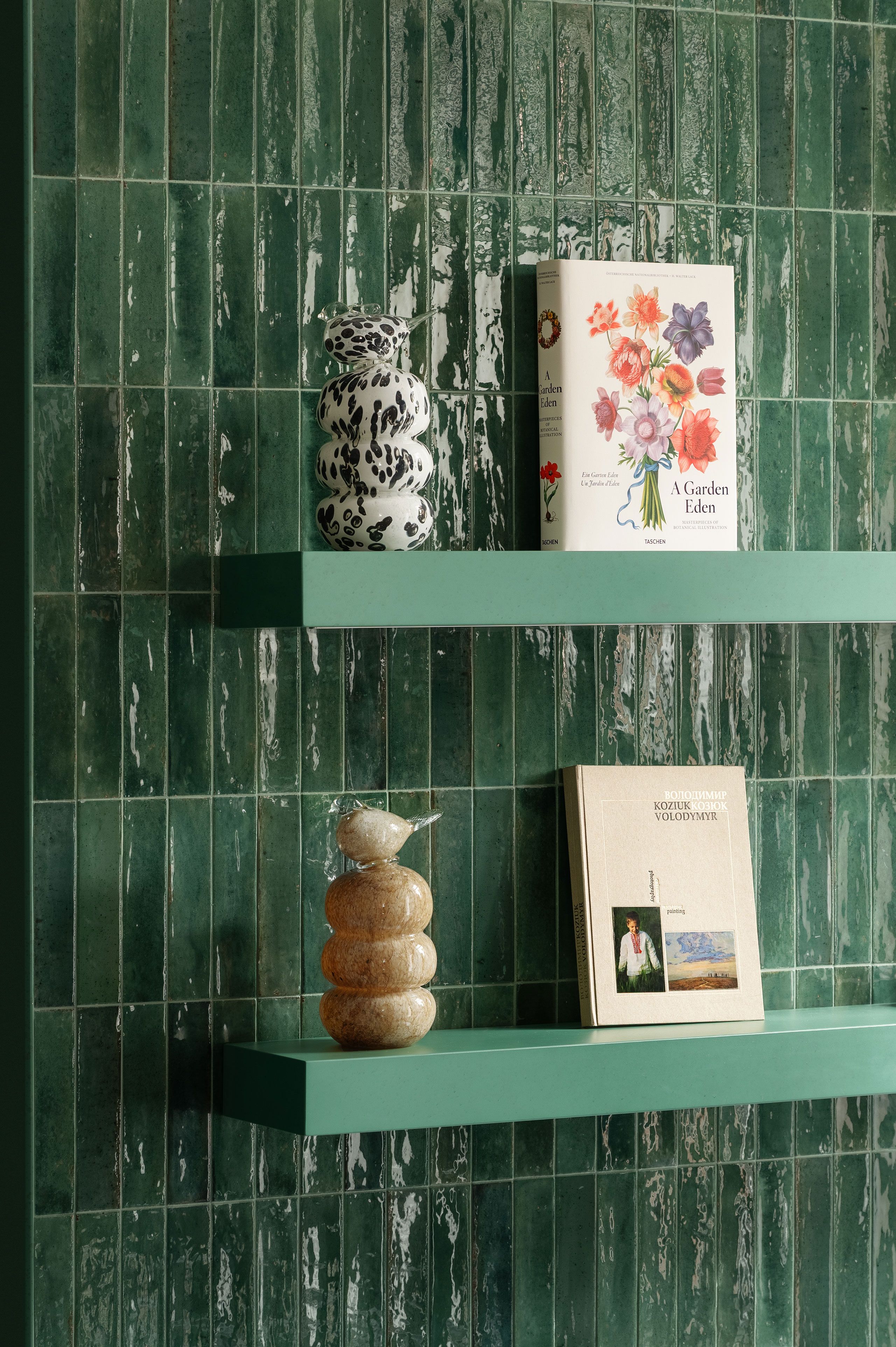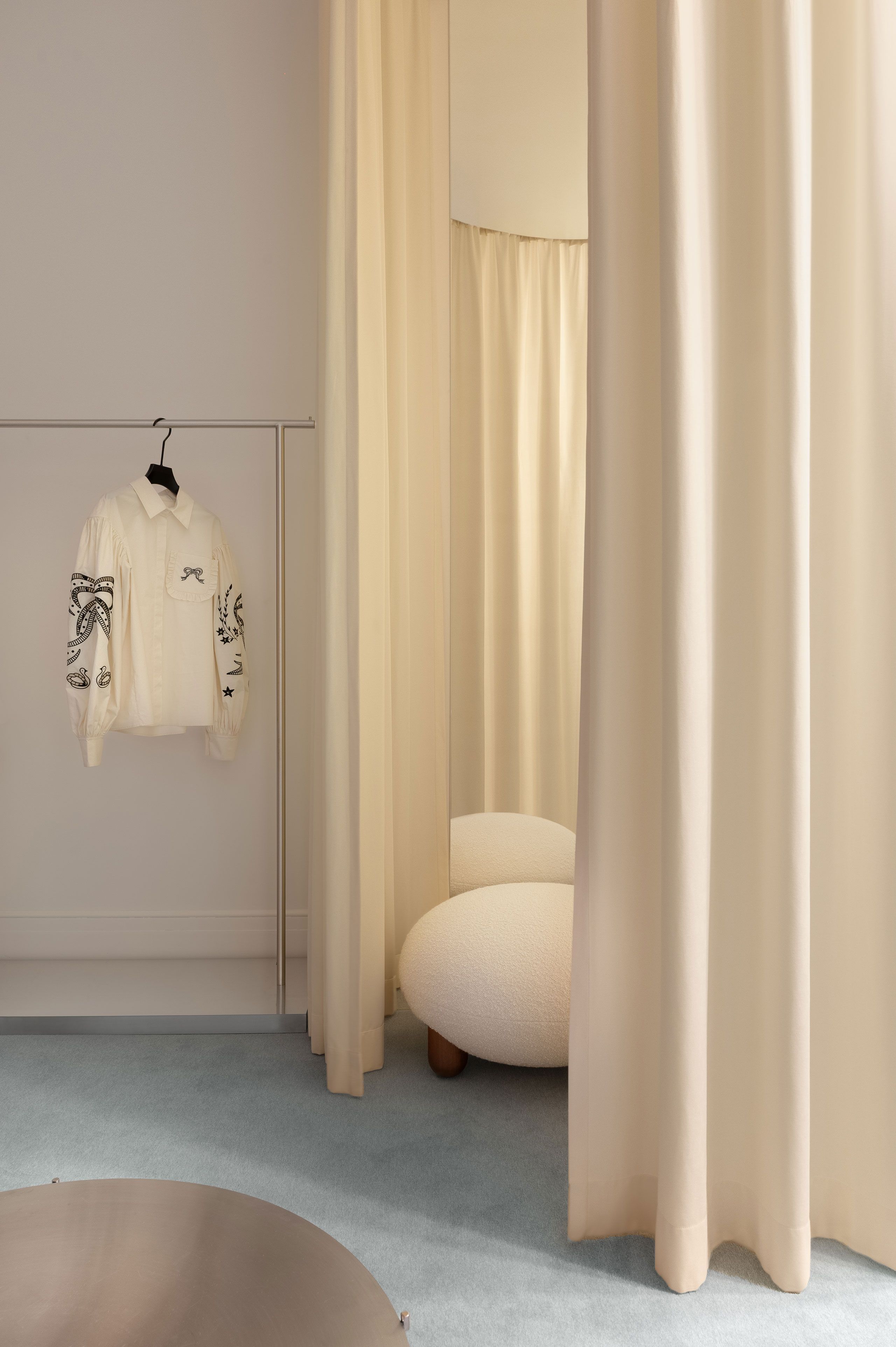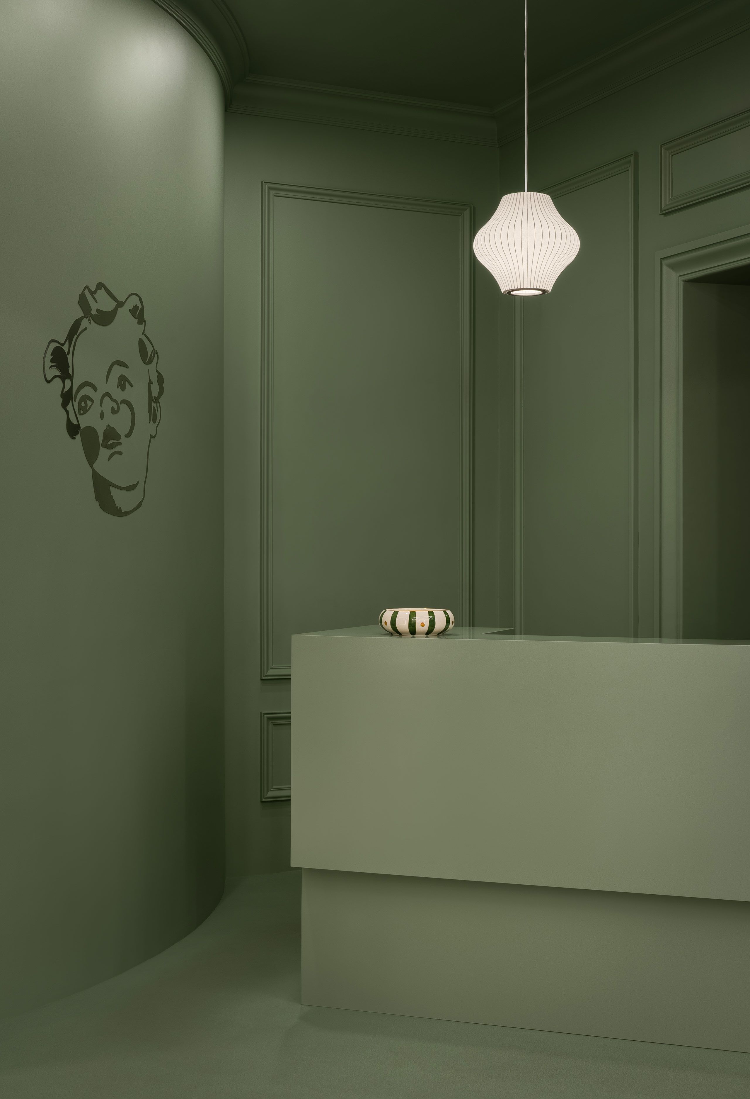 整体空间布局细腻流畅,以森林绿陶瓷墙为核心的休息区作为空间中心,陶瓷、珠宝、服饰三大展区环绕布局,各自氛围独特又靠统一材质串联一体。陶瓷厅设置沙发结合式展示基座,鼓励慢下来细细欣赏;服饰厅借助圆形地毯与定制陈设划分区域;原始橱柜后的暗门,隐秘通往私密试衣间,将保护性设计转化为空间小惊喜。