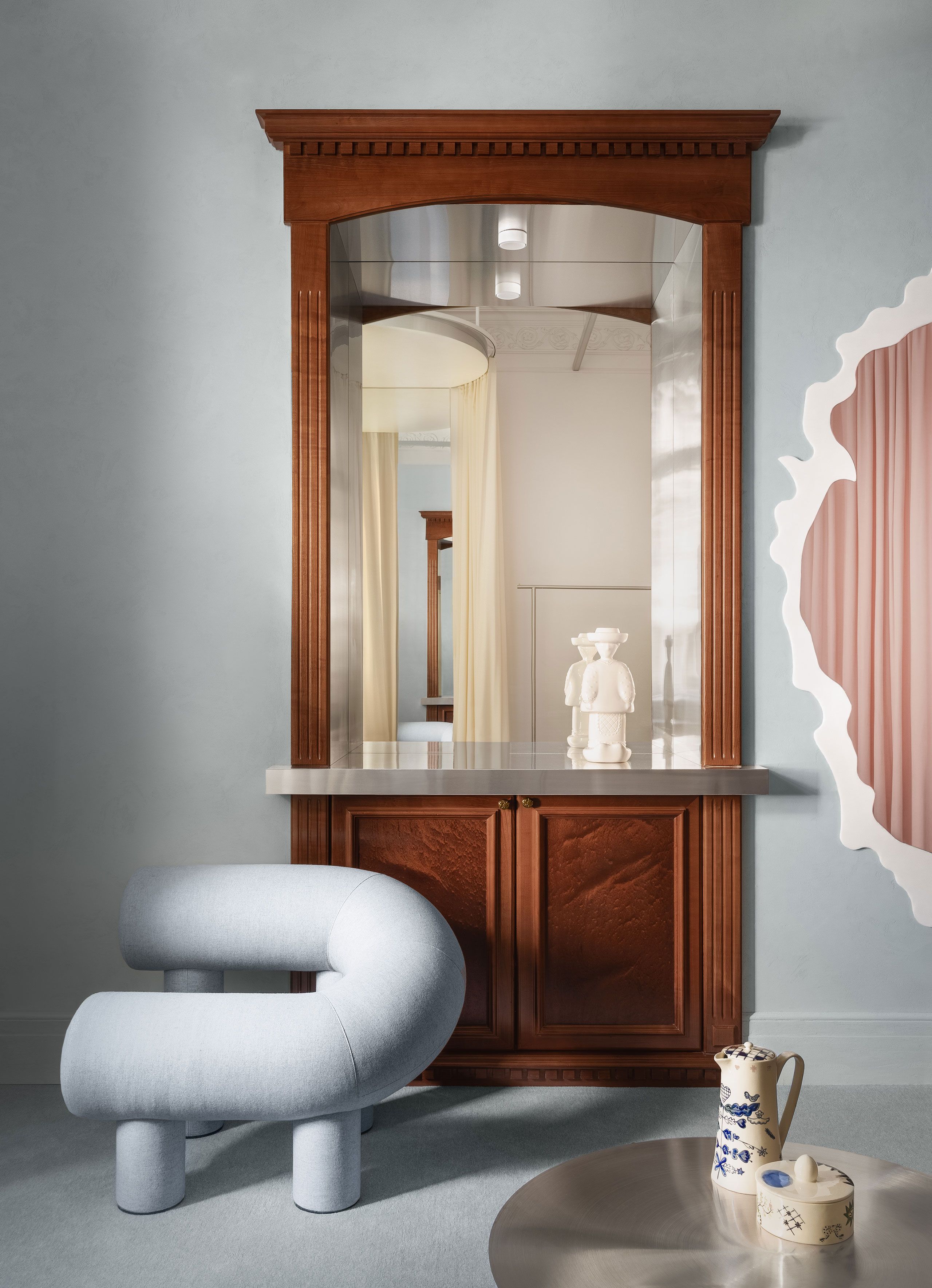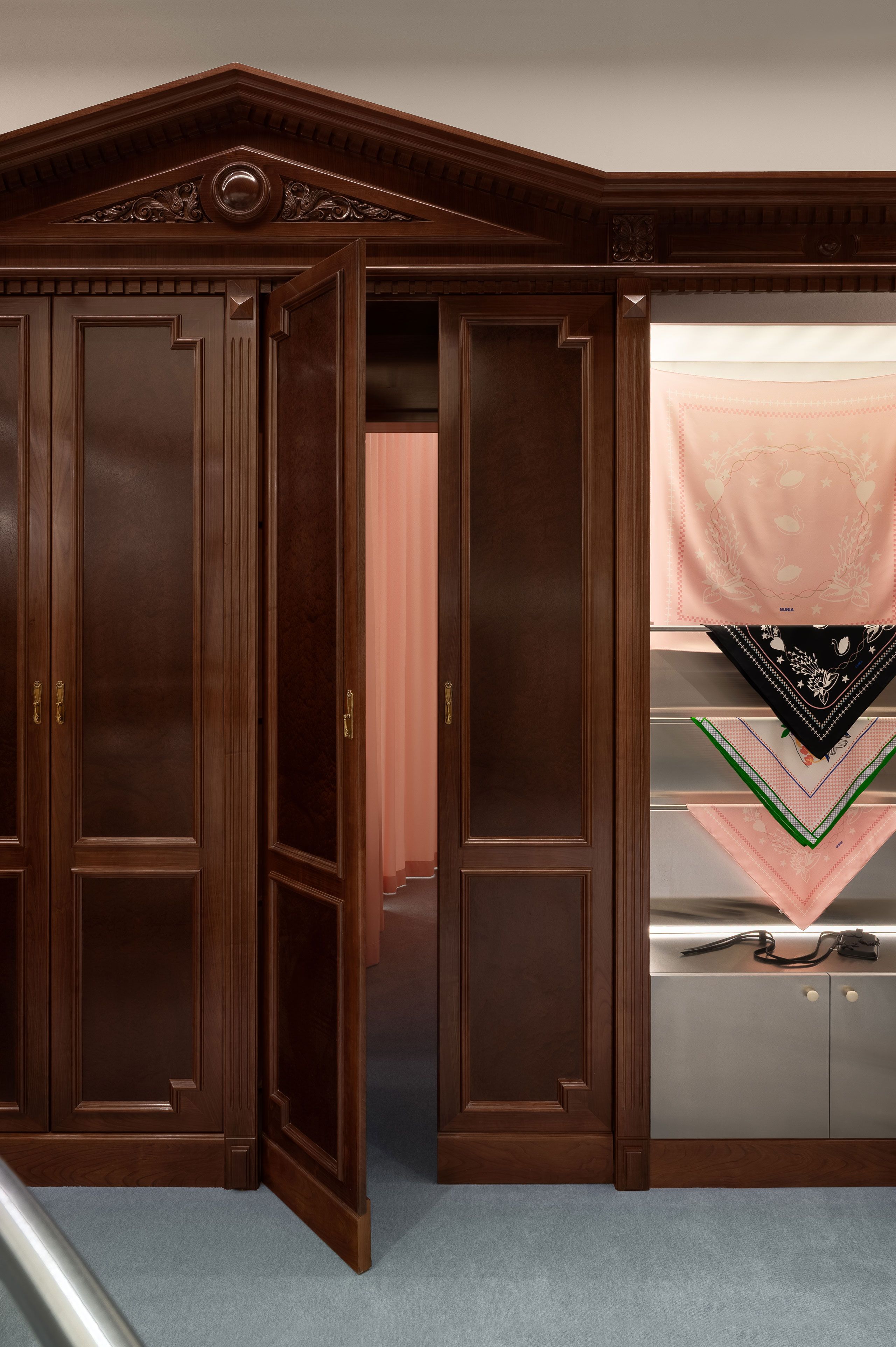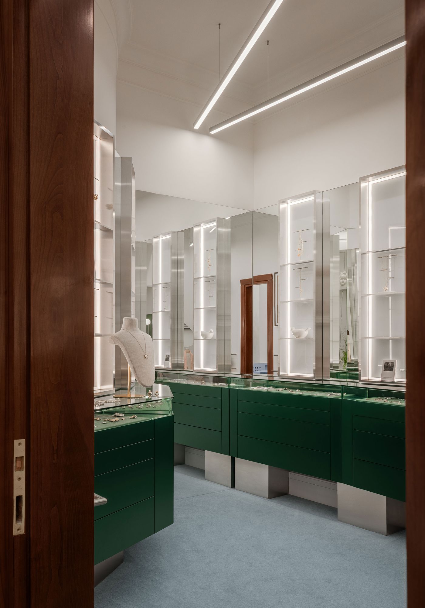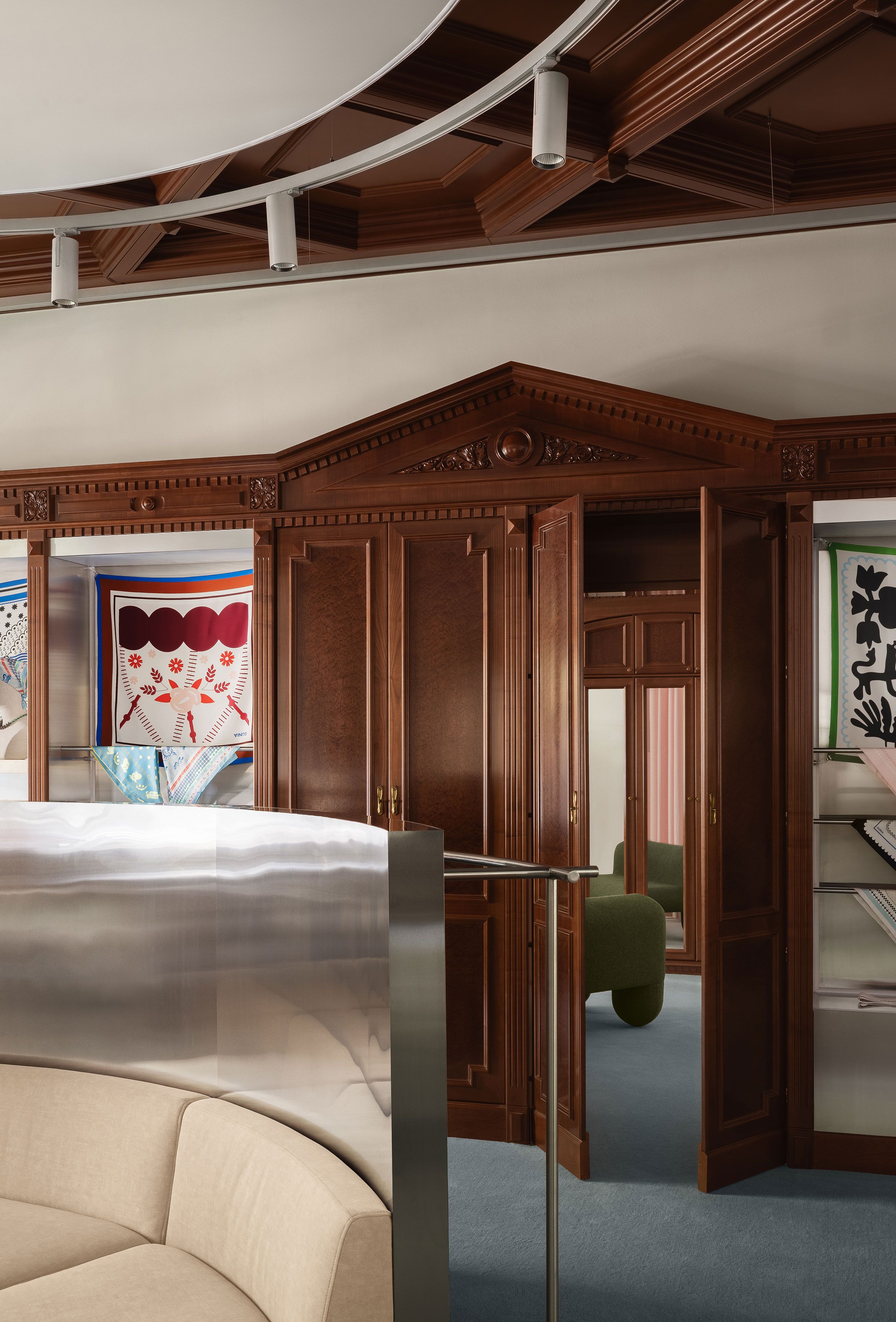 这座建筑曾是巴拿马共和国大使馆,红木墙板、雕花木门、精致装饰天花等历史构件均受保护,留存着厚重的复古底蕴。面对这份珍贵的历史肌理,设计师选择以“轻盈介入”为核心思路,极简展示系统悬于厚重复古橱柜之间,抛光铝面柔和了深色木材的庄重感,镜面元素巧妙延展视觉,弥补了自然光的不足,让新旧元素彼此相融,而非对立抗衡。