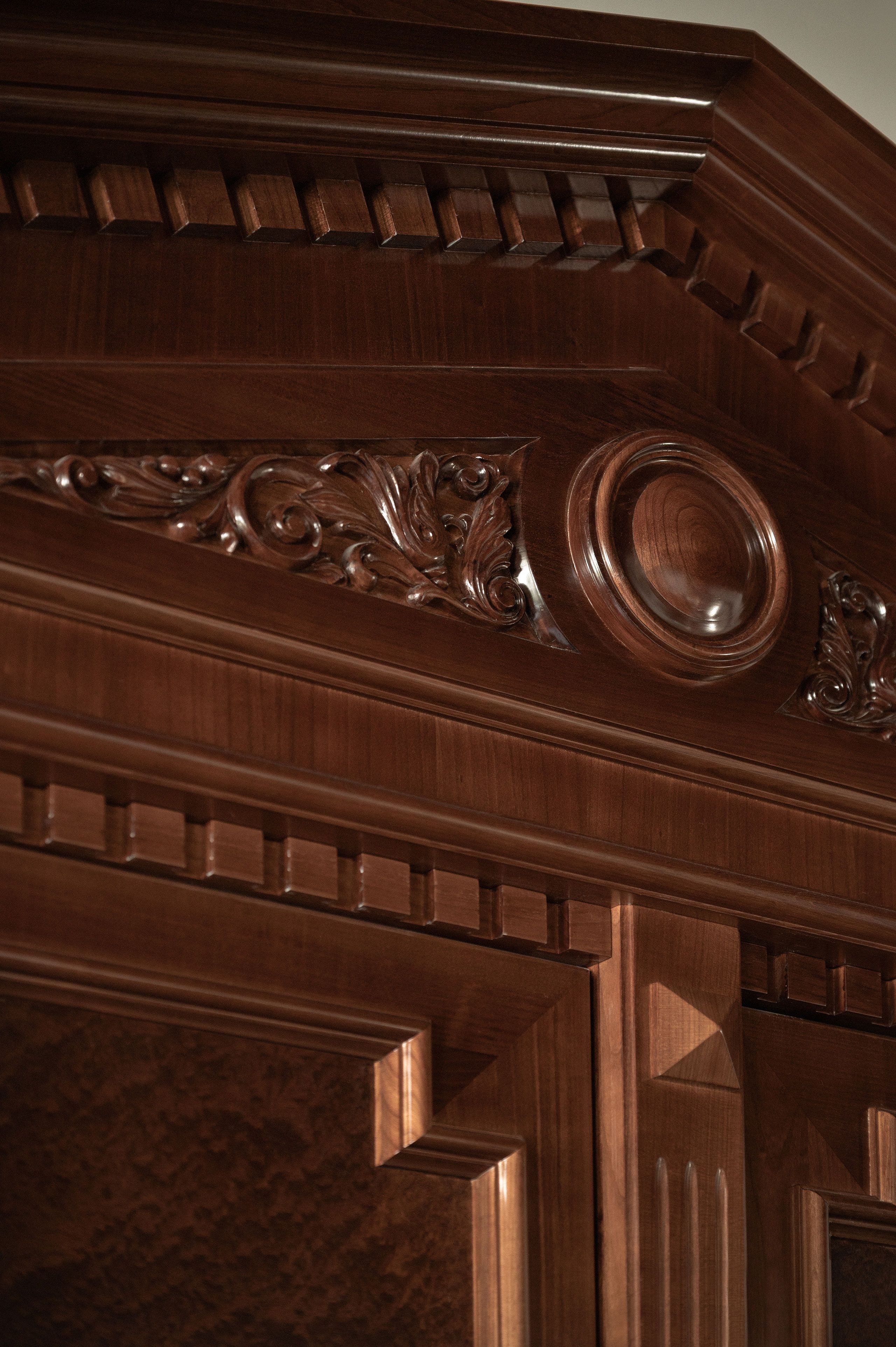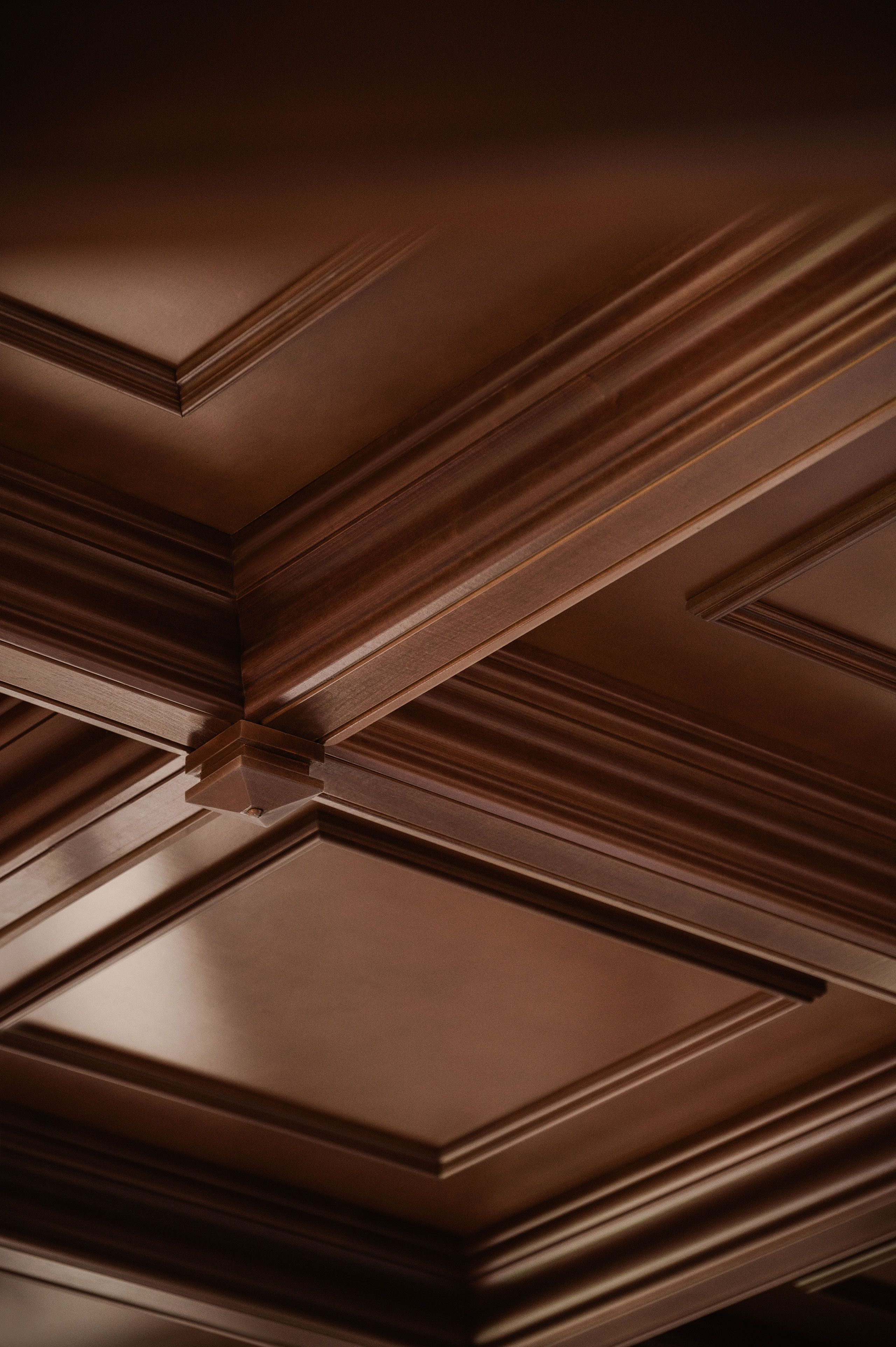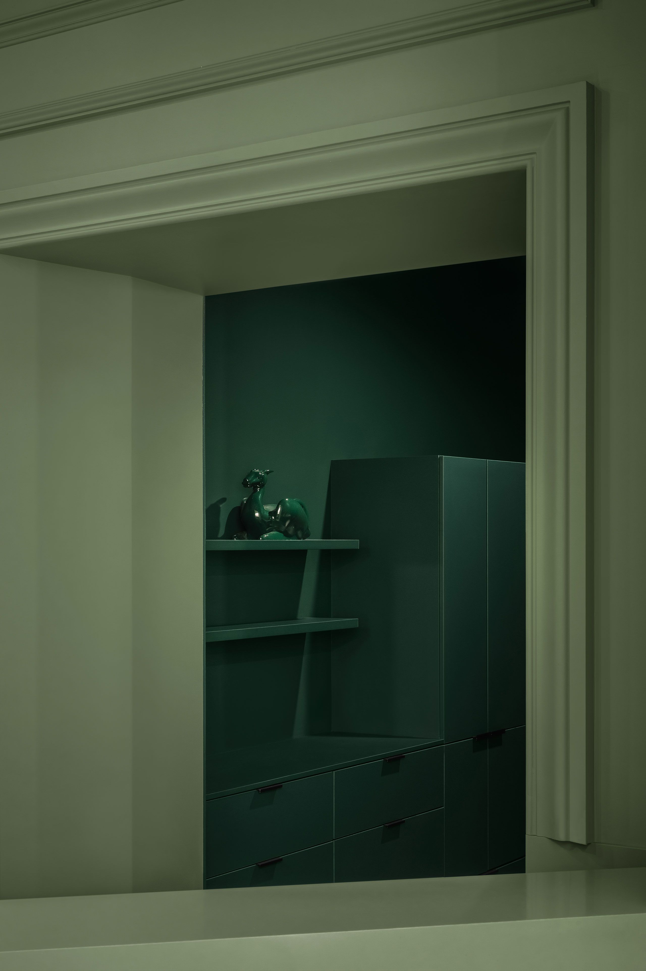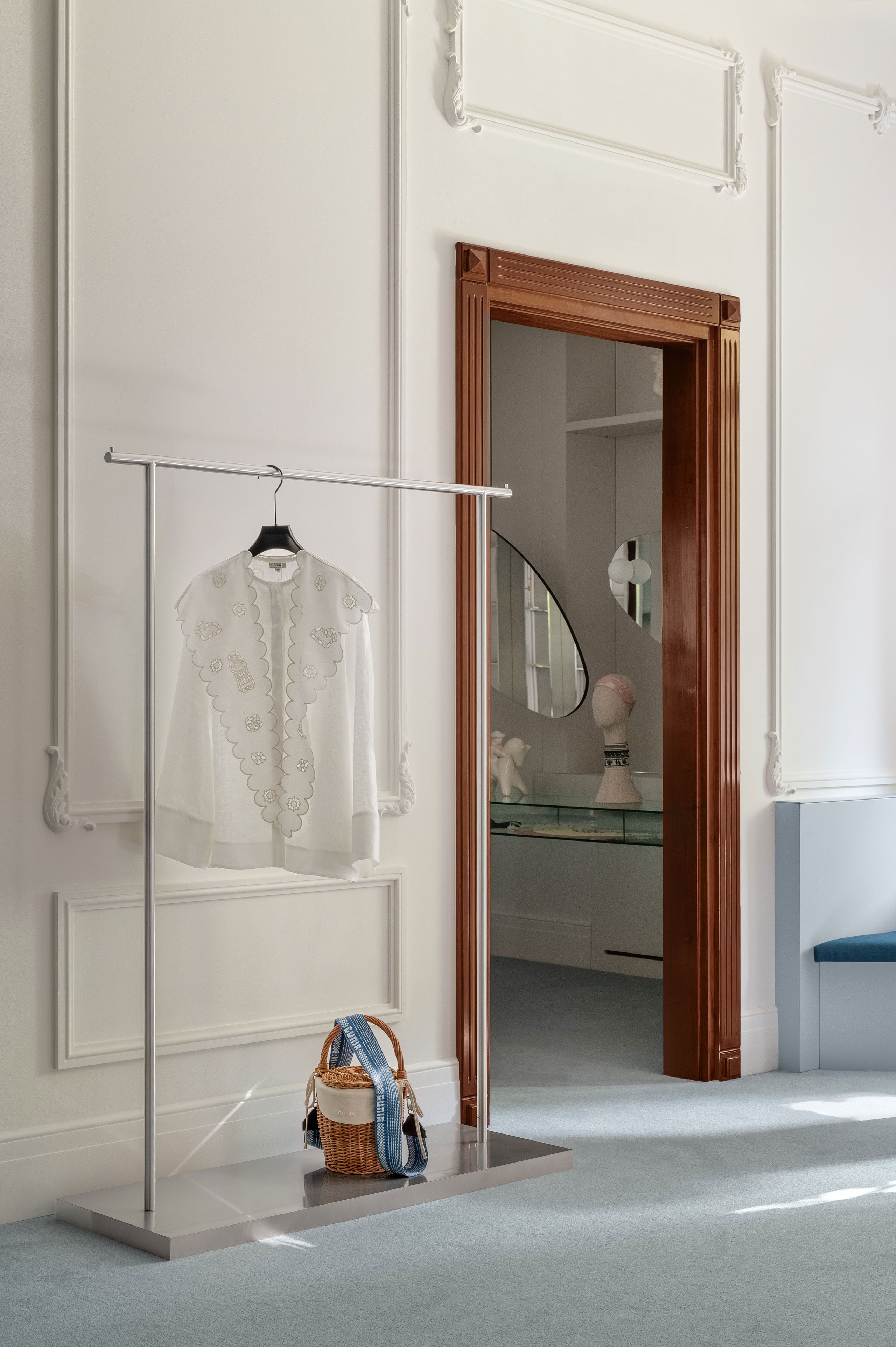 这座建筑曾是巴拿马共和国大使馆,红木墙板、雕花木门、精致装饰天花等历史构件均受保护,留存着厚重的复古底蕴。面对这份珍贵的历史肌理,设计师选择以“轻盈介入”为核心思路,极简展示系统悬于厚重复古橱柜之间,抛光铝面柔和了深色木材的庄重感,镜面元素巧妙延展视觉,弥补了自然光的不足,让新旧元素彼此相融,而非对立抗衡。