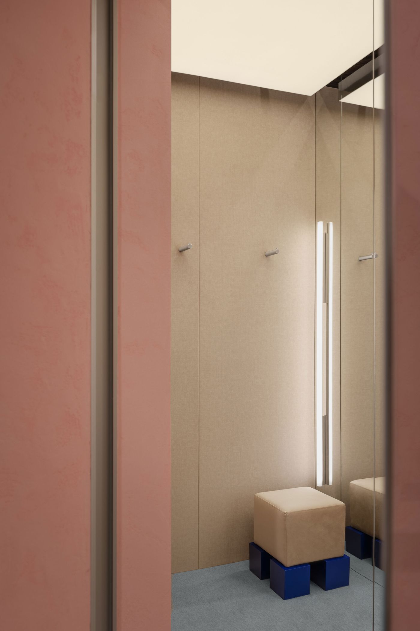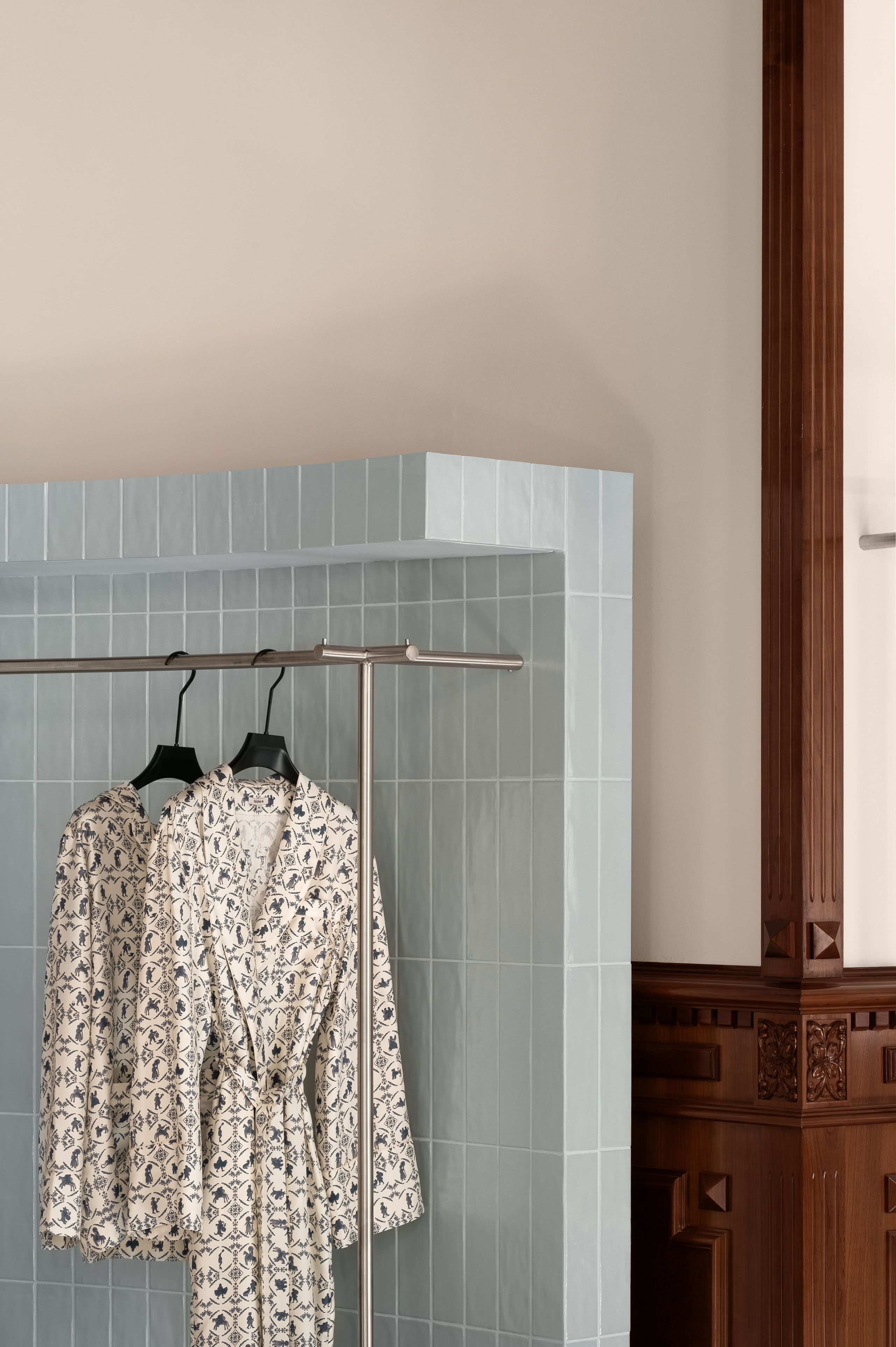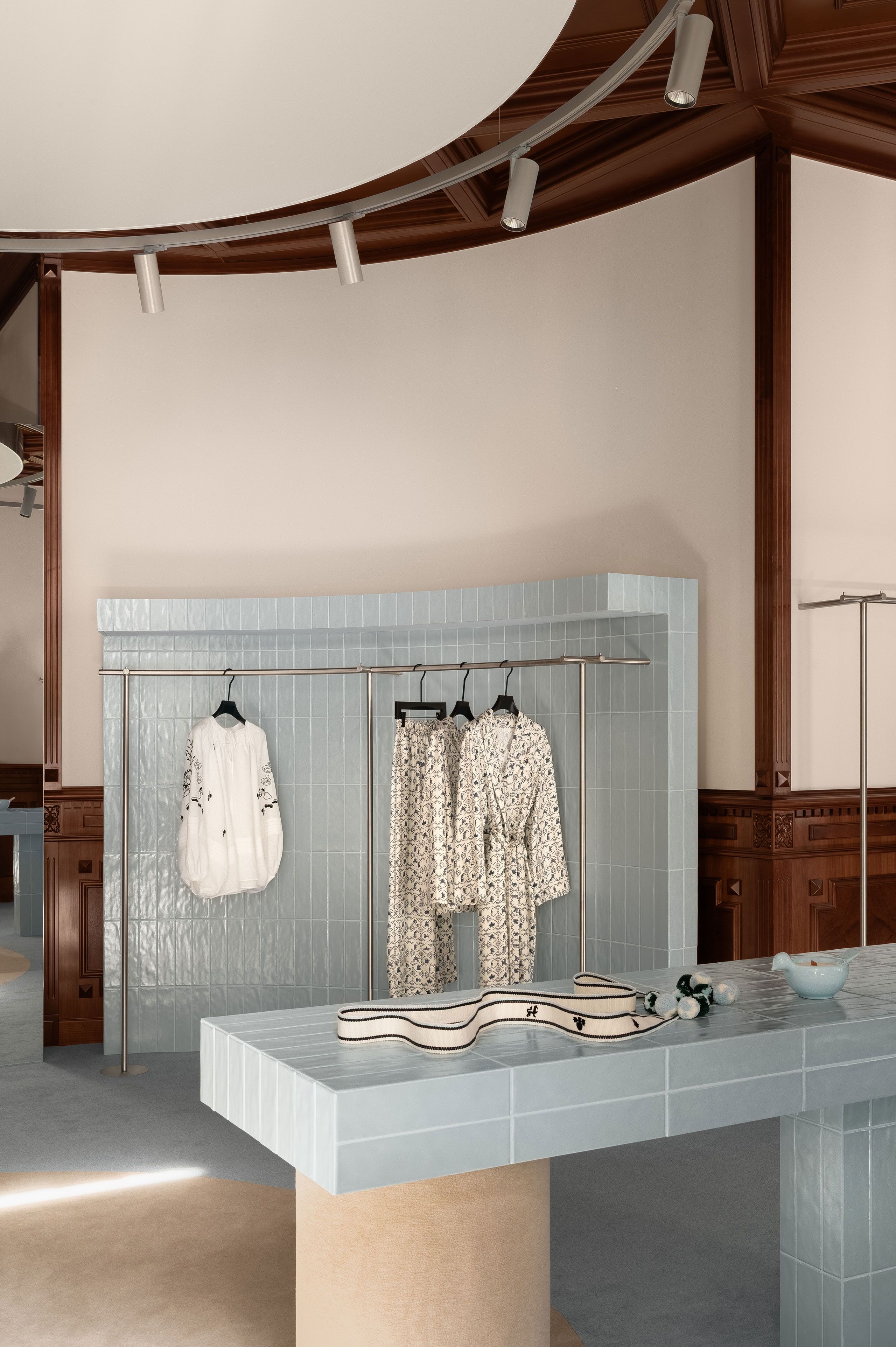 陶瓷作为品牌核心语言,更是升级为空间的核心建筑材质。手工铺贴的光泽瓷砖覆盖墙面与台面,细腻肌理与金属、玻璃的光滑质感形成精巧对比;地毯弱化空间声响,布艺灯饰宛如柔和雕塑,共同营造出居家般的温暖亲切感。
