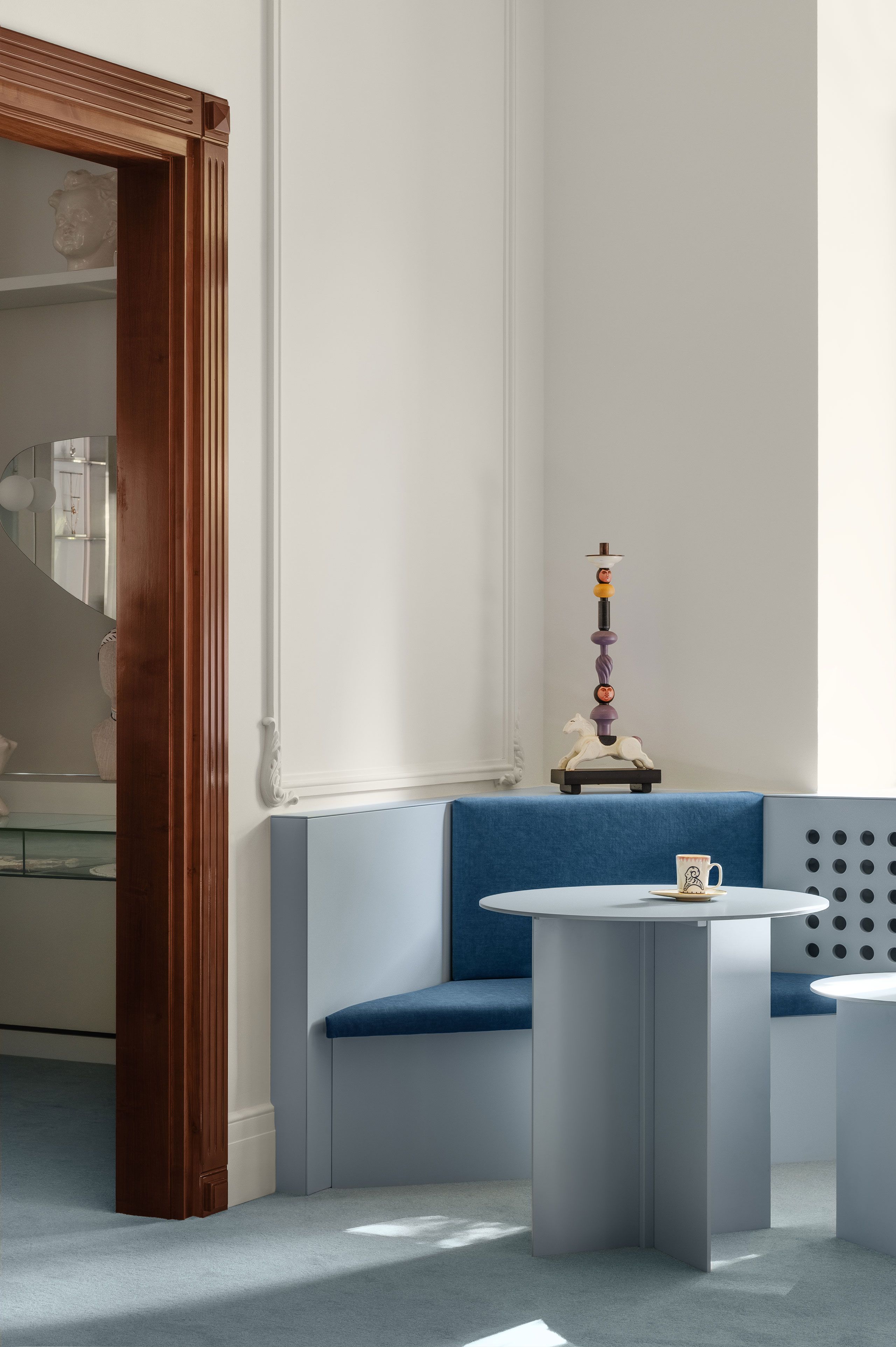 色彩成为空间的另一重温柔表达,从品牌视觉中提炼的森林绿、鼠尾草绿、粉蓝与浅粉,如同花园晨雾般,轻柔晕染在瓷砖墙面、软包座椅与展示基座上。这些低饱和色调中和了红木的深邃厚重,营造出既不怀旧沉闷、也不冷峻疏离的静谧氛围,打造出让人愿意驻足、触摸、沉浸的亲密空间感。