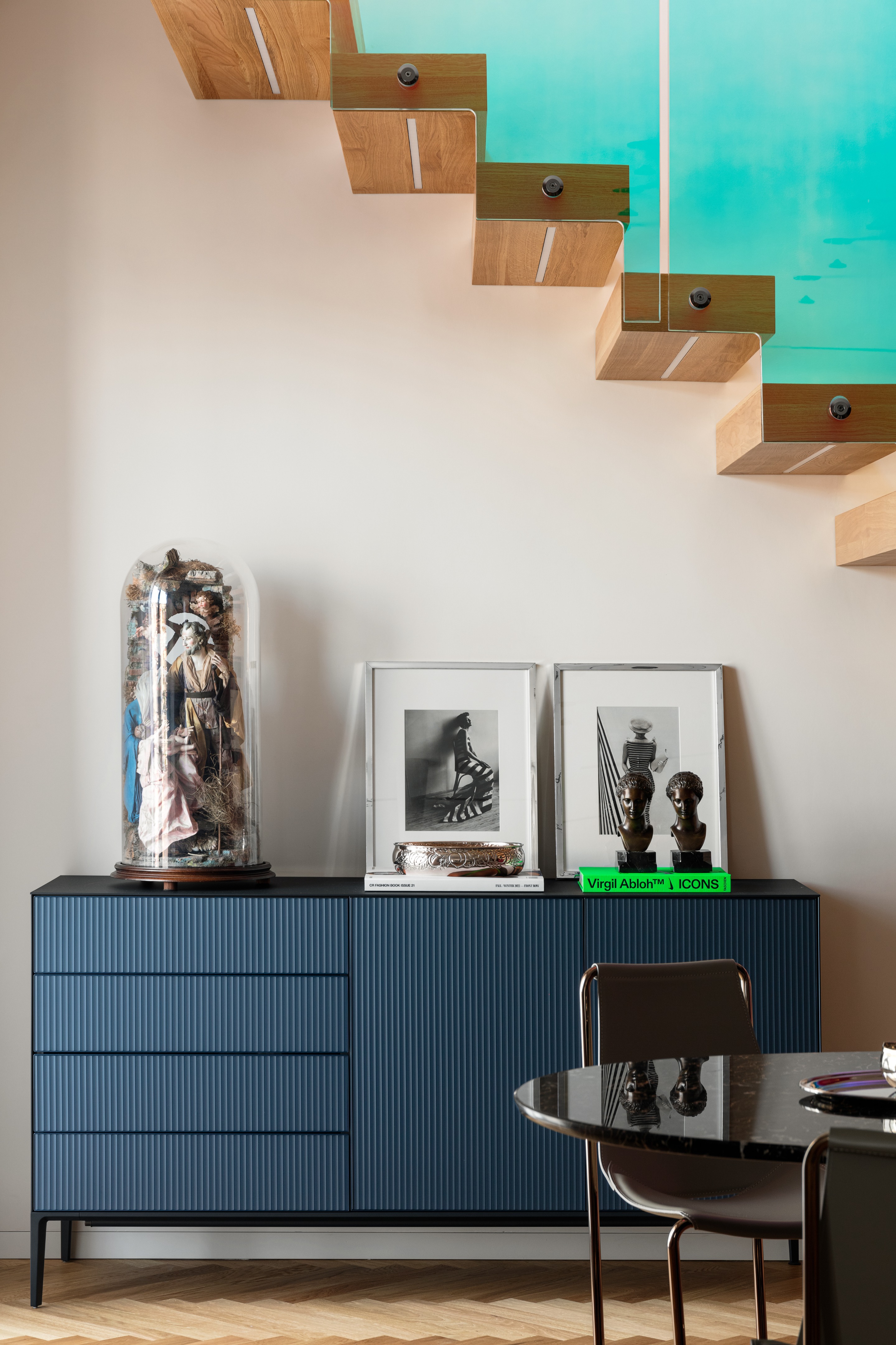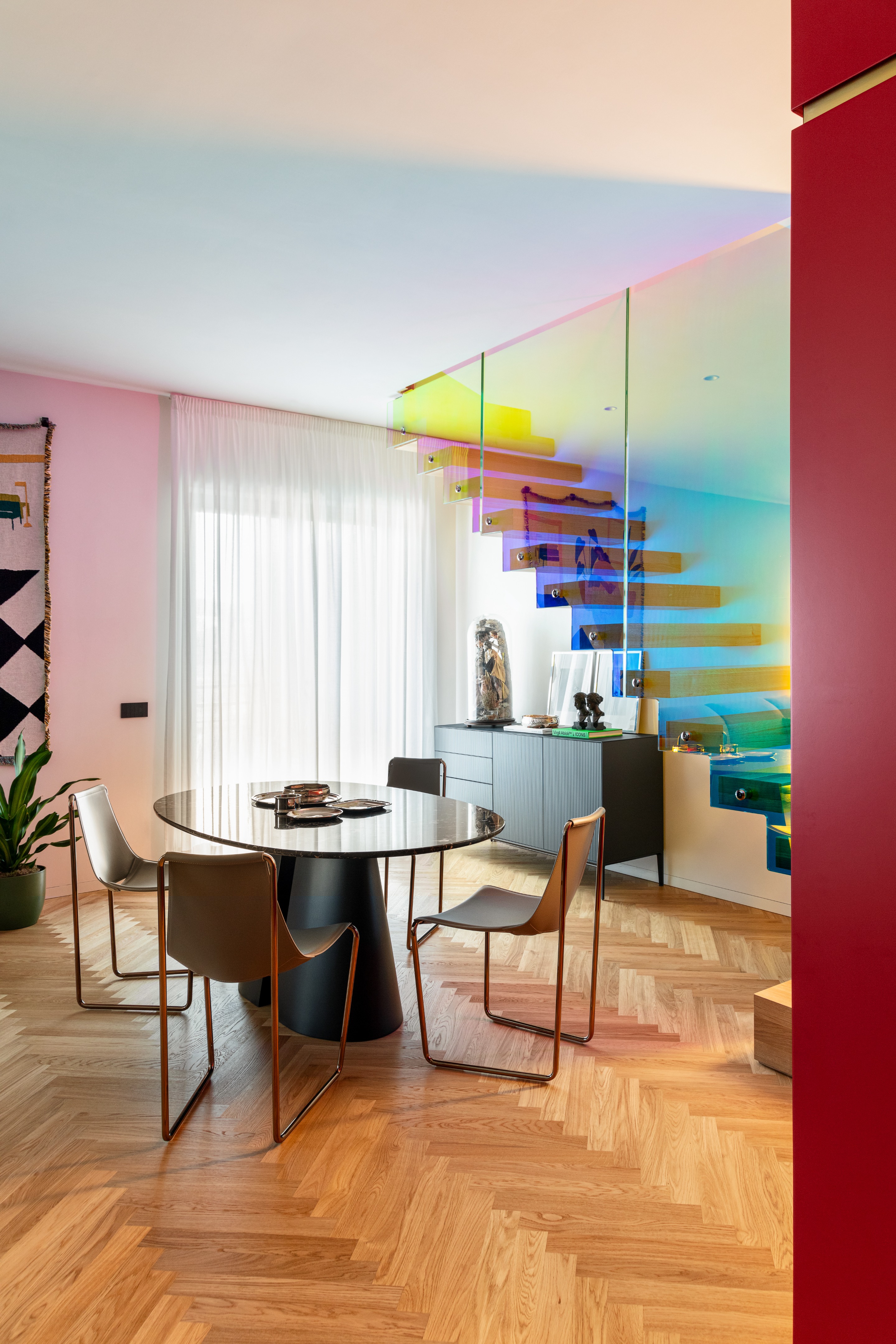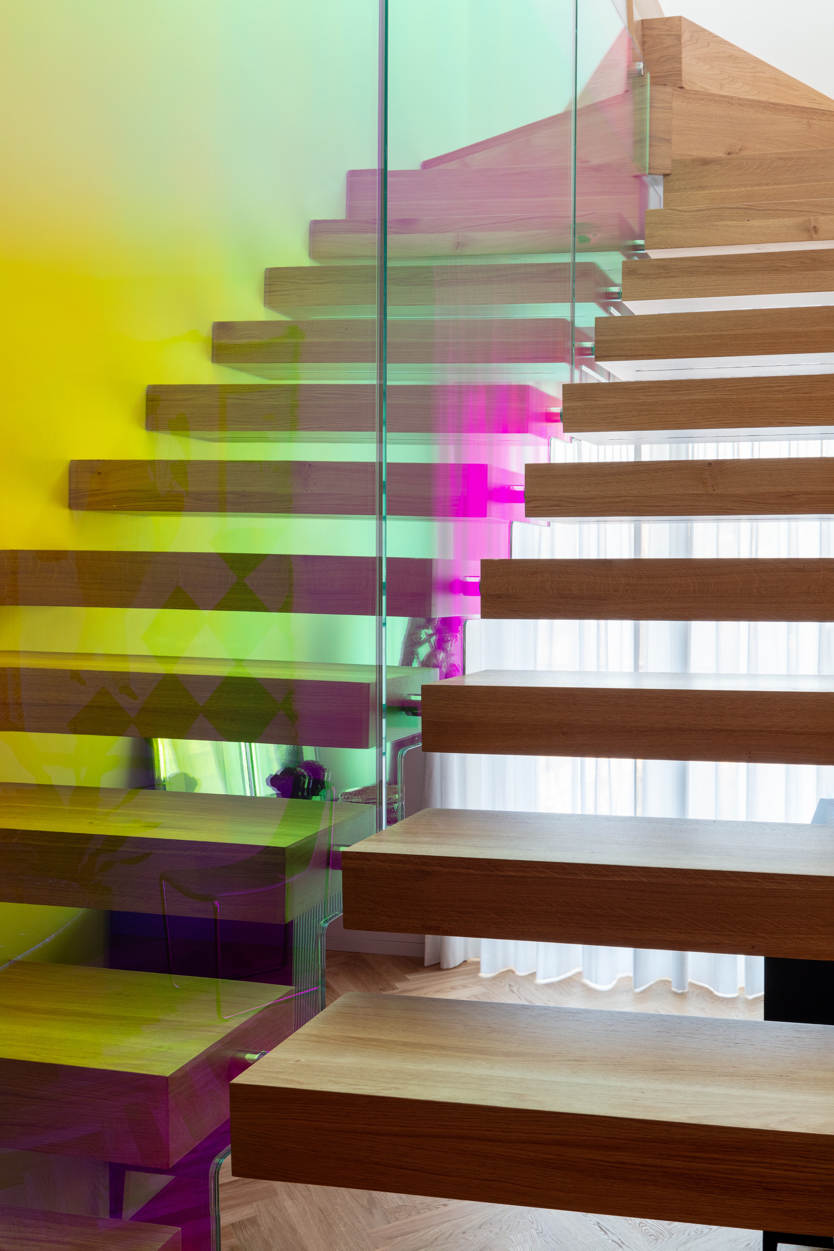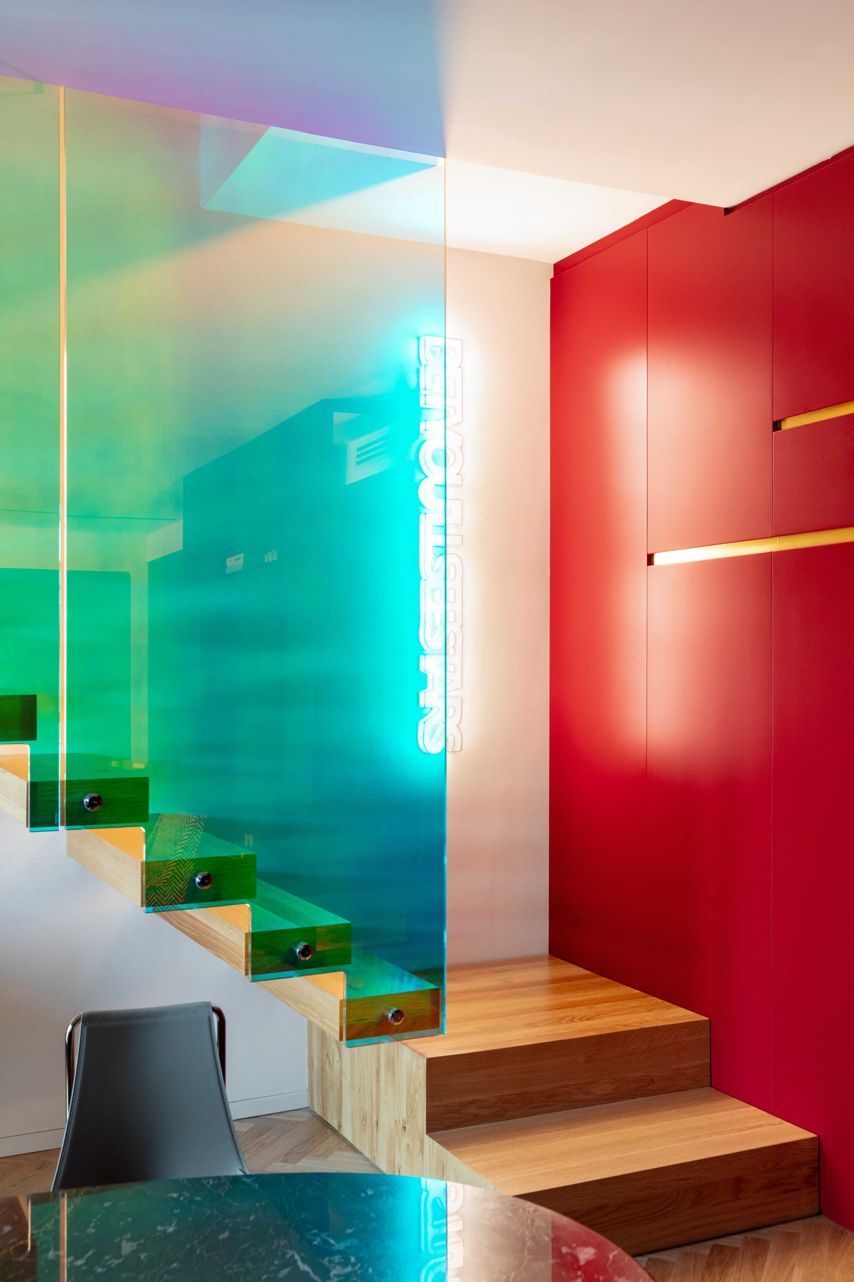连接上下两层的彩色楼梯,是整个空间的视觉焦点,更是串联起所有功能区的核心纽带。楼梯采用二向色玻璃打造,光线流转间色彩不断变幻,灵动又富有艺术感,顺着楼梯而上,便是充满烟火气的家庭核心区,厨房、室内外休闲区彼此连通,夫妇二人坦言,烹饪是他们放松身心的方式,开放式的布局让家人时刻能相伴相处,也方便招待来访的亲友,让宽敞的空间多了几分温馨烟火气。