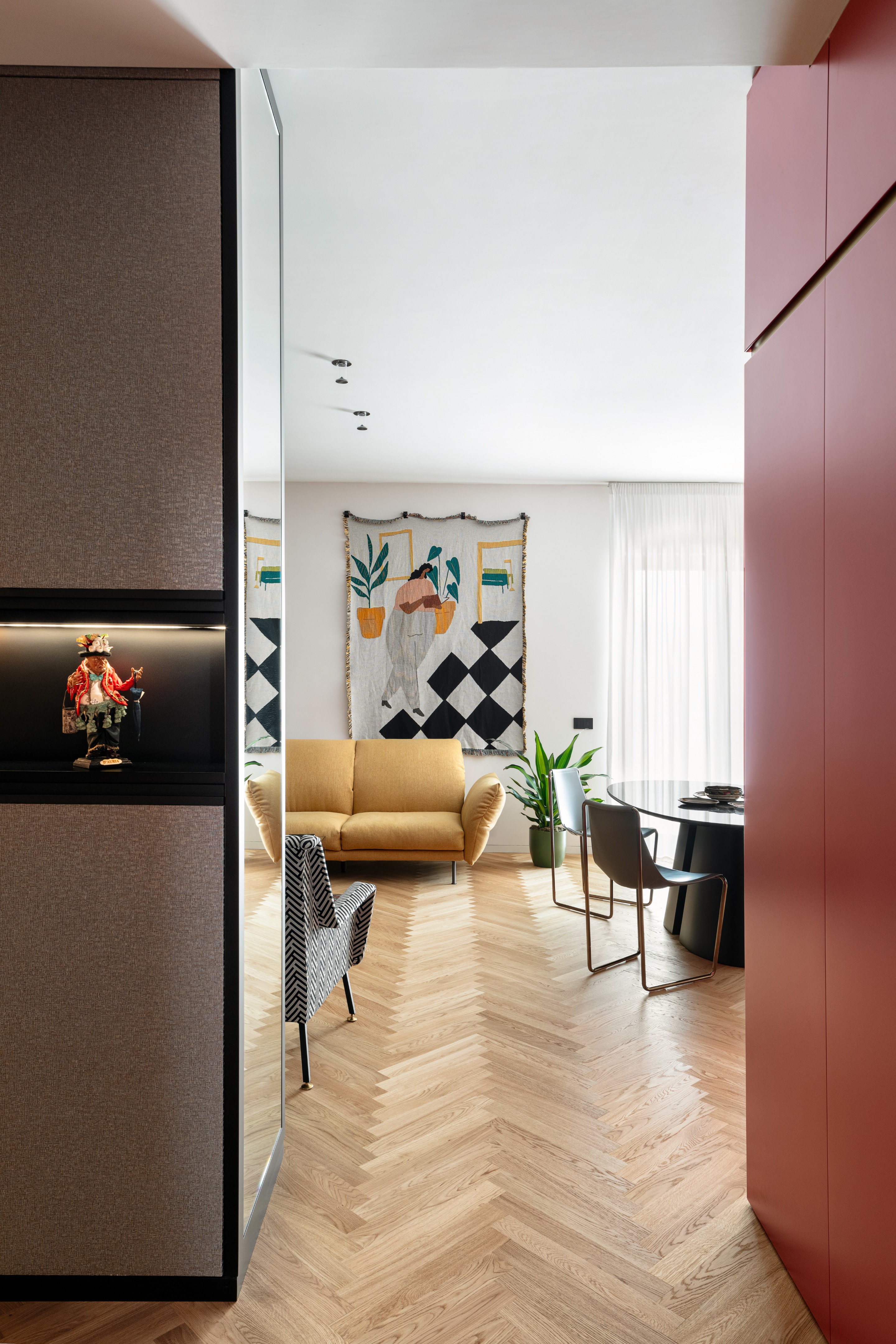 色彩是这套作品最鲜明的灵魂,设计师摒弃了柔和寡淡的浅色调,大胆选用极具张力的配色,其中客厅背景柜的卡地亚红色调,更是成为空间的点睛之笔。业主最初也曾犹豫是否选用柔和色系,最终却庆幸选择了这份大胆,这份浓烈色彩恰好契合时尚行业的张扬个性,也让整个空间有了独特的记忆点。除此之外,设计师还将1970年代现代古董、那不勒斯传统家居与新款家具混搭摆放,把家族旧物、地域传统与时尚热爱相融,打破既定风格的束缚,让空间既有复古底蕴,又不失现代活力。