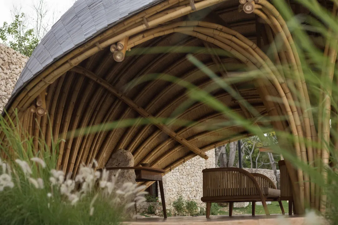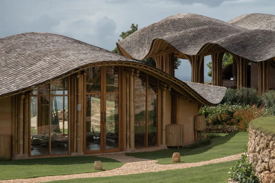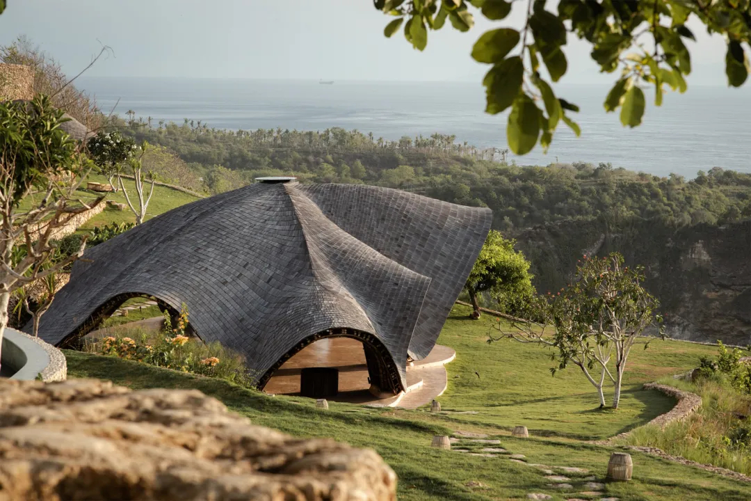 执掌这个项目的,是深耕巴厘岛本土生态设计的Pablo Luna Studio设计团队,他们深谙巴厘岛海岛自然肌理,全程摒弃重型混凝土建材与高耗能工业工艺,坚持就地取材、顺应自然的核心设计理念,把当地原生的竹子、天然石灰石与传统夯土作为核心建筑材料,打造出这套通透轻盈、坚固耐用的低耗生态建筑群。不同于普通滨海度假屋的厚重感,整座静修中心通体透着海岛独有的松弛感,屋顶铺设的乌林木瓦会随着海风侵蚀与日光照射,慢慢褪去原本的色泽,逐渐变为温润的银灰色,在时光流转中与巴厘岛的海风、海浪、日照共生,留下独属于这片崖岸的岁月痕迹。