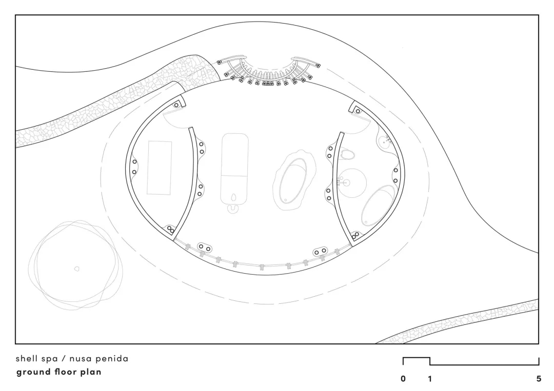 站在珀尼达岛悬崖高处俯瞰,Intaaya的整体轮廓自带流动的海洋韵律,每一处建筑造型都藏着对海洋生物的致敬,没有刻意雕琢的痕迹,却处处呼应着深海与岸线的灵动。主入口的壳牌大堂,形似一只静栖在崖边的海蟹,圆润穹顶温柔包裹着公共空间,线条柔和又极具辨识度;餐厅顶部复刻巨蛤张合的自然形态,舒展的曲线顺着海风方向延伸,通透格局让海景毫无遮挡地涌入室内;茶室则采用斜顶设计,两端微微上扬翘起,宛若鱼尾轻摆拂过海面,灵动又雅致。顺着崖间蜿蜒的原生态小径缓步向下,依次穿过无边泳池、海景瑜伽室与沉浸式SPA空间,建筑位置一步步靠近悬崖边缘,视野随之逐层开阔,脚步所至,仿佛真的顺着陆地走向无垠深海,彻底沉浸在巴厘岛的山海之间。