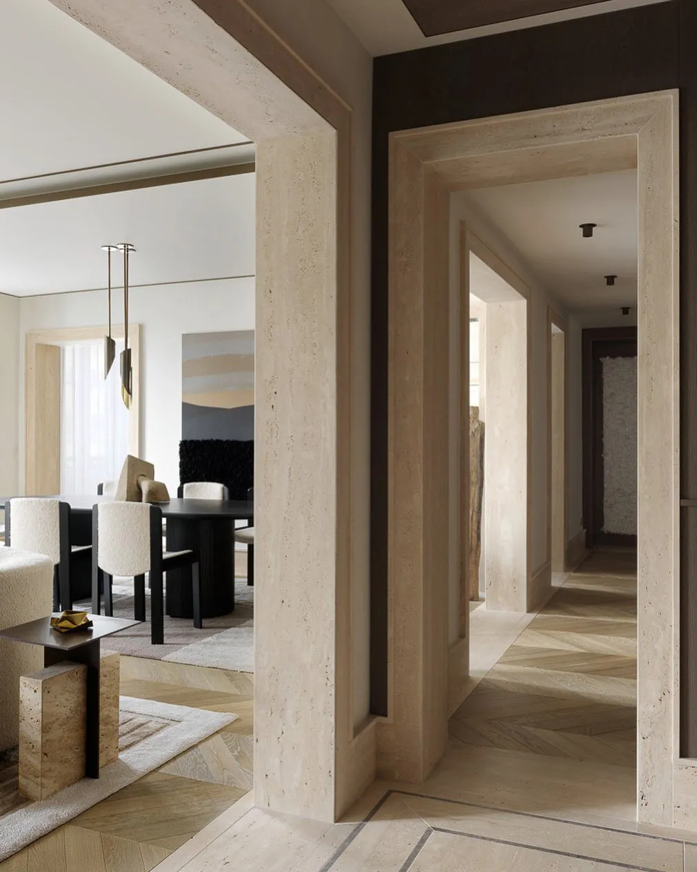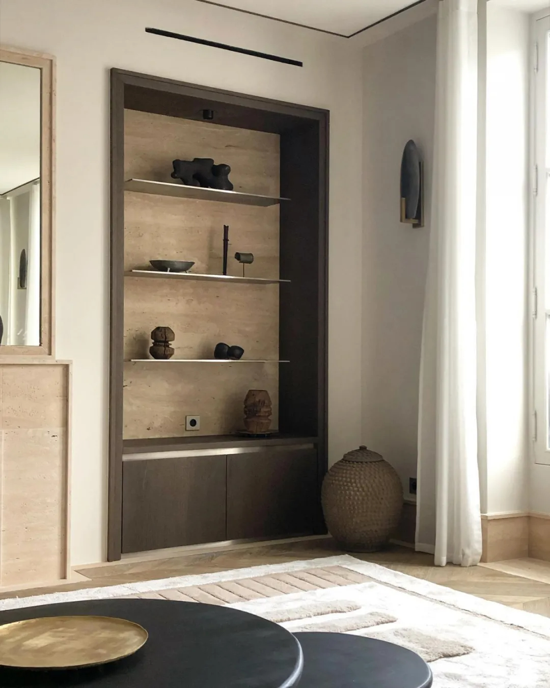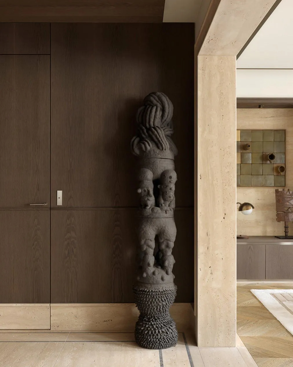 在本案中,随处可见的复古粗犷的陶罐摆件或饰品,让整体空间有着自己的调性,同时又与法式风融合的很好,既没有破坏法式风格特有的优雅浪漫,又以陶罐本身的肌理感呼应了设计师对原材料“野蛮性”的表达。陶罐的古朴质感与木材的温润、混凝土的厚重形成巧妙呼应,柔和了原材料的硬朗线条,而陶罐的复古造型又与法式空间的精致细节相得益彰,让整个公寓在和谐统一的基础上,多了一份沉淀的韵味,也让Felix Millory对空间有机融合的理念,在每一个细微的摆件中得到了极致的落地。