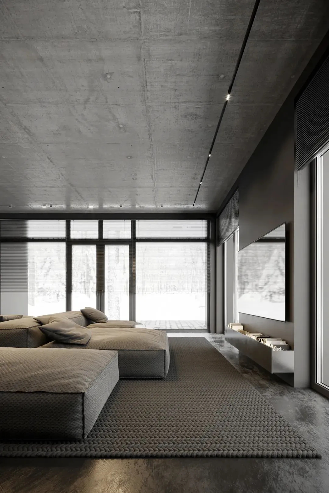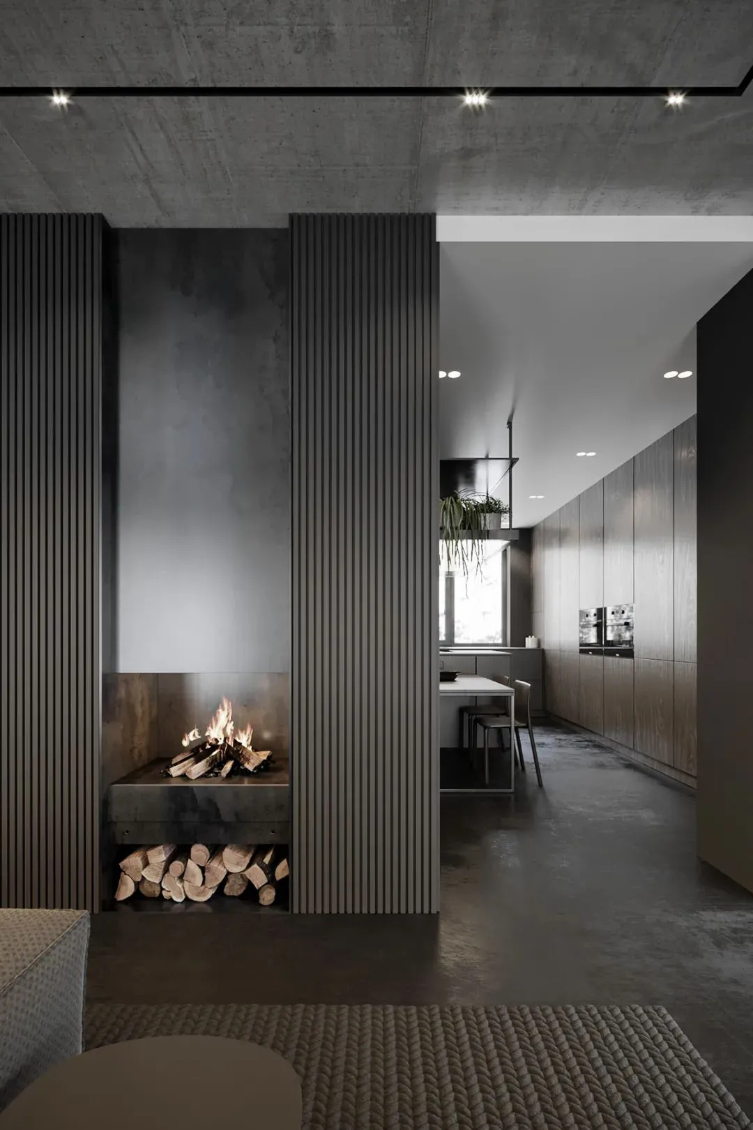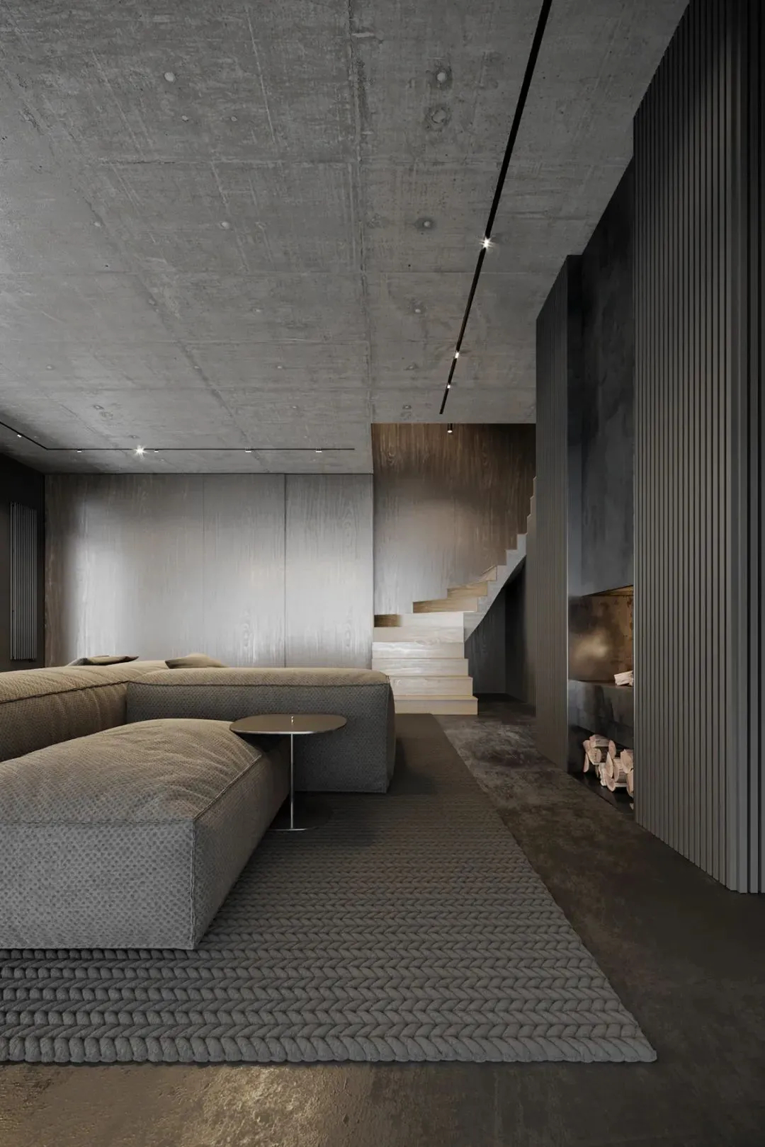 客厅中没有设置主灯,大面的落地窗保证了屋内明亮的采光,显得更加极简大方,不同纹理之间的搭配和谐统一。壁炉元素也成为了Konstantin Kildinov的标志性设计。