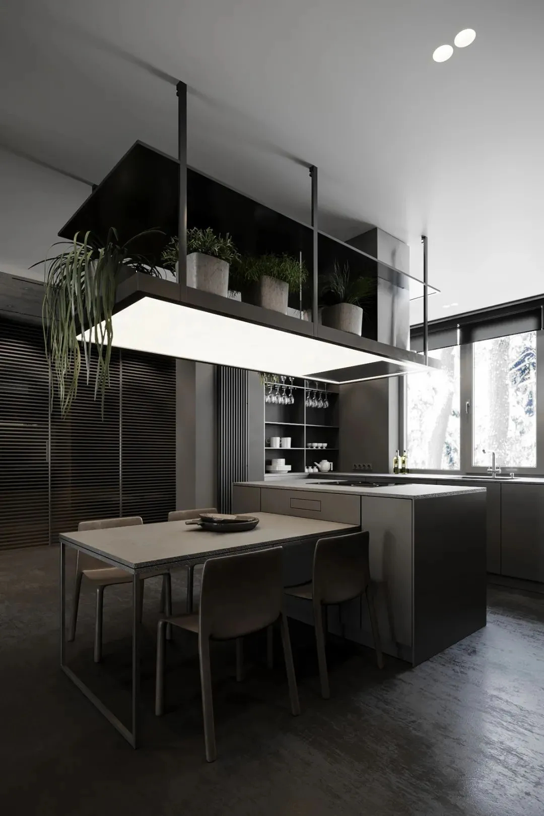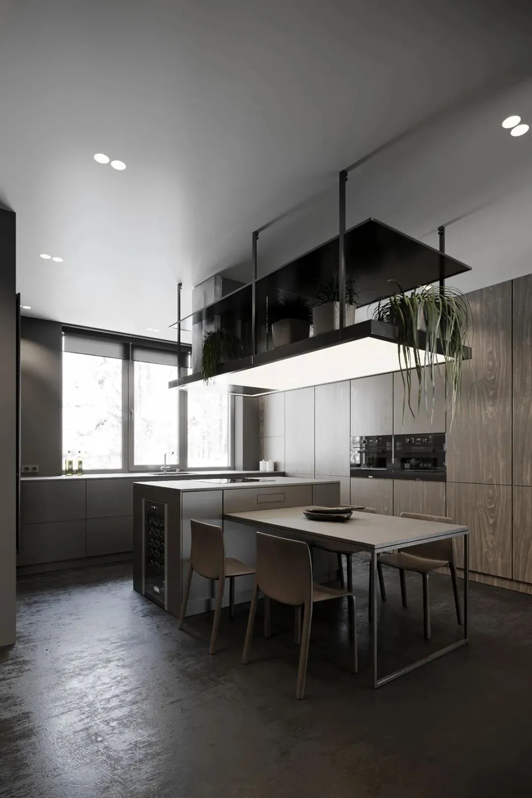 餐厅与厨房相连,餐桌靠近厨房岛台,月灰色餐桌很好的与整体色调相呼应。餐桌上方的吊灯摆放了装饰植物,瞬间提升了生活氛围。