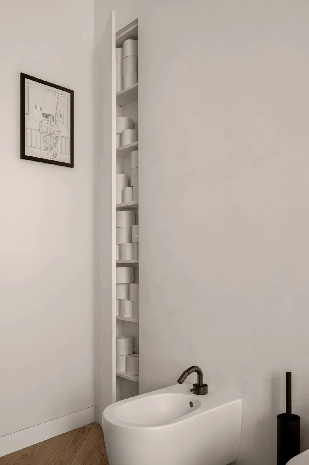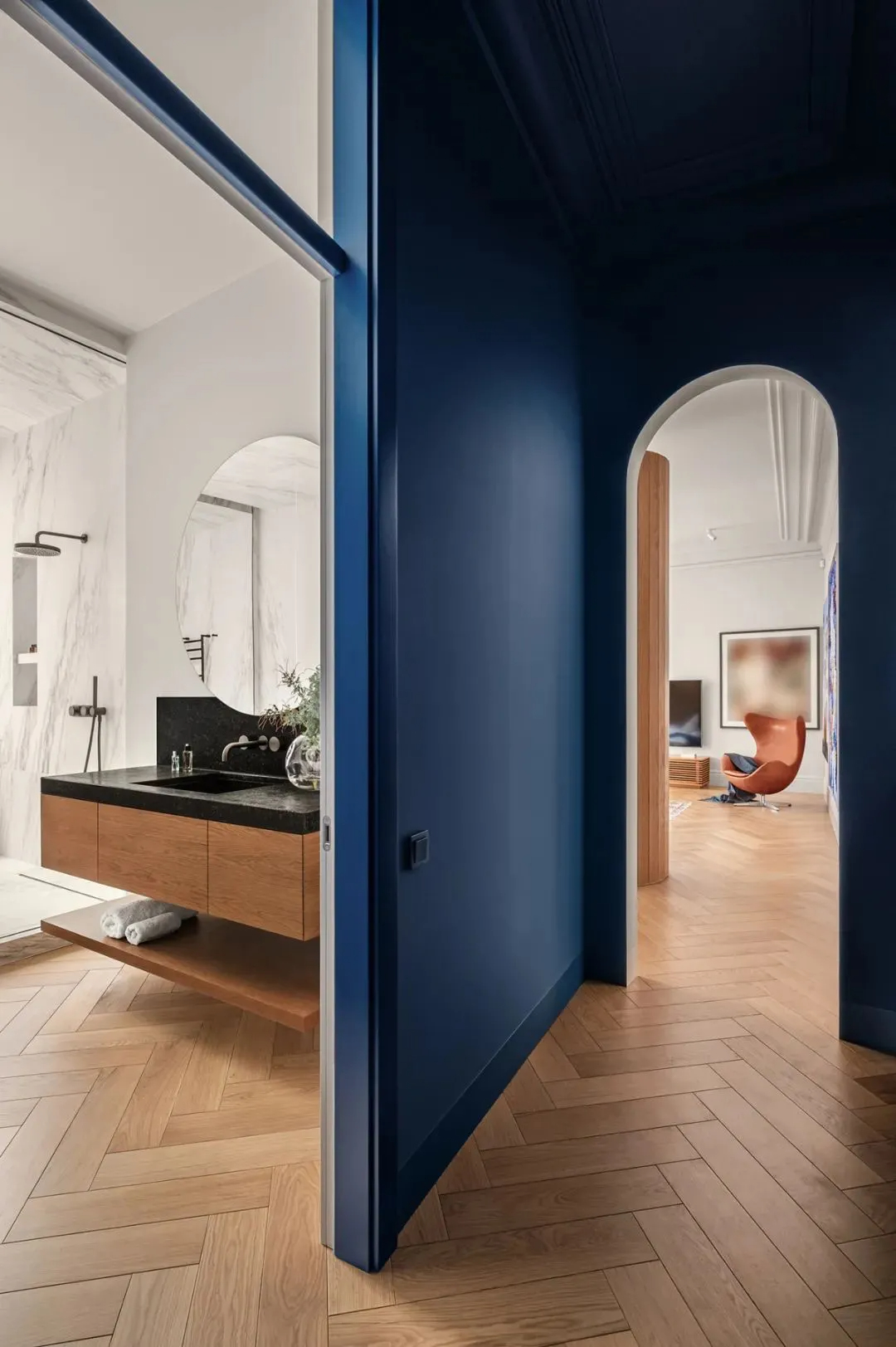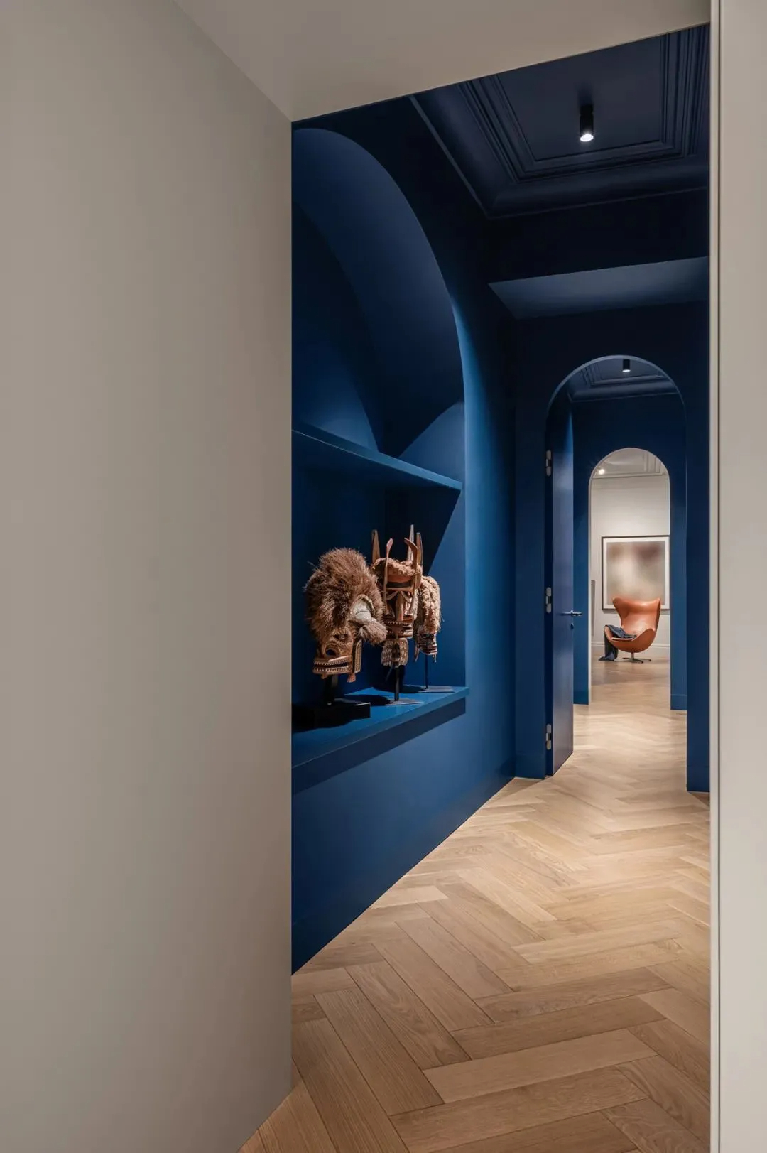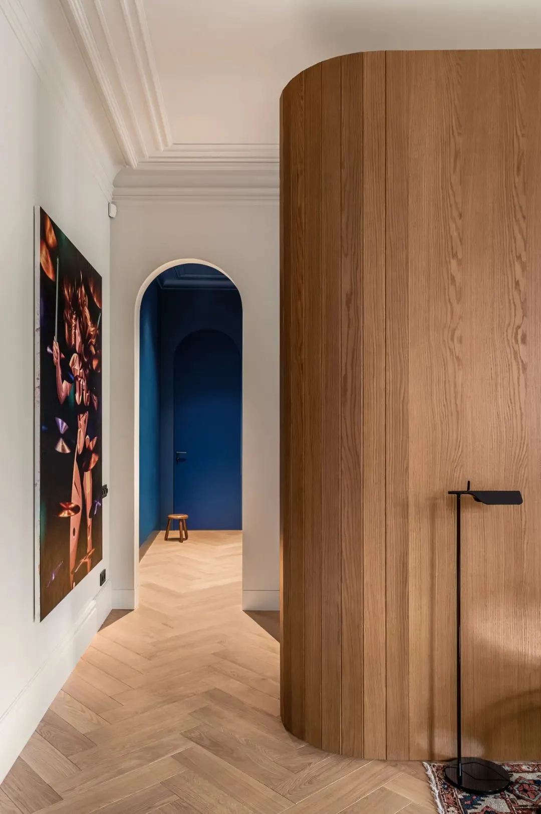 木质元素与纯白色彩贯穿整个公寓,成为空间的主流基调,引领着不同区域的情感走向与氛围格调,温润的木质中和了白色的清冷,让艺术感十足的空间多了几分居家的温暖。廊道处则格外亮眼,明丽跳跃的克莱因蓝点缀其间,打破了整体的素雅,让空间瞬间变得鲜活起来,色彩的碰撞既大胆又和谐,满是惊喜。