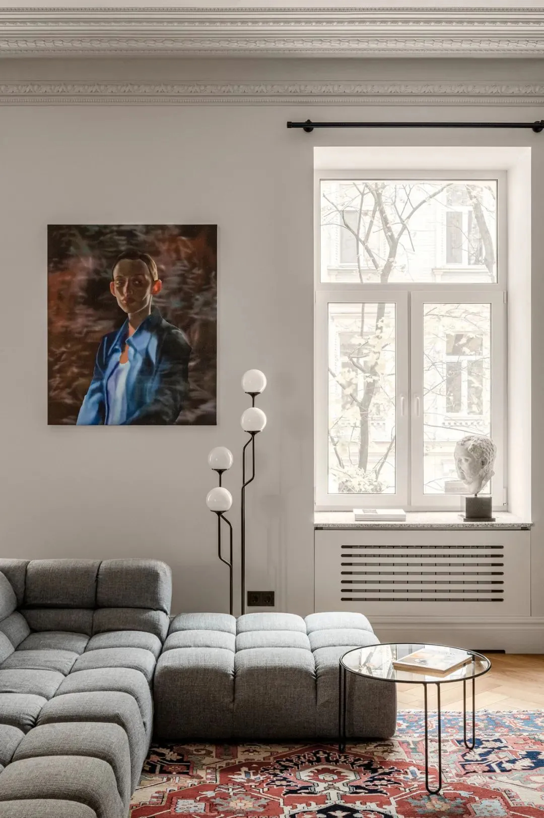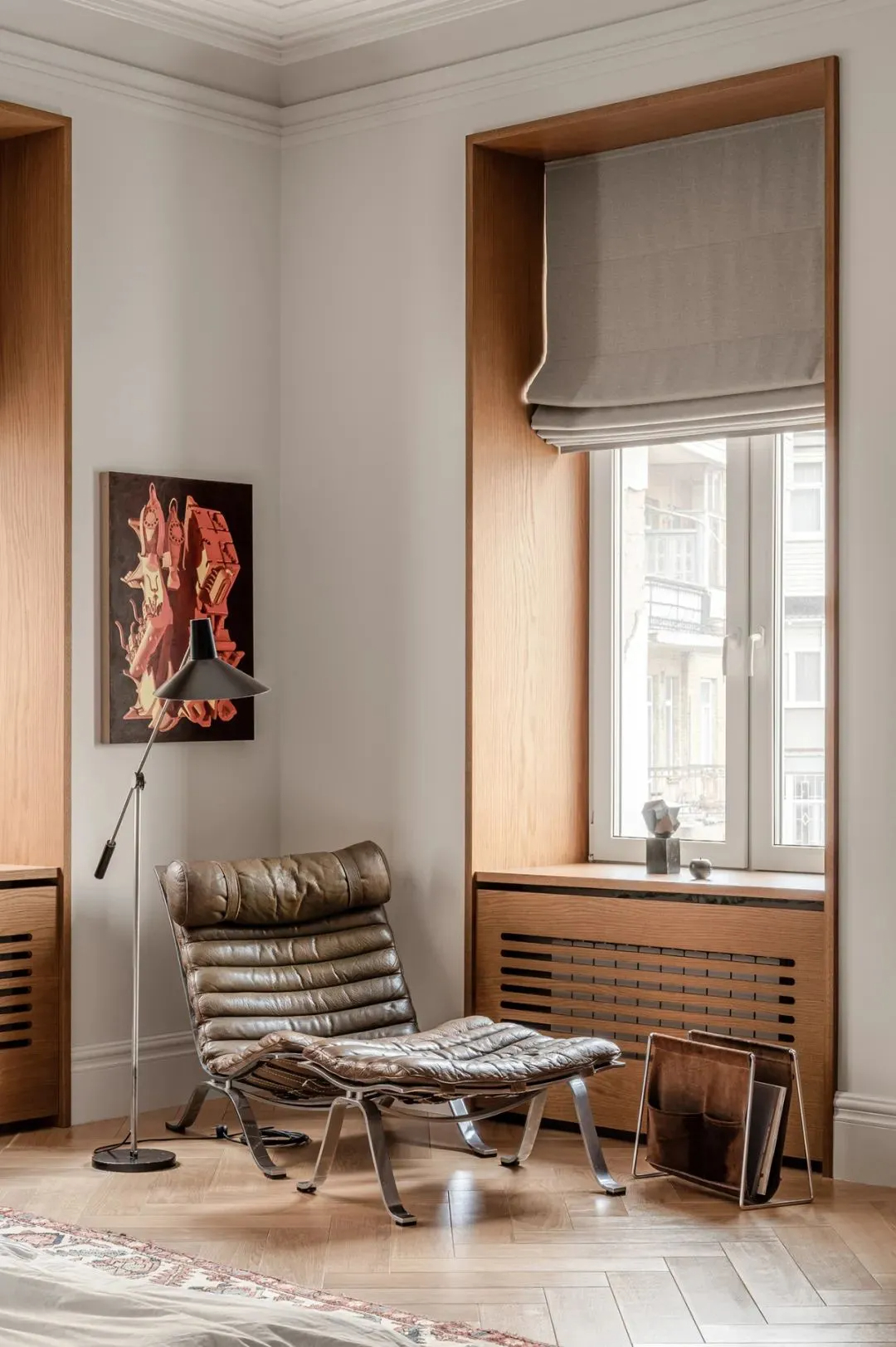 公寓的天花板高达3.2米,大多房间都是不规则形状,这种独特的空间条件,反而被设计师巧妙利用,搭配复古与简约现代风结合的家具,没有多余的装饰,却衬出了经典耐看的质感,每一处都透着主人的审美品味。