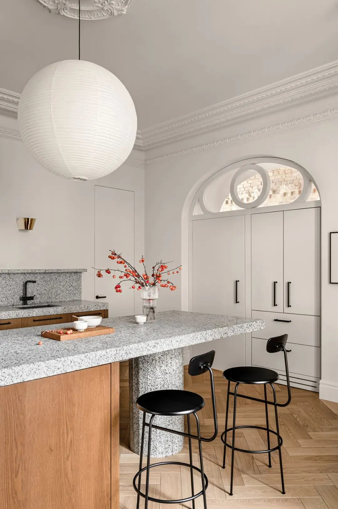 厨房是整个空间的衔接枢纽,巧妙连接起公共区域与私人区域,同时还能通过定制房门直达办公空间,厨房的彩色玻璃窗,图案借鉴了装饰艺术风格,低调中透着精致,为简约的空间增添了一抹亮色。