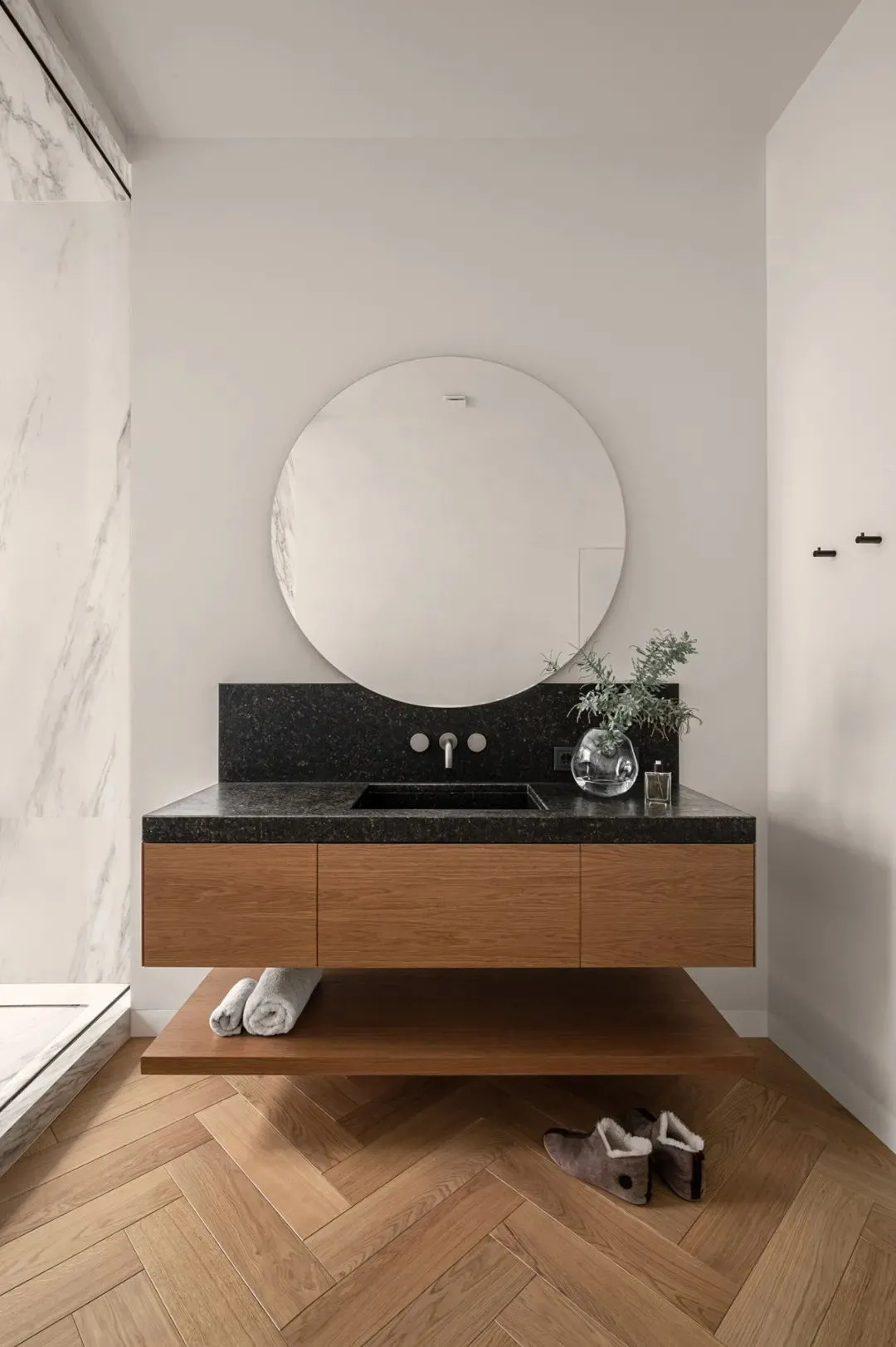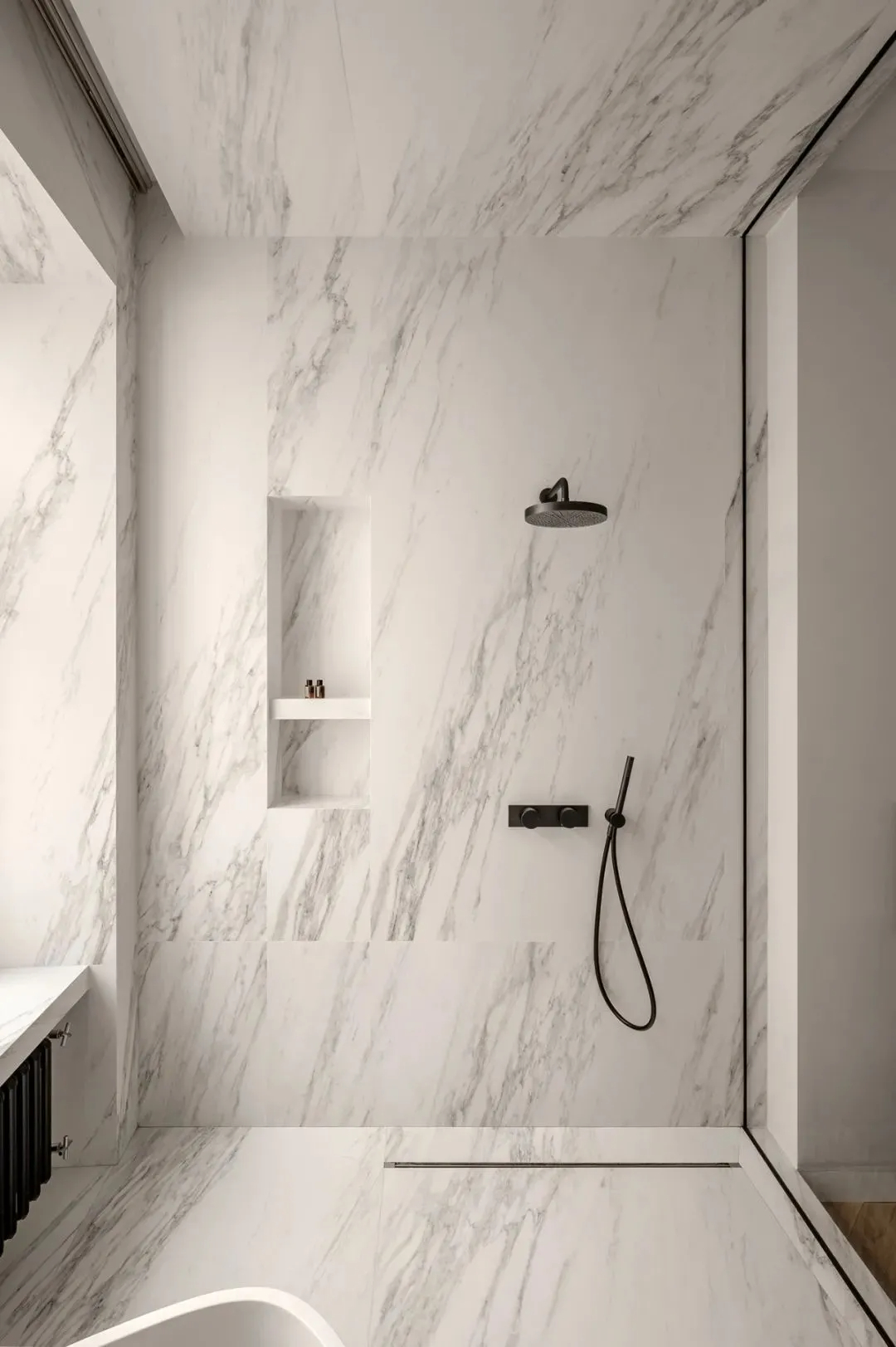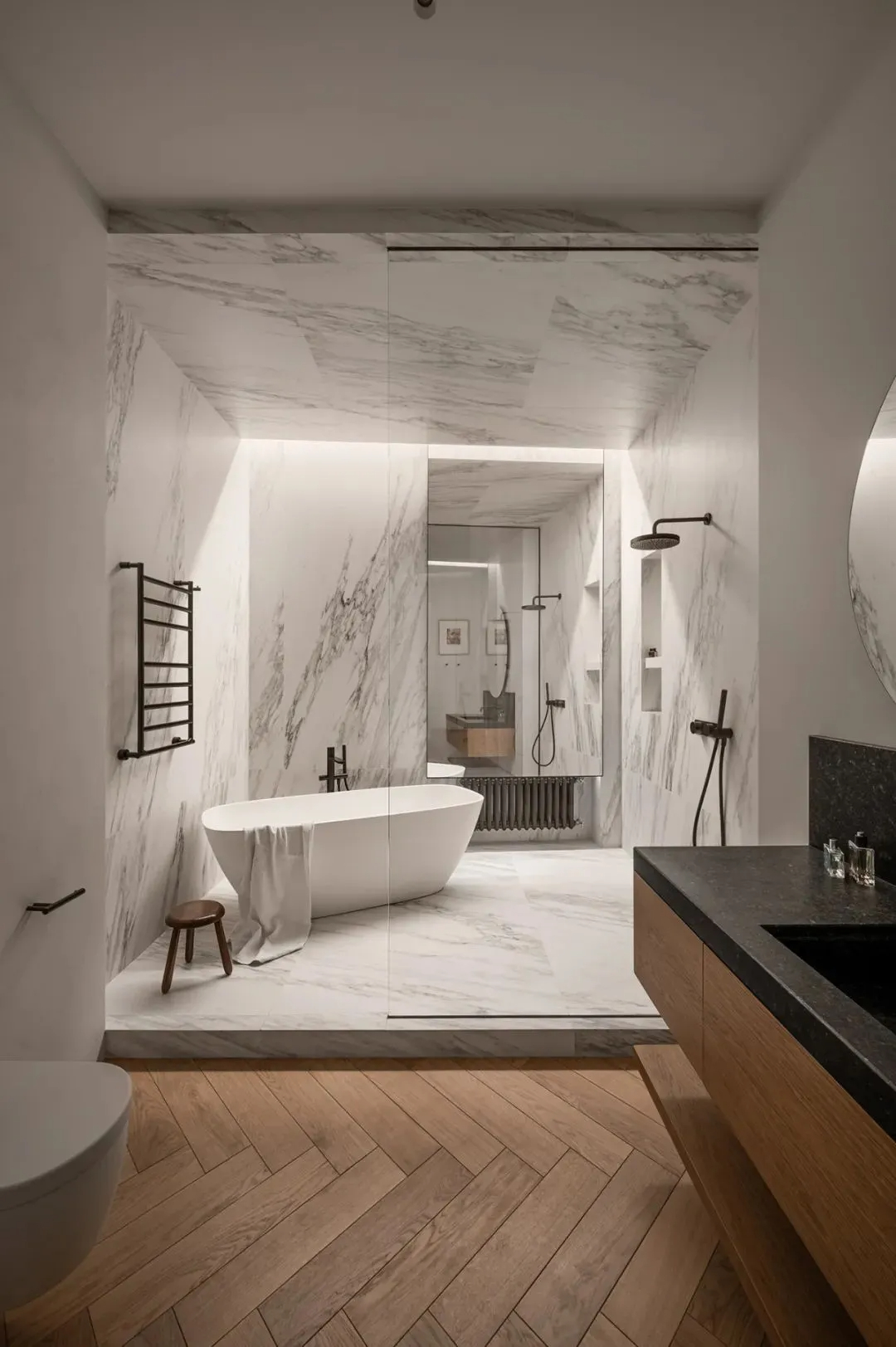 浴室设计也极具格调,搭配了一面大窗户,保证充足采光的同时,也让空间更显通透,大理石装饰面与木质元素的碰撞,将轻奢与素雅完美诠释,既有质感又不失温柔。