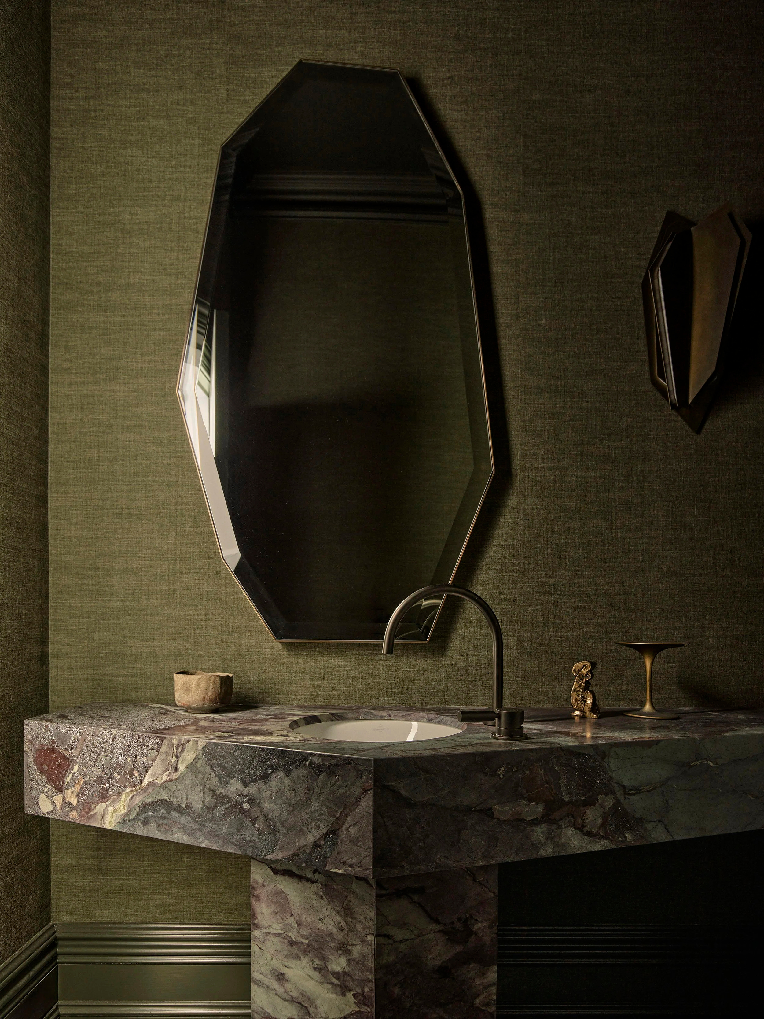 设计师特别懂客户,把客户最爱的颜色藏在了每一个细节里,还巧妙地和房子周围的葱郁绿意呼应起来。重新刷过的楼梯旁,铺着一块翠绿色的地毯,和那台近乎荧光的宝石切割餐边柜摆在一起,一深一浅、一暗一亮,特别有画面感。就连修复好的壁炉,还有盥洗室的苔绿色壁纸,都和这个色调呼应着,整个房子的调性特别统一。