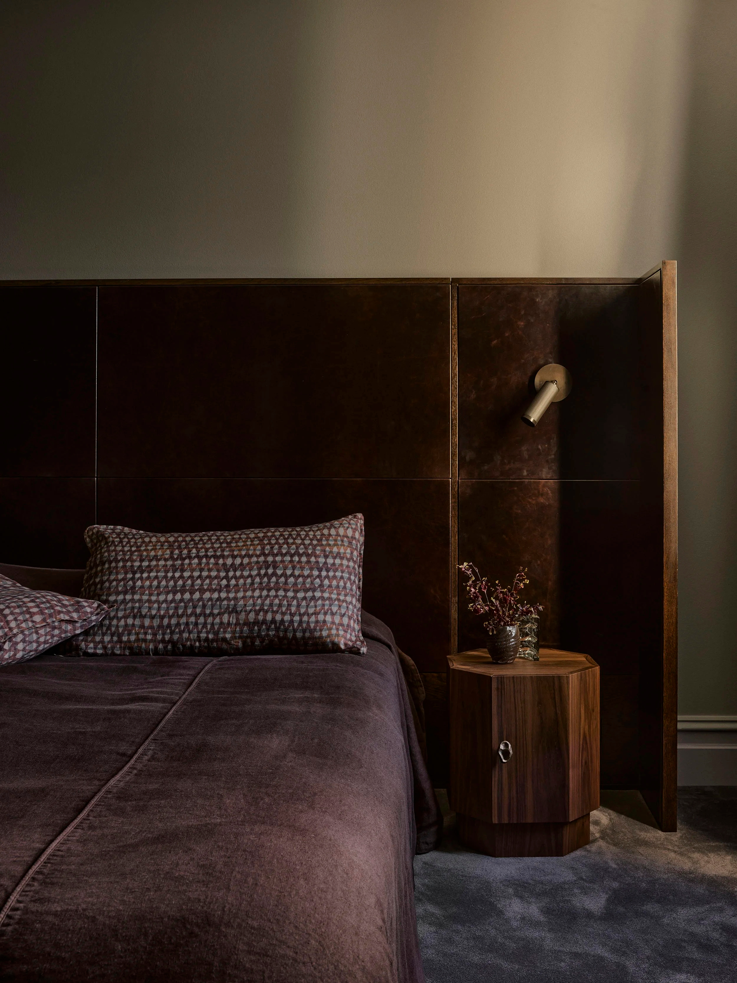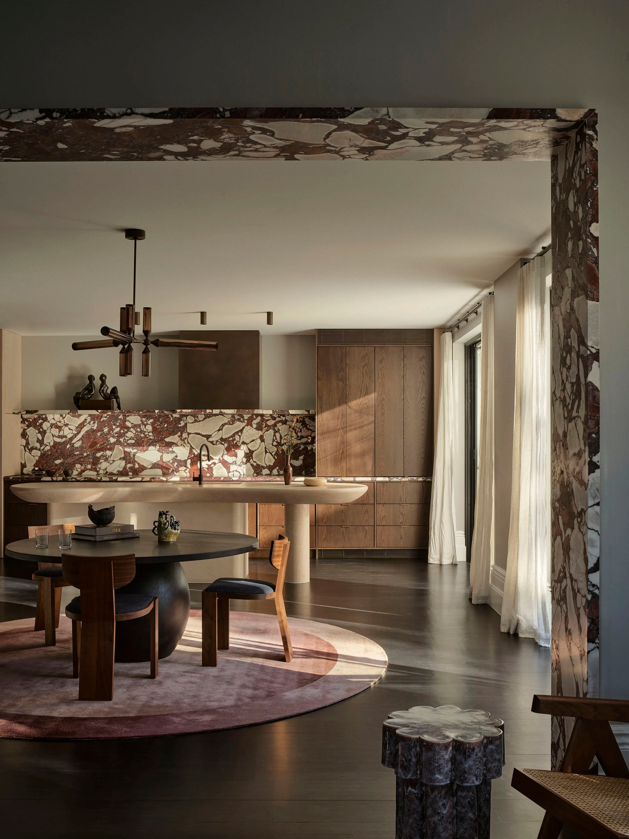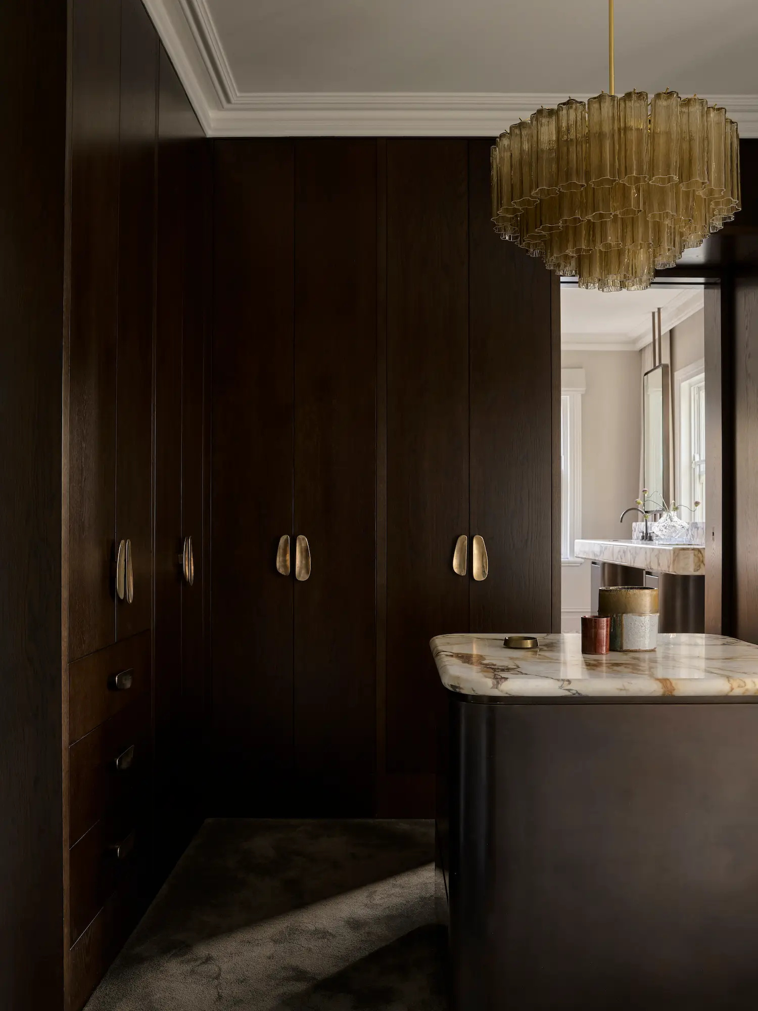 整个房子的色彩和布局都很有巧思,没有固定的套路,再加上定制家具的搭配,色调一层叠一层,特别有层次。扩建的部分尤其让人眼前一亮,粉色的岛台、暖乎乎的地毯和窗帘,软乎乎的质感,和私人步入式衣帽间里深沉的橡木橱柜形成了强烈对比,一眼看过去,视觉冲击很足,却不违和。
