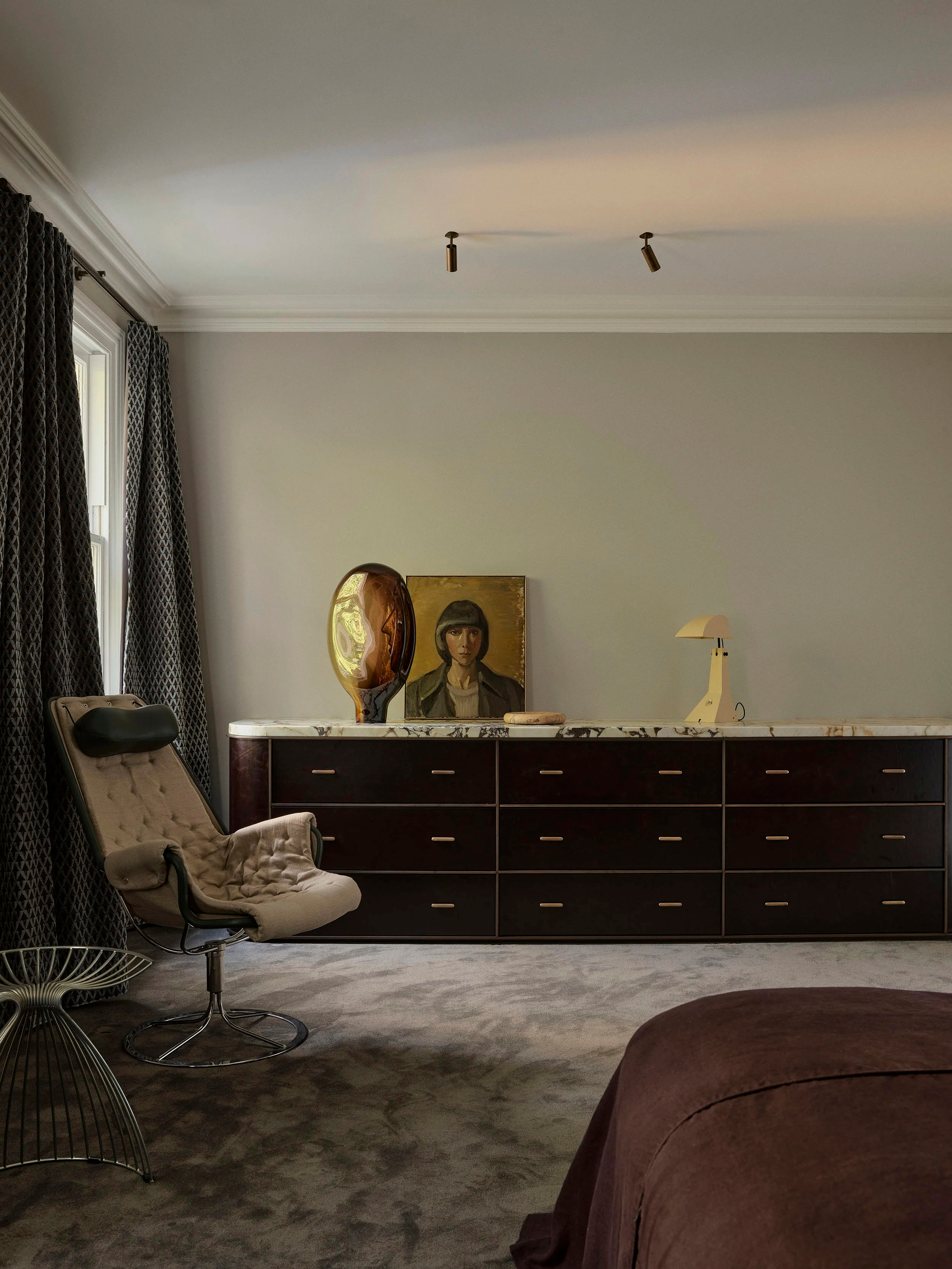 考虑到客户有不少艺术收藏,设计师特意挑了一批色彩和造型都很大胆的家具,和房子本身的复古风格搭在一起,反而格外和谐。就像Alexander & CO. 的高级室内设计师Alice Noguès说的,在老建筑的历史限制下,家具反而成了最能发挥的地方,是主人个性的最好体现。