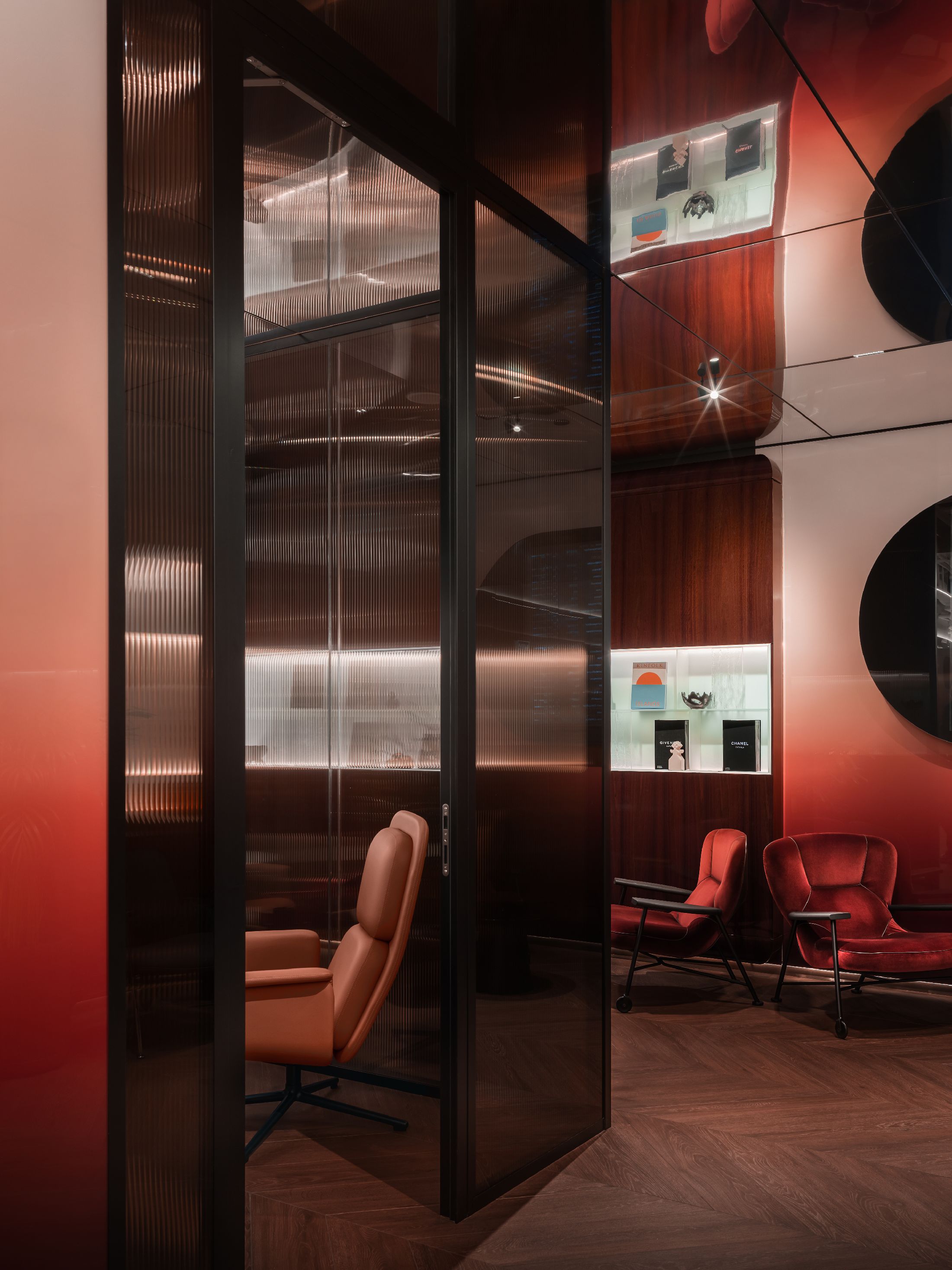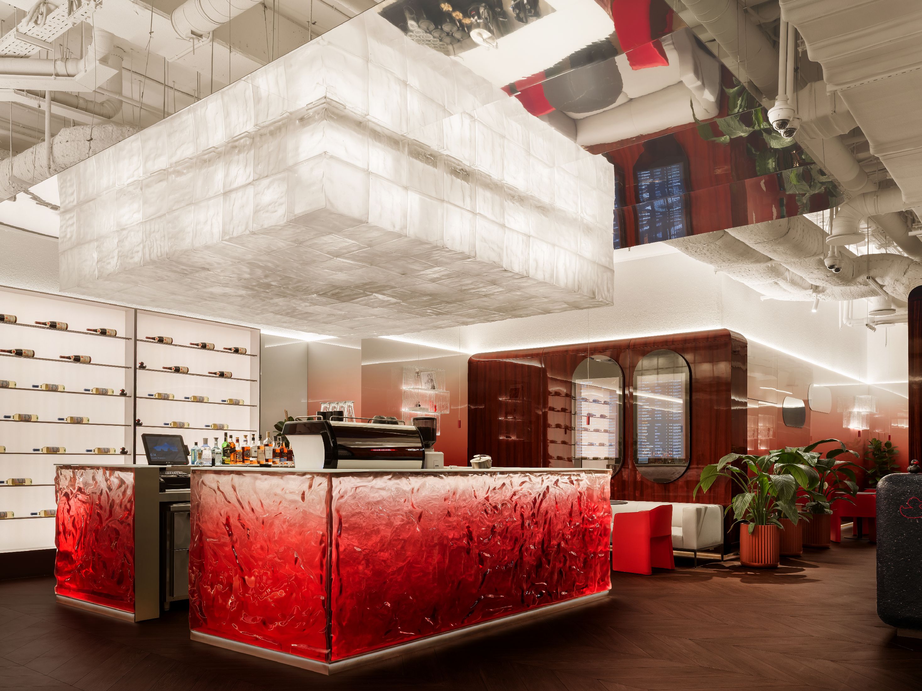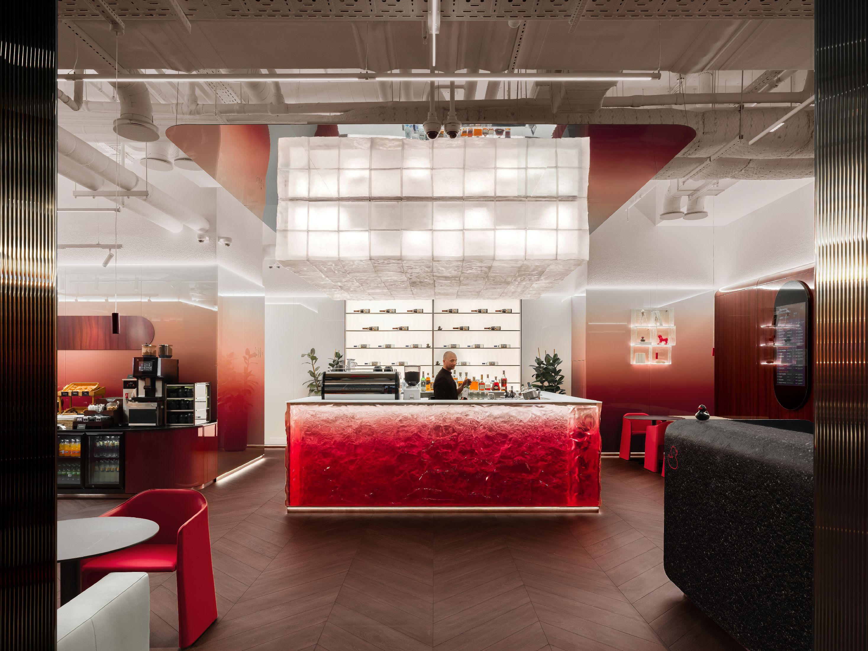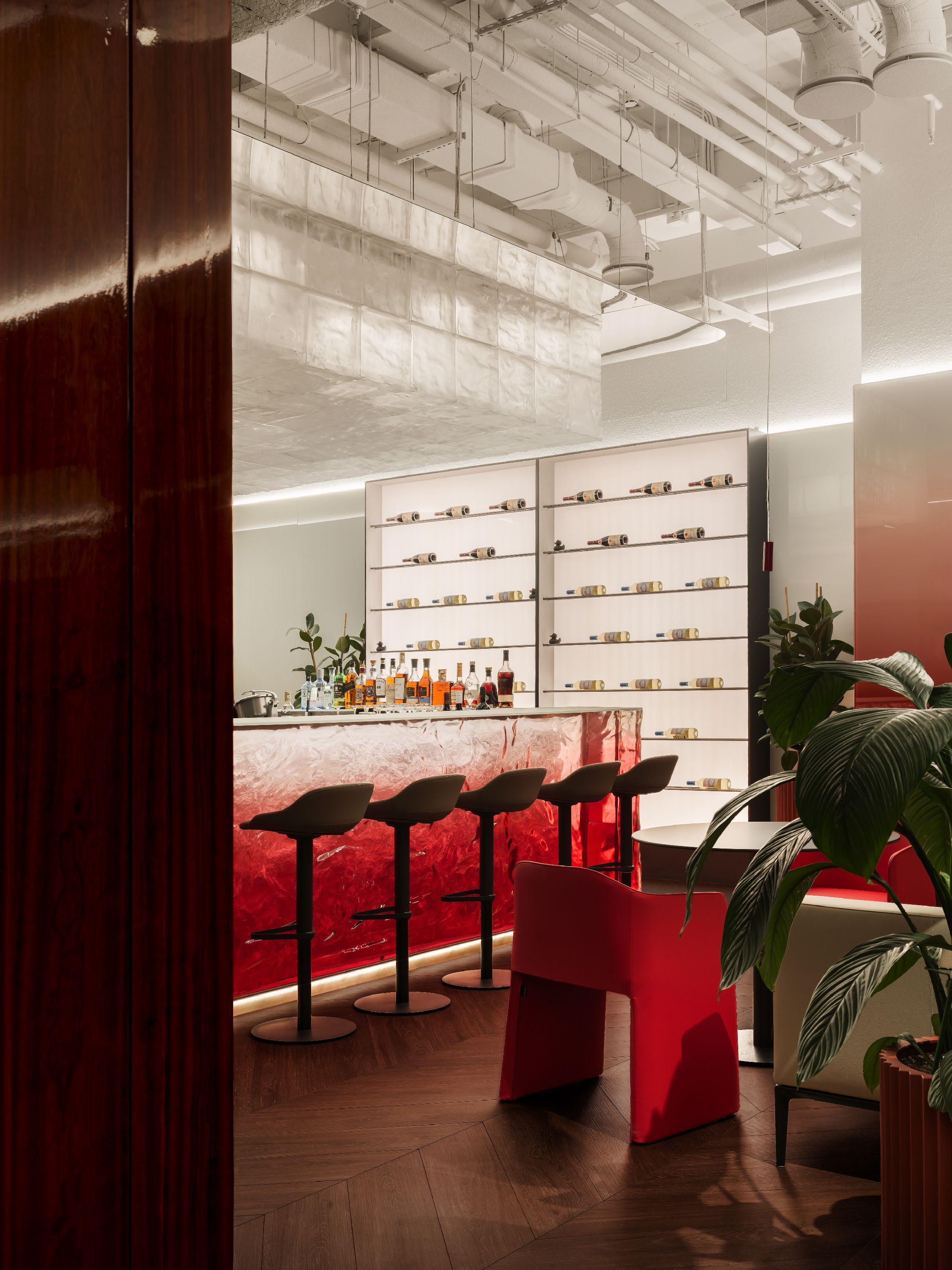 整个空间最大的亮点,是大量专属定制的原创设计单品。空间核心的吧台采用特殊工艺打造,深邃宝石红亚克力材质复刻出复古玻璃与醇酒的细腻质感;重达200公斤、形似冰块拼接的纹理艺术吊灯,成为空间标志性视觉焦点。接待区的复合材质办公桌自带凝固熔岩的独特肌理,内嵌品牌标志性符号,细节处尽显专属质感。同时空间复刻精品酒店的营造逻辑,整合葡萄酒吧、美食区、淋浴间与独立雪茄室等多元功能,兼顾实用性与高阶体验。