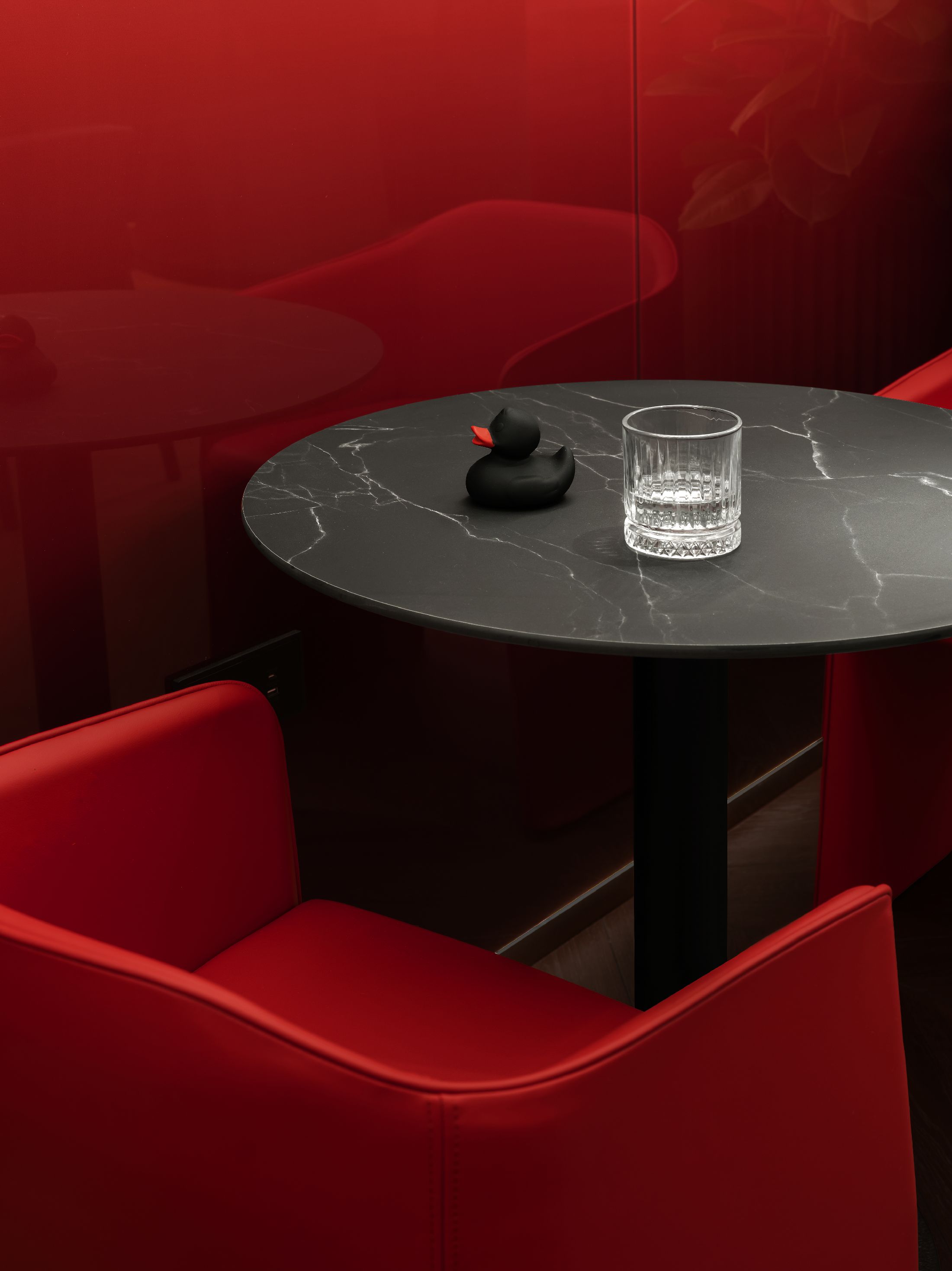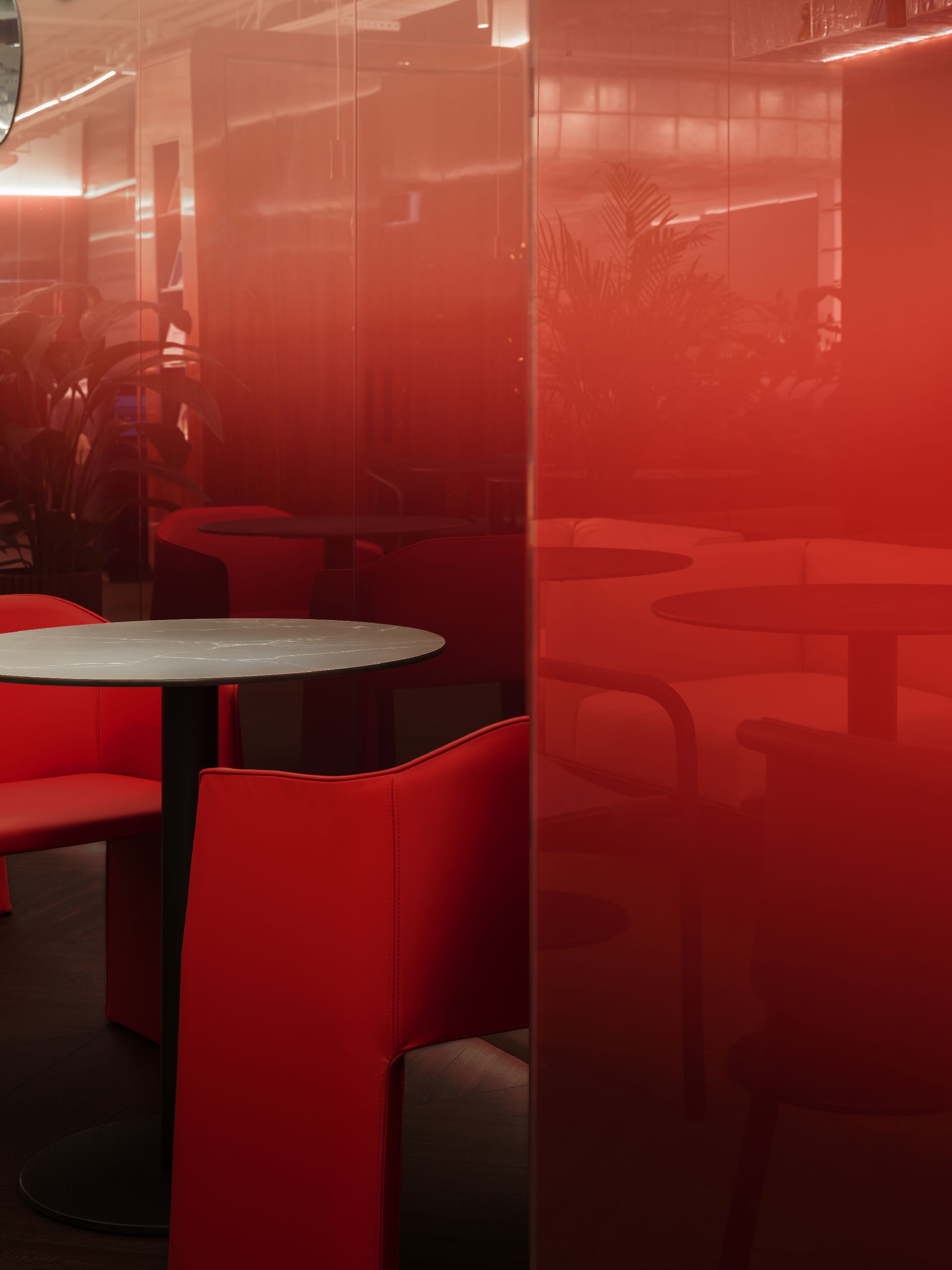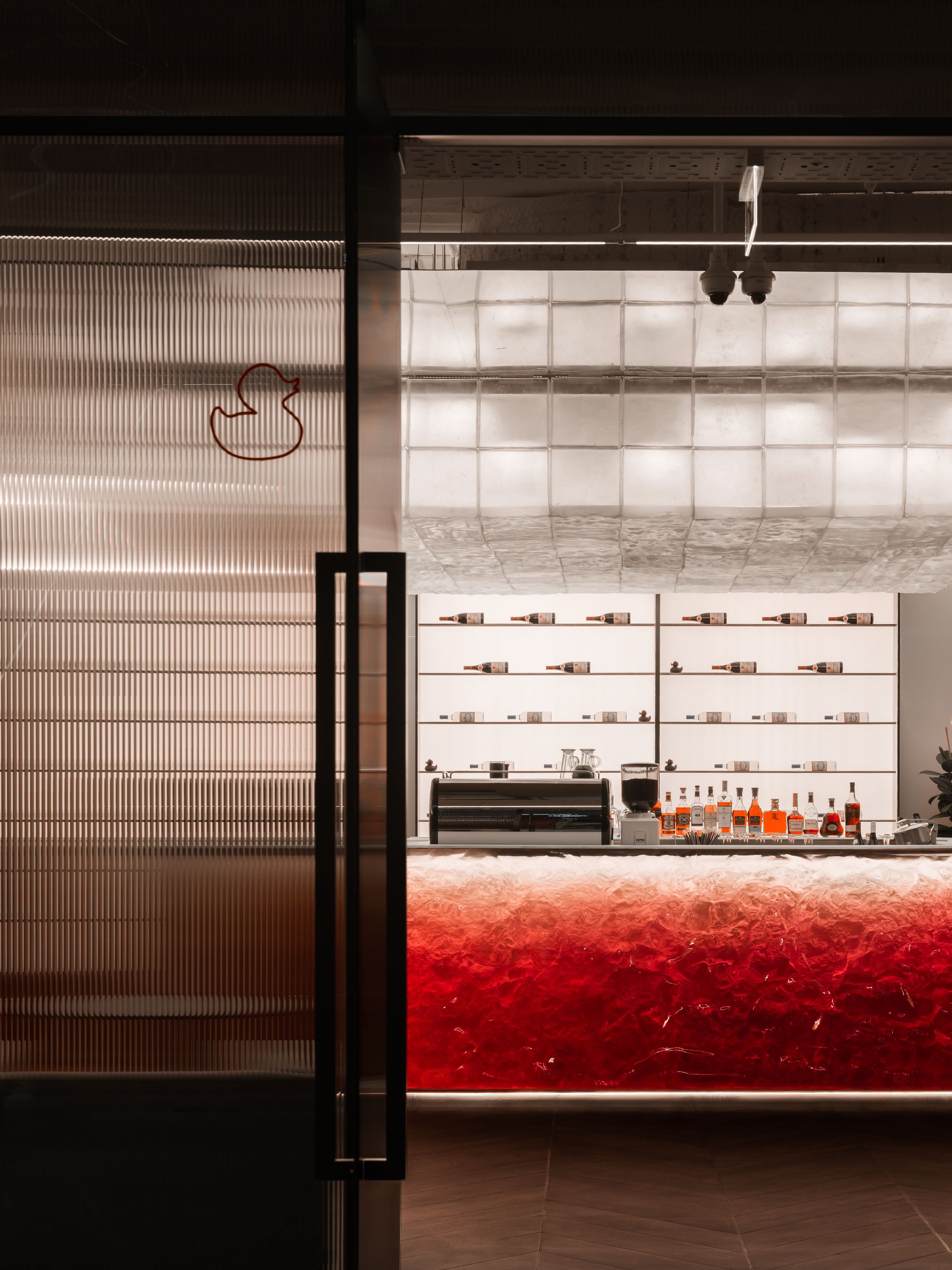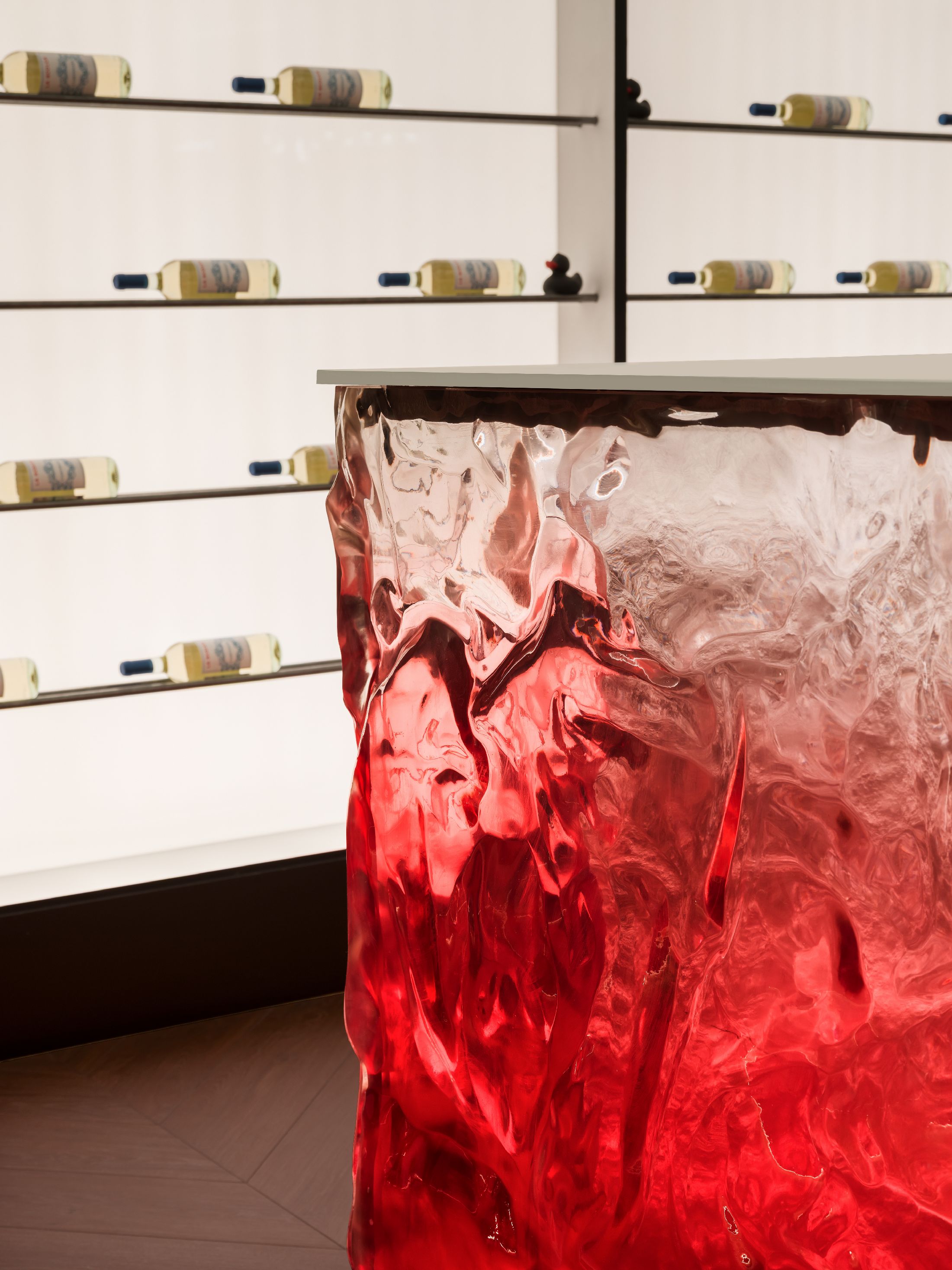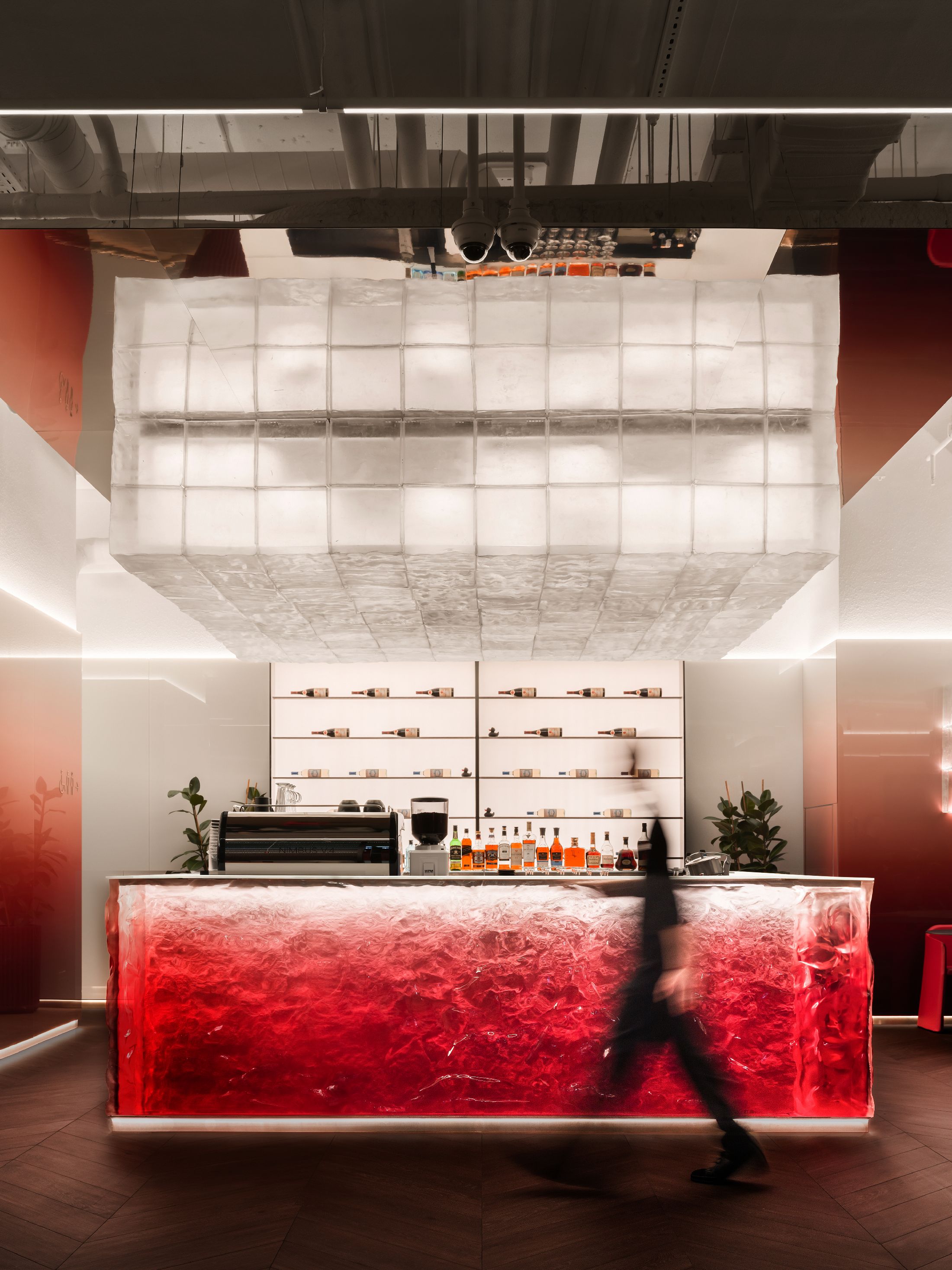 整个空间最大的亮点,是大量专属定制的原创设计单品。空间核心的吧台采用特殊工艺打造,深邃宝石红亚克力材质复刻出复古玻璃与醇酒的细腻质感;重达200公斤、形似冰块拼接的纹理艺术吊灯,成为空间标志性视觉焦点。接待区的复合材质办公桌自带凝固熔岩的独特肌理,内嵌品牌标志性符号,细节处尽显专属质感。同时空间复刻精品酒店的营造逻辑,整合葡萄酒吧、美食区、淋浴间与独立雪茄室等多元功能,兼顾实用性与高阶体验。