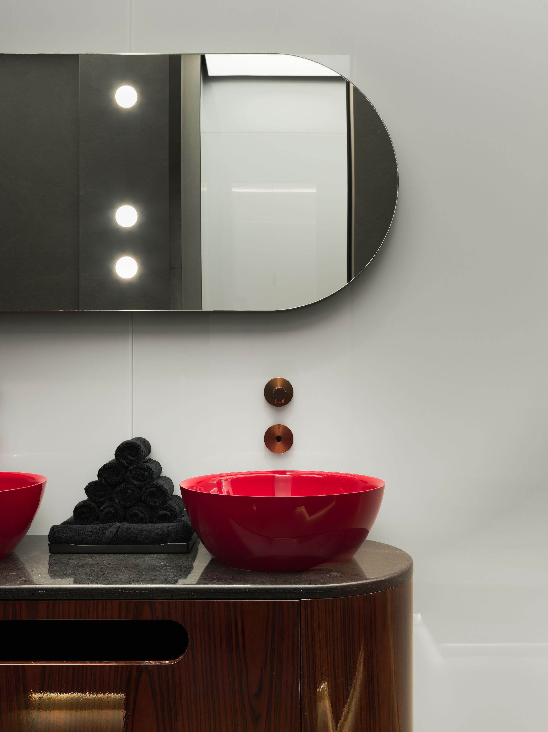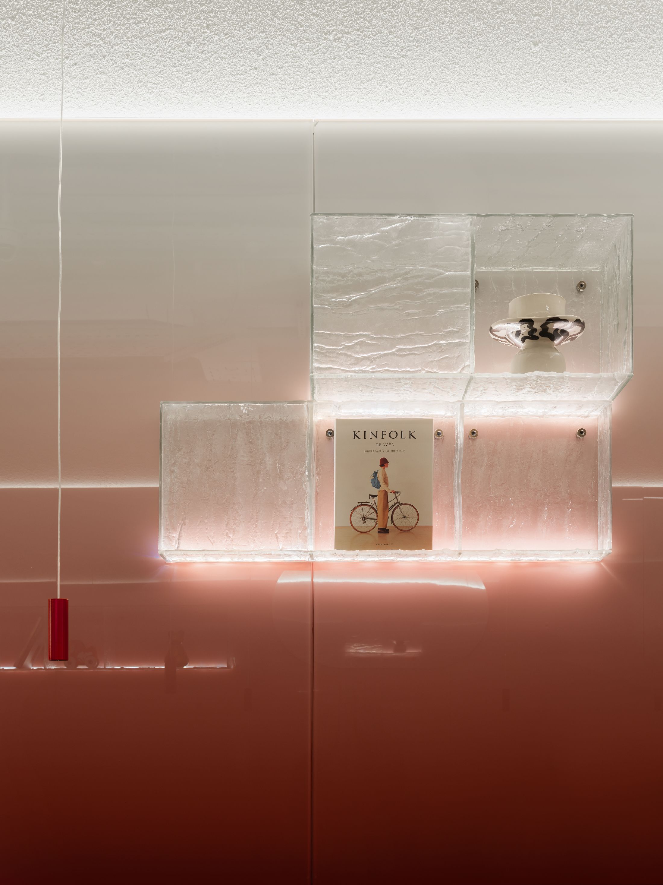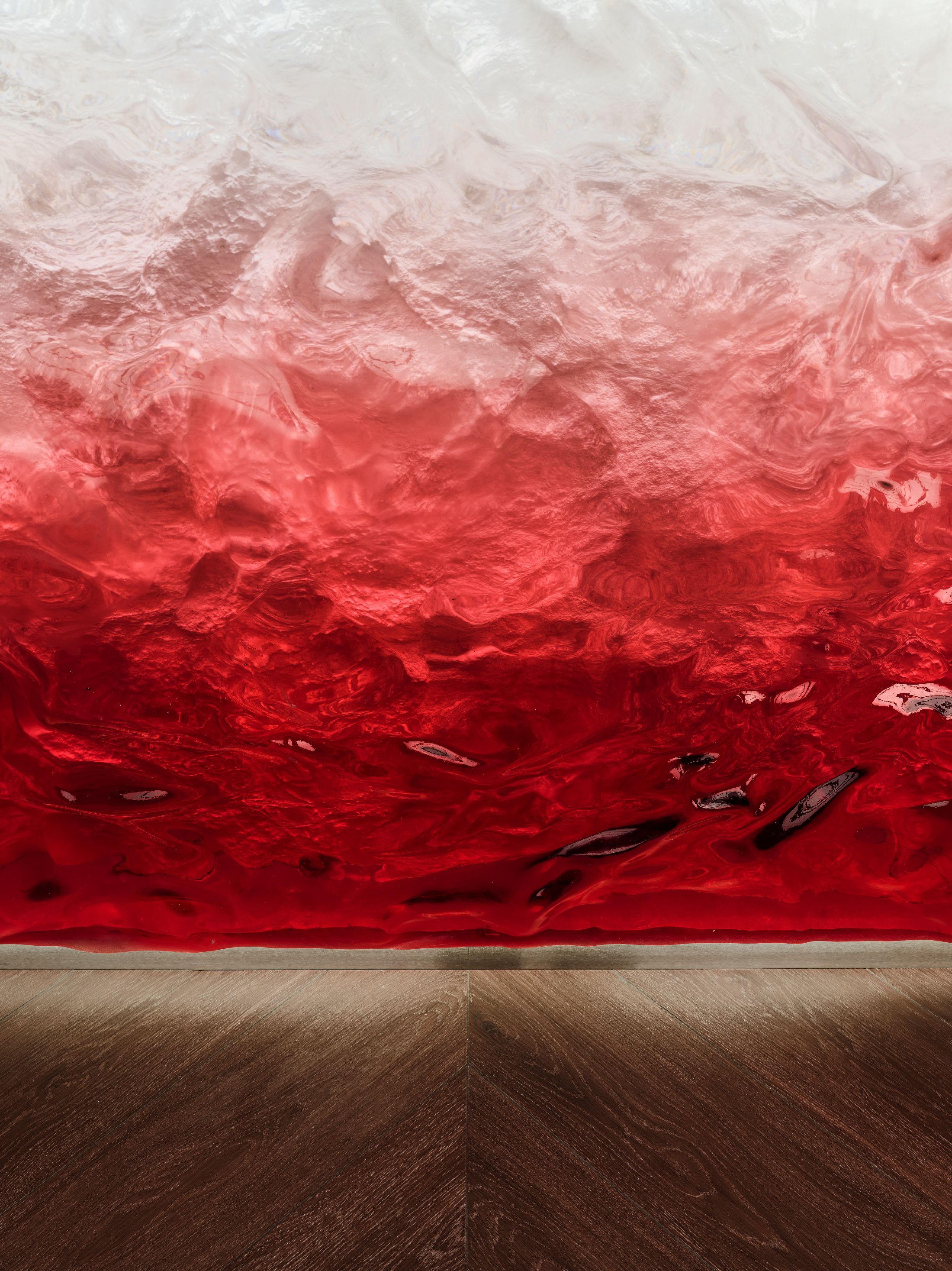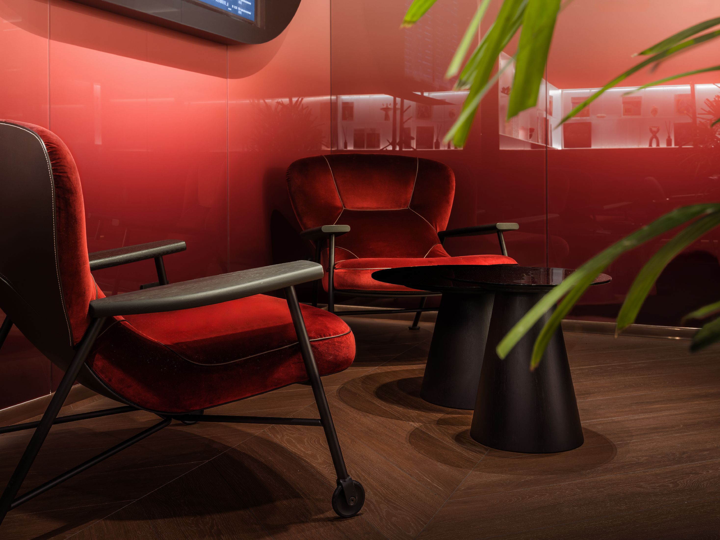 整个空间最大的亮点,是大量专属定制的原创设计单品。空间核心的吧台采用特殊工艺打造,深邃宝石红亚克力材质复刻出复古玻璃与醇酒的细腻质感;重达200公斤、形似冰块拼接的纹理艺术吊灯,成为空间标志性视觉焦点。接待区的复合材质办公桌自带凝固熔岩的独特肌理,内嵌品牌标志性符号,细节处尽显专属质感。同时空间复刻精品酒店的营造逻辑,整合葡萄酒吧、美食区、淋浴间与独立雪茄室等多元功能,兼顾实用性与高阶体验。