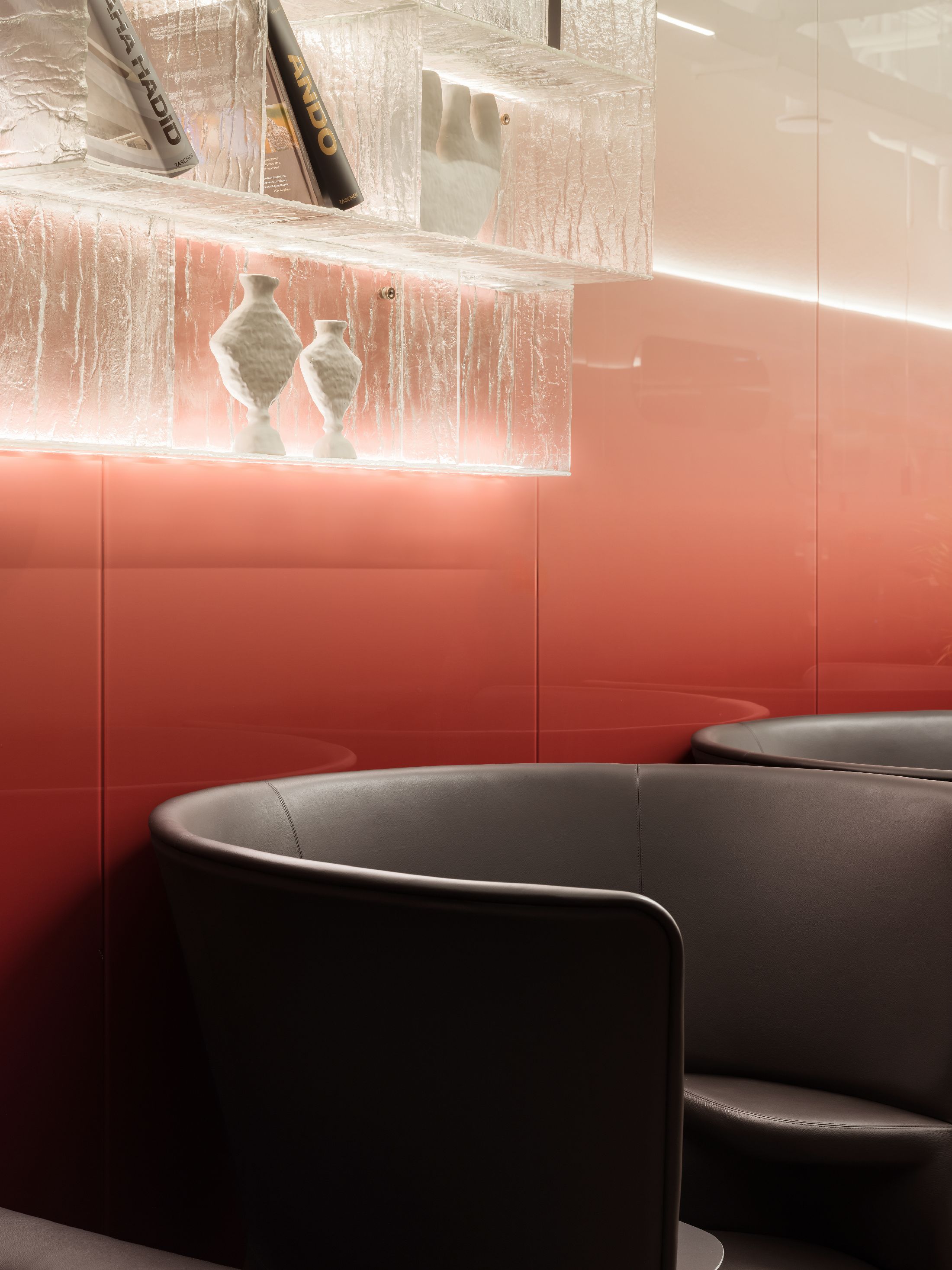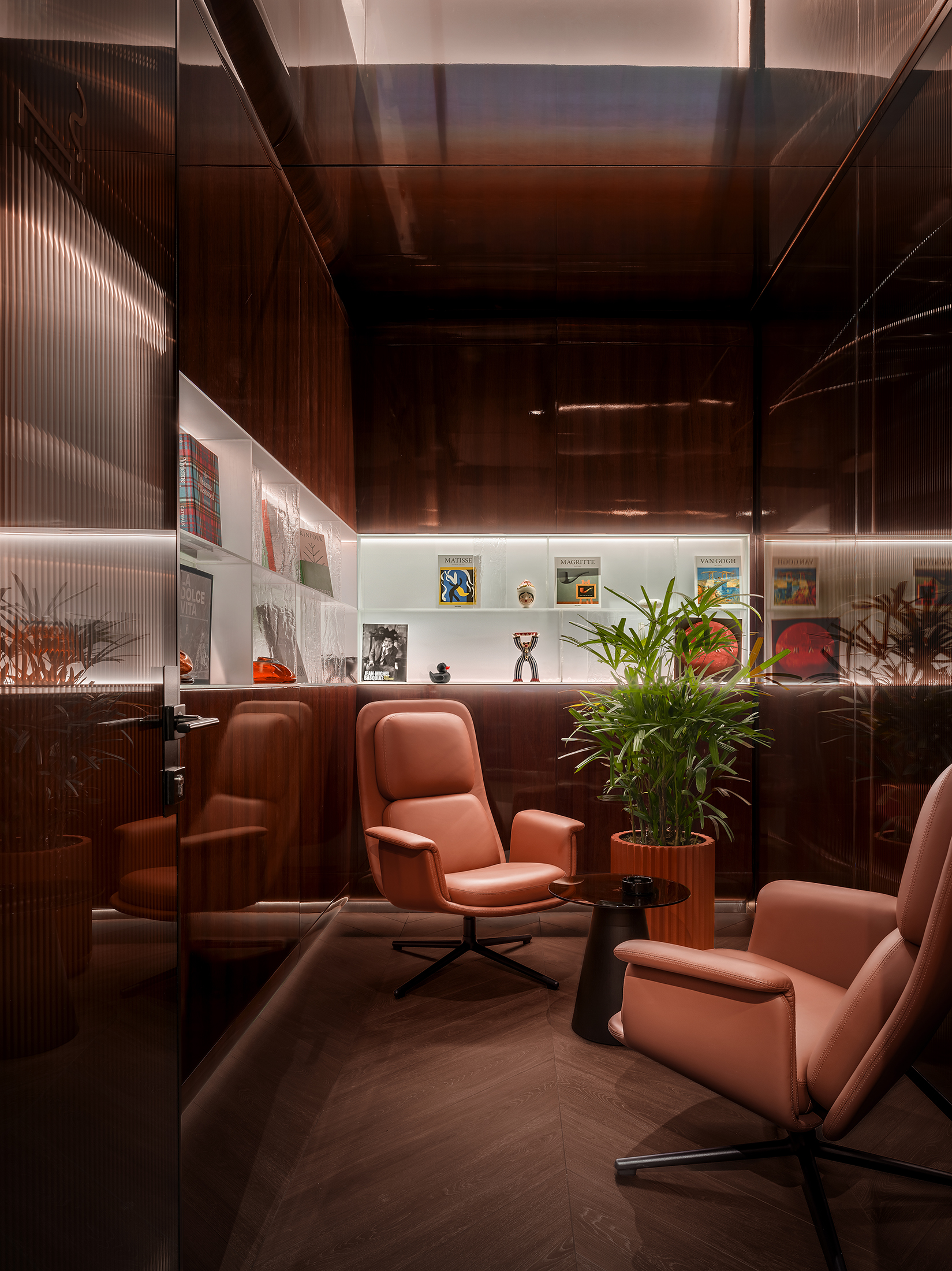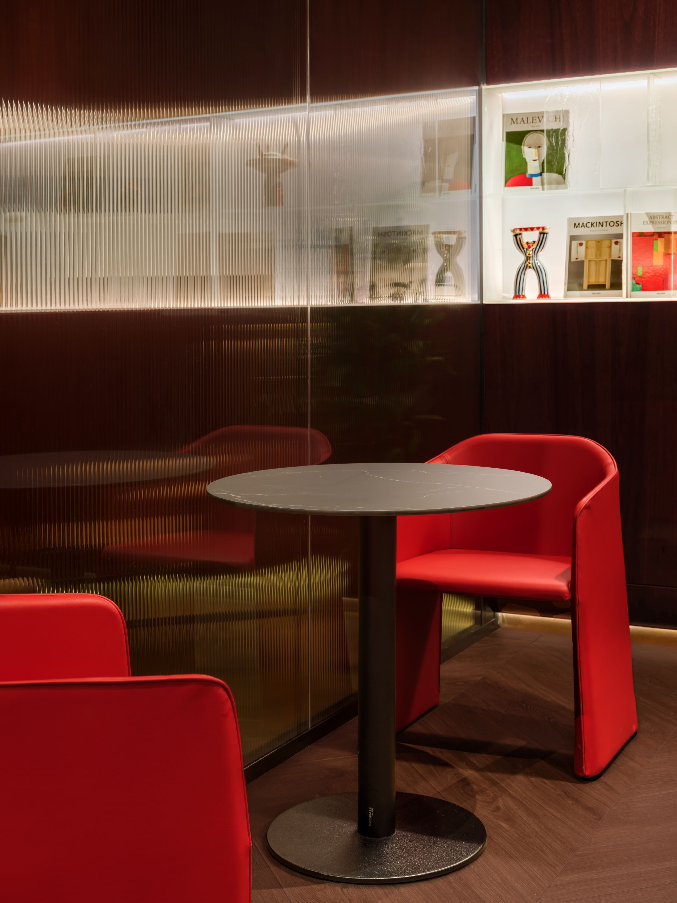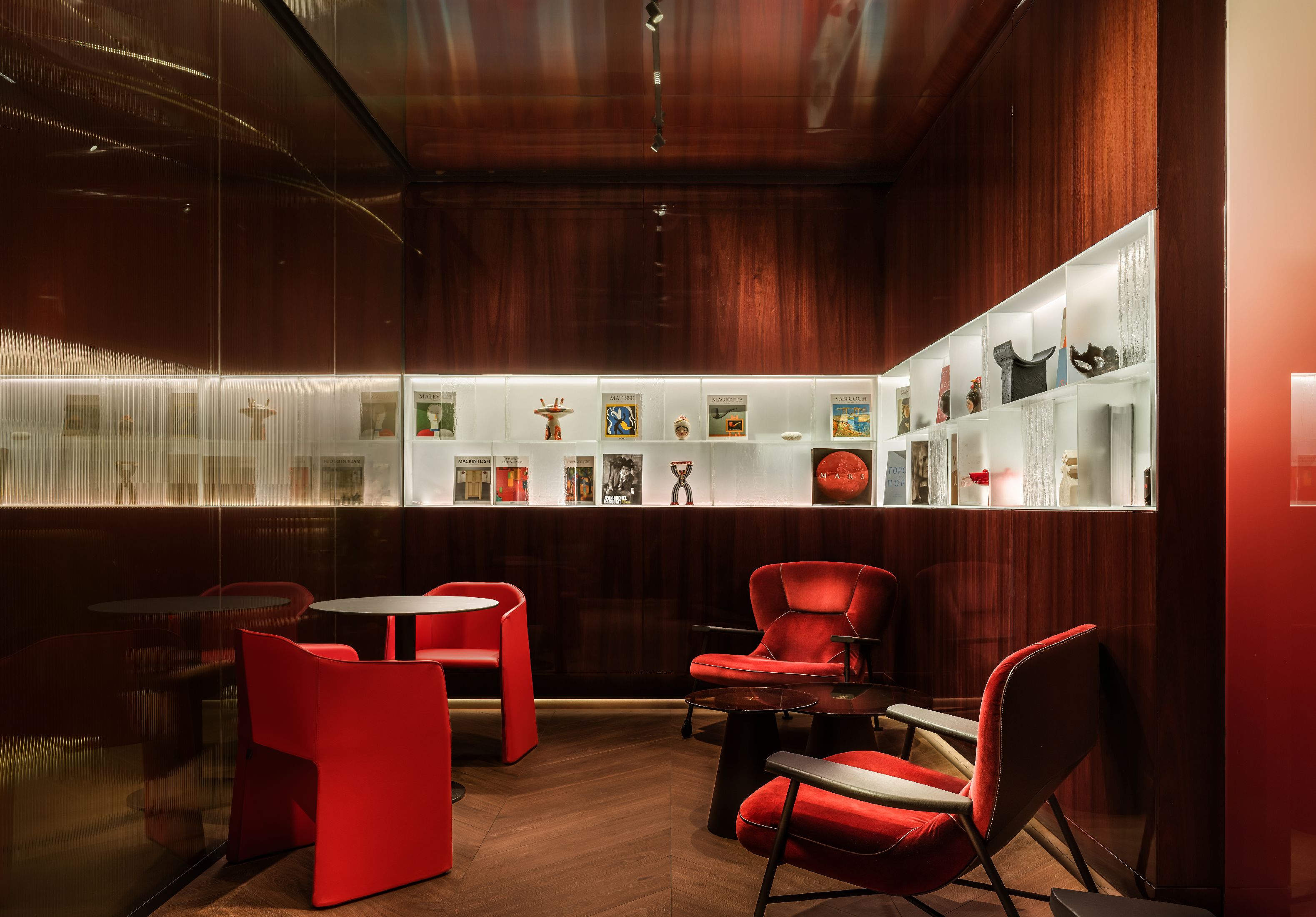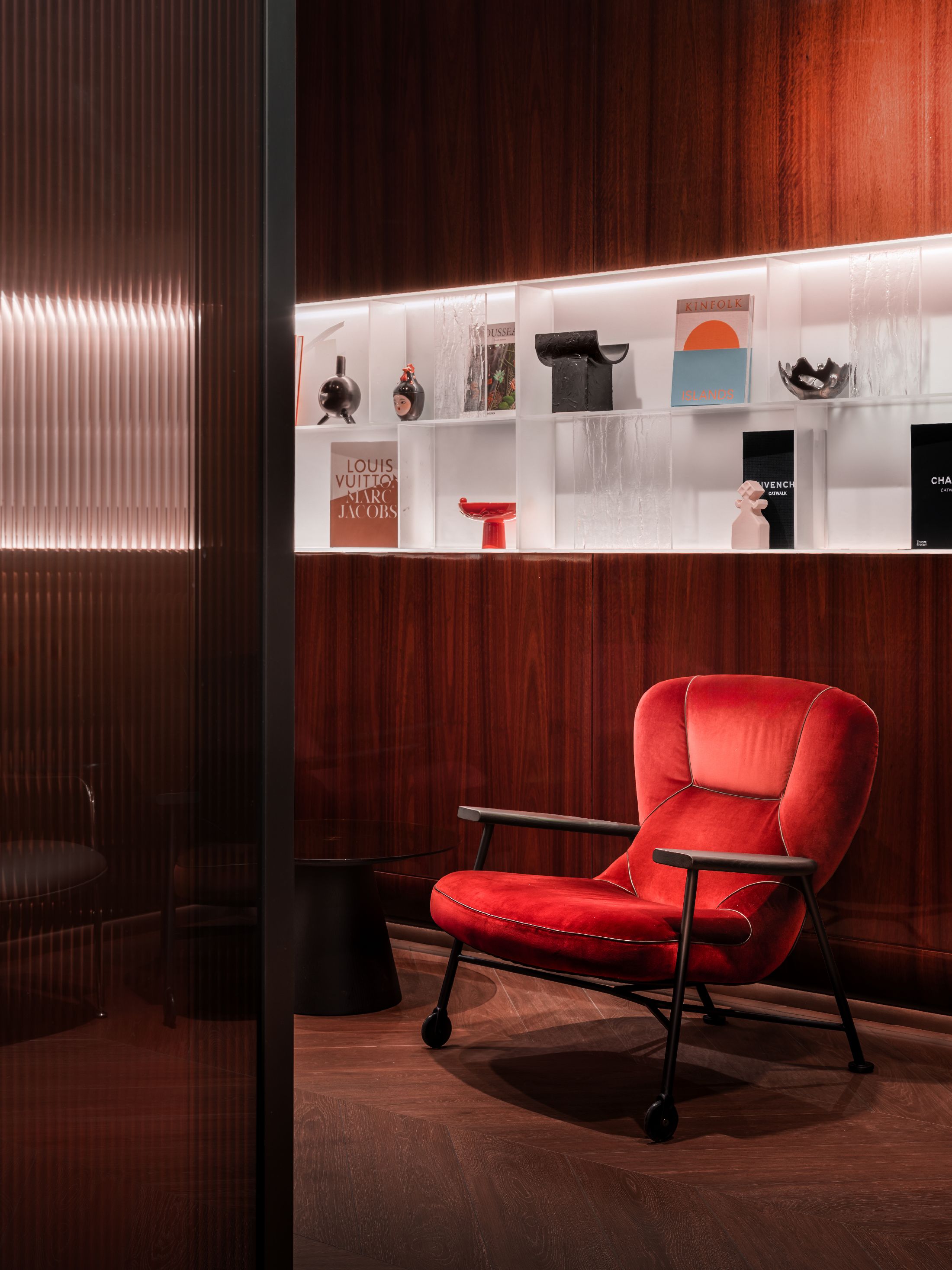 空间陈设兼顾美学、隐私与人文质感。手工质感玻璃发光书架打造出专属艺术图书馆,收录建筑、时尚、美食类典藏书籍与艺术摆件。同时甄选多款高端人体工学家具,Walter Knoll沙发、天鹅绒扶手椅、以及Norman Foster专为机场设计的Poltrona Frau胶囊单人椅,层次丰富且隐私度各异。多元细节相互交融,让这片候机空间不再只是简单的功能等候区,而是兼顾美学、私密、质感的高端休憩场域,为精致旅行者打造全方位的感官享受。