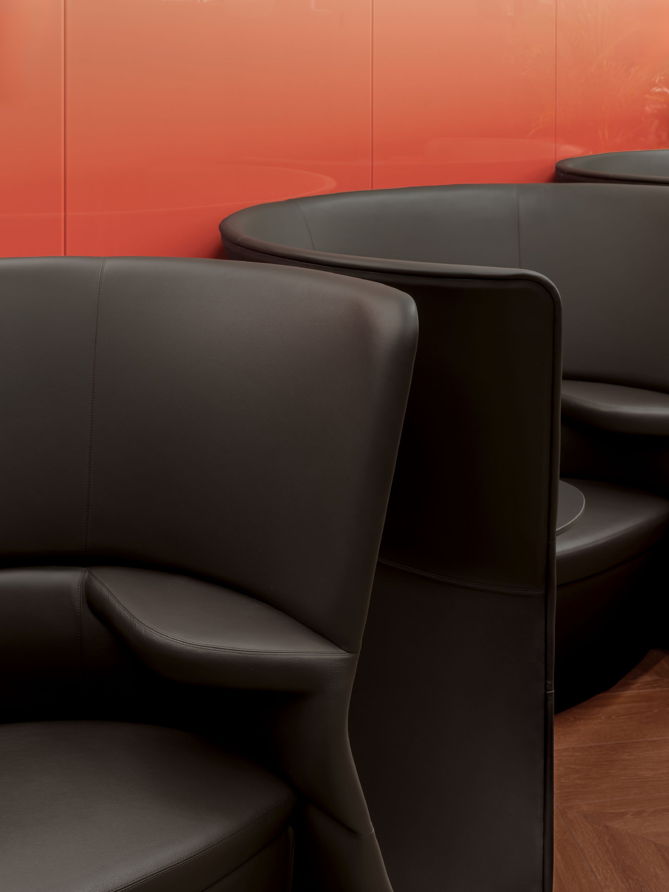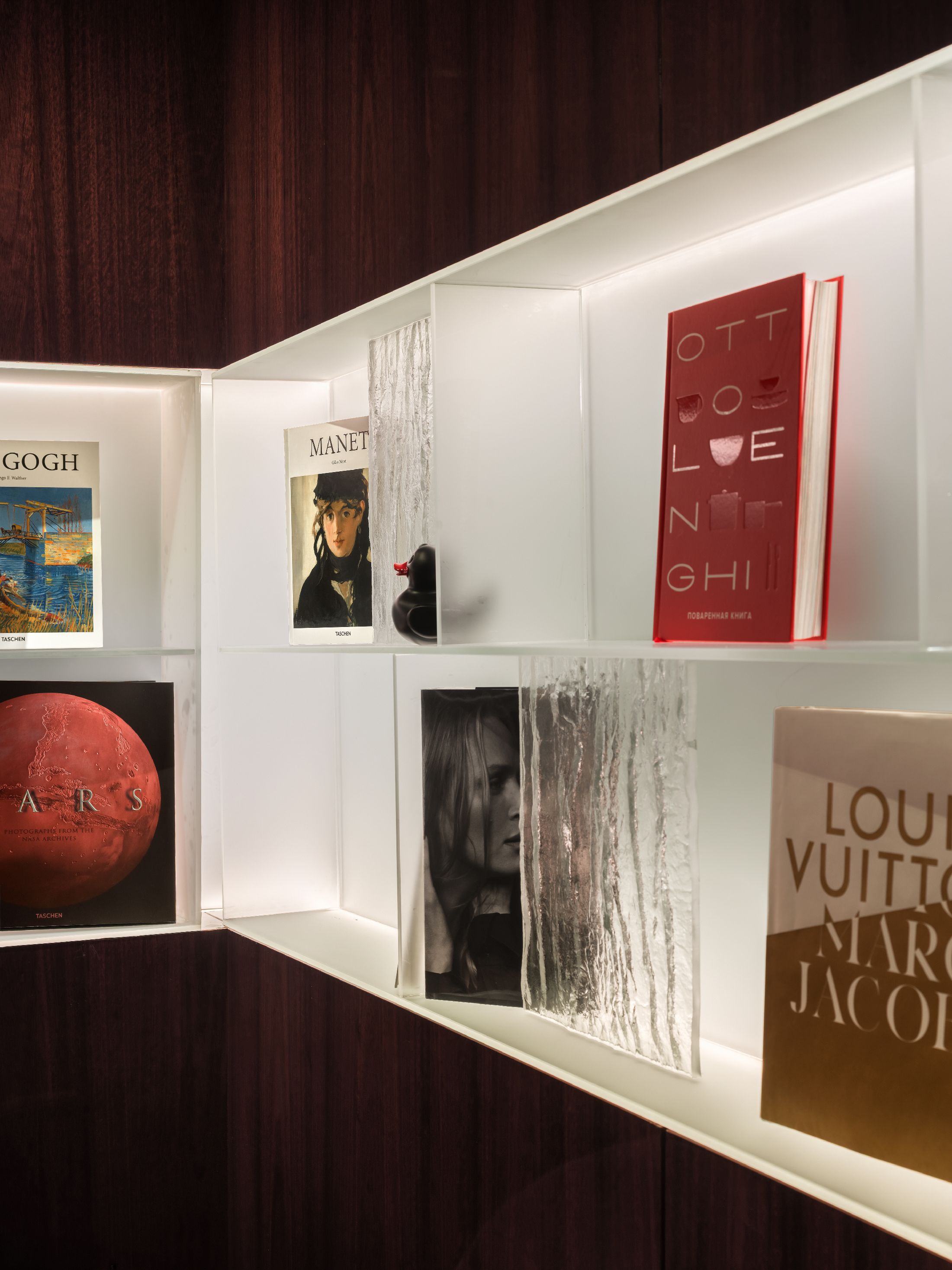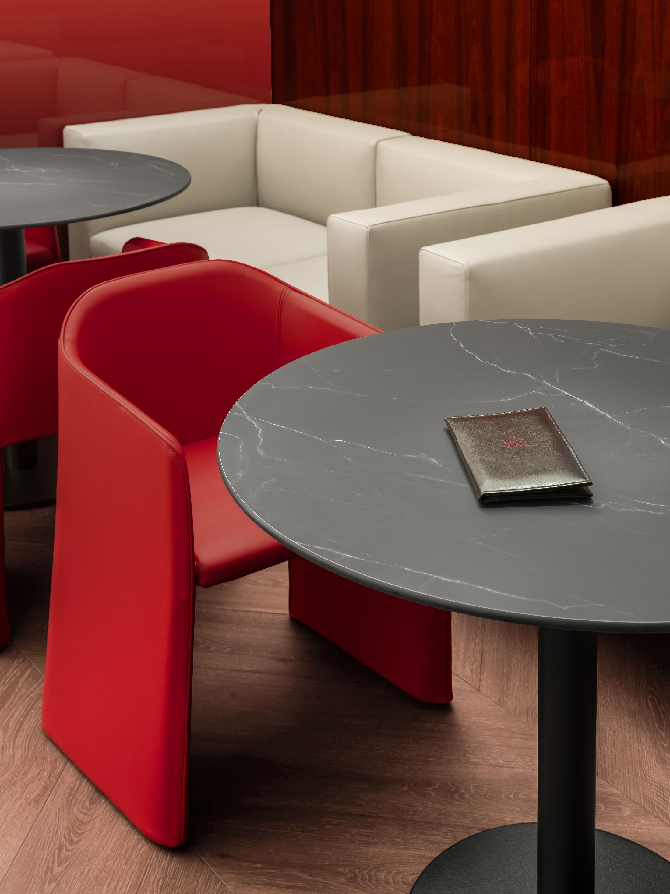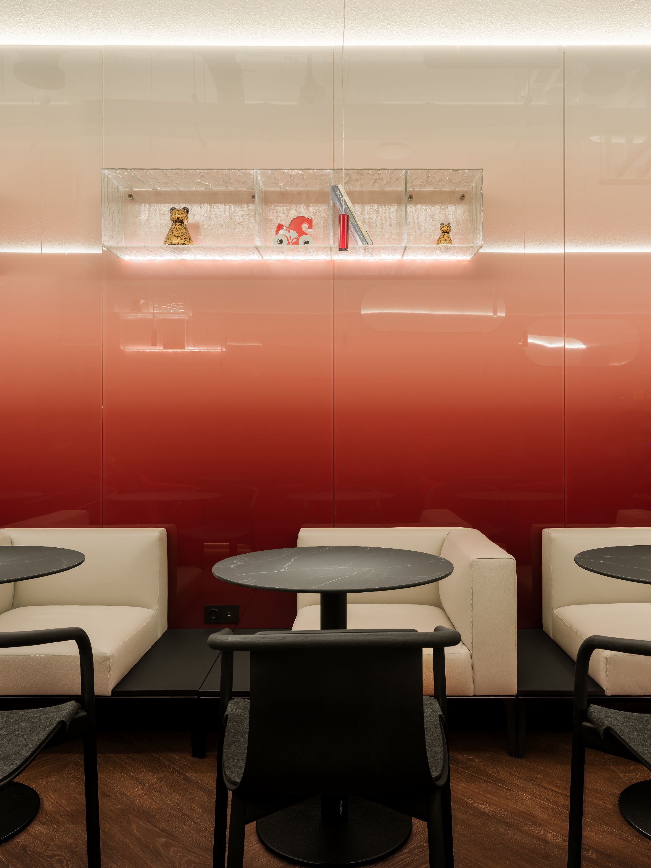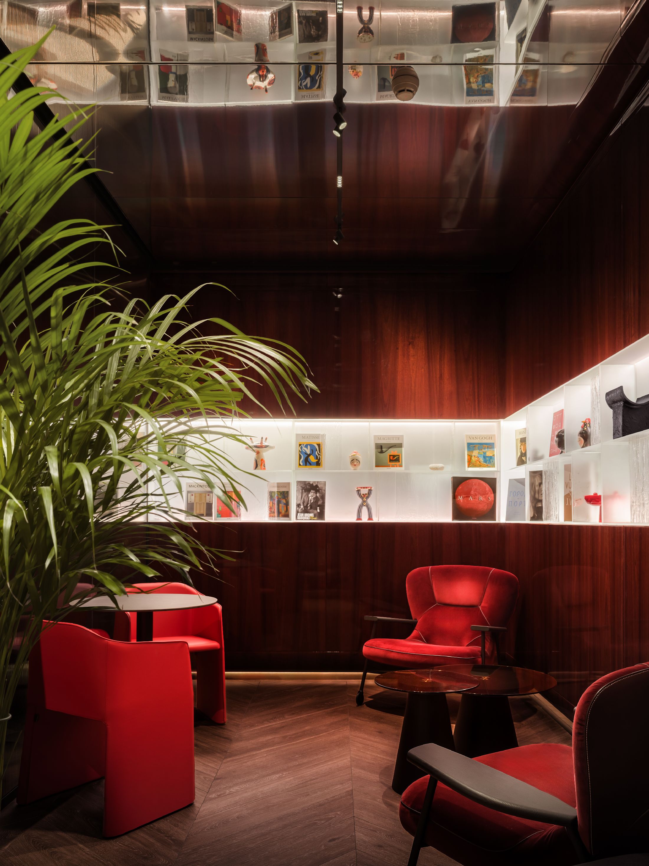 空间陈设兼顾美学、隐私与人文质感。手工质感玻璃发光书架打造出专属艺术图书馆,收录建筑、时尚、美食类典藏书籍与艺术摆件。同时甄选多款高端人体工学家具,Walter Knoll沙发、天鹅绒扶手椅、以及Norman Foster专为机场设计的Poltrona Frau胶囊单人椅,层次丰富且隐私度各异。多元细节相互交融,让这片候机空间不再只是简单的功能等候区,而是兼顾美学、私密、质感的高端休憩场域,为精致旅行者打造全方位的感官享受。