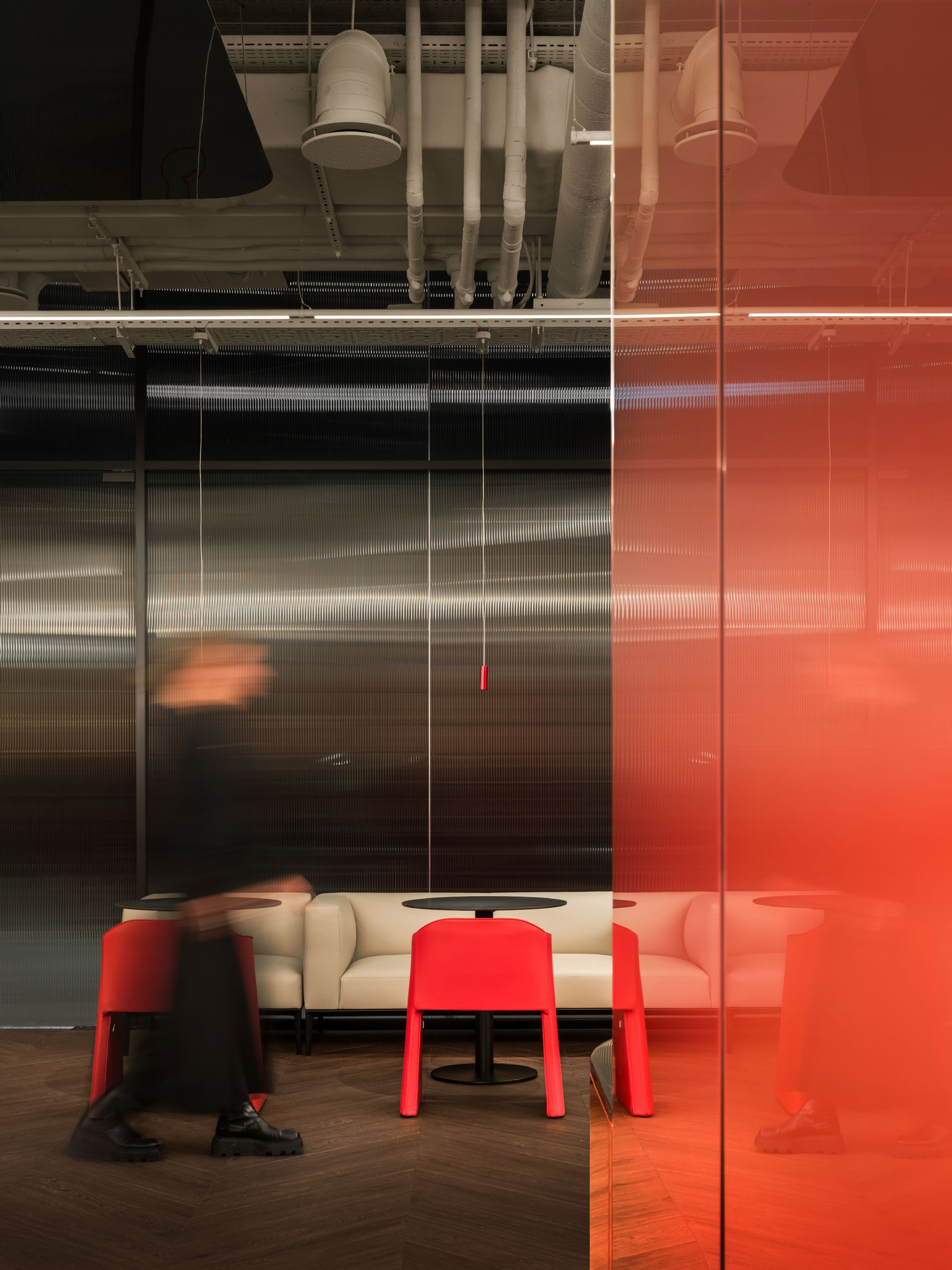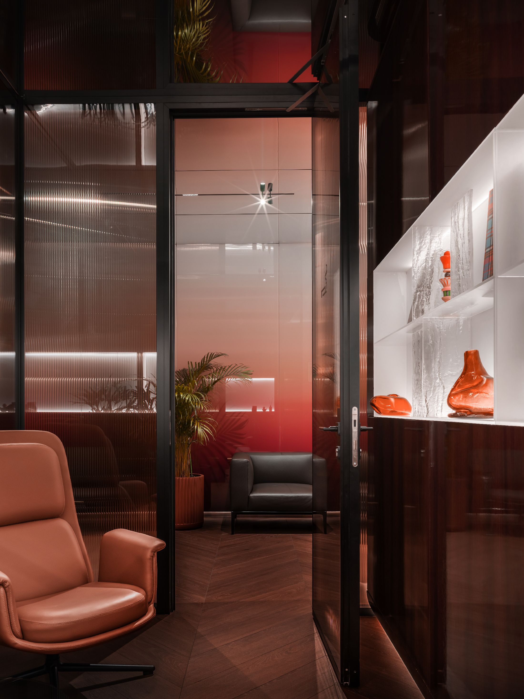 设计师通过丰富的灯光体系与材质搭配,巧妙化解空间尺寸局限,放大通透质感。开放式吊顶搭配漫射柔光,奠定整体柔和的光线基调;Pedrali定制灯具、落地吊灯、踢脚线氛围灯与Tom Dixon桌面台灯分层布光,冷暖交织、层次丰富。结合镜面、钢化玻璃、波纹磨砂玻璃与金属面板等反光材质,在视觉上拉伸空间,搭配吸音石膏肌理吊顶,兼顾通透颜值与静谧舒适的环境氛围。