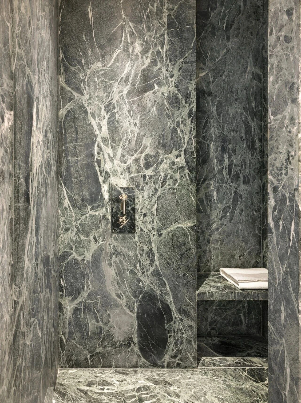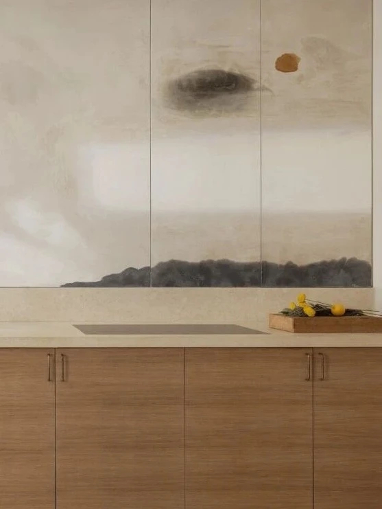 整套空间的层次,全部依托材质的碰撞与衔接呈现。空间以米色石材作为基底,统一铺陈于地面、门框、壁炉以及厨卫区域,细腻温润的天然肌理,奠定安静、素雅的空间基调。在此基础上,设计师巧用特色石材点缀细节,卫浴的绿色阿尔卑斯大理石、厨房的极光角砾岩,自带独一无二的自然纹路与深浅色泽,为素净的极简空间注入自然变化与精致细节。